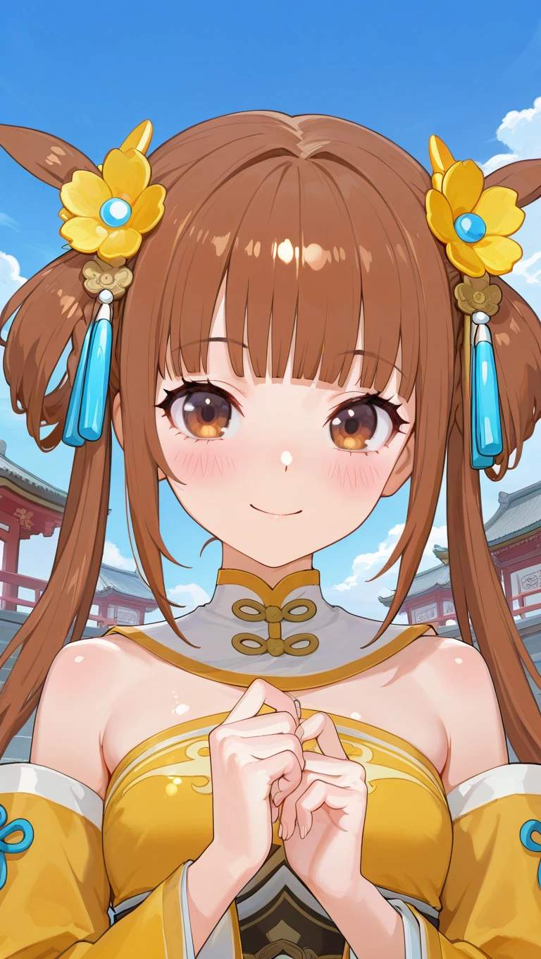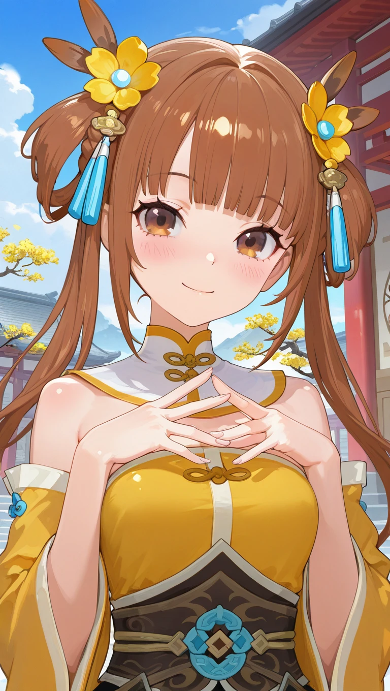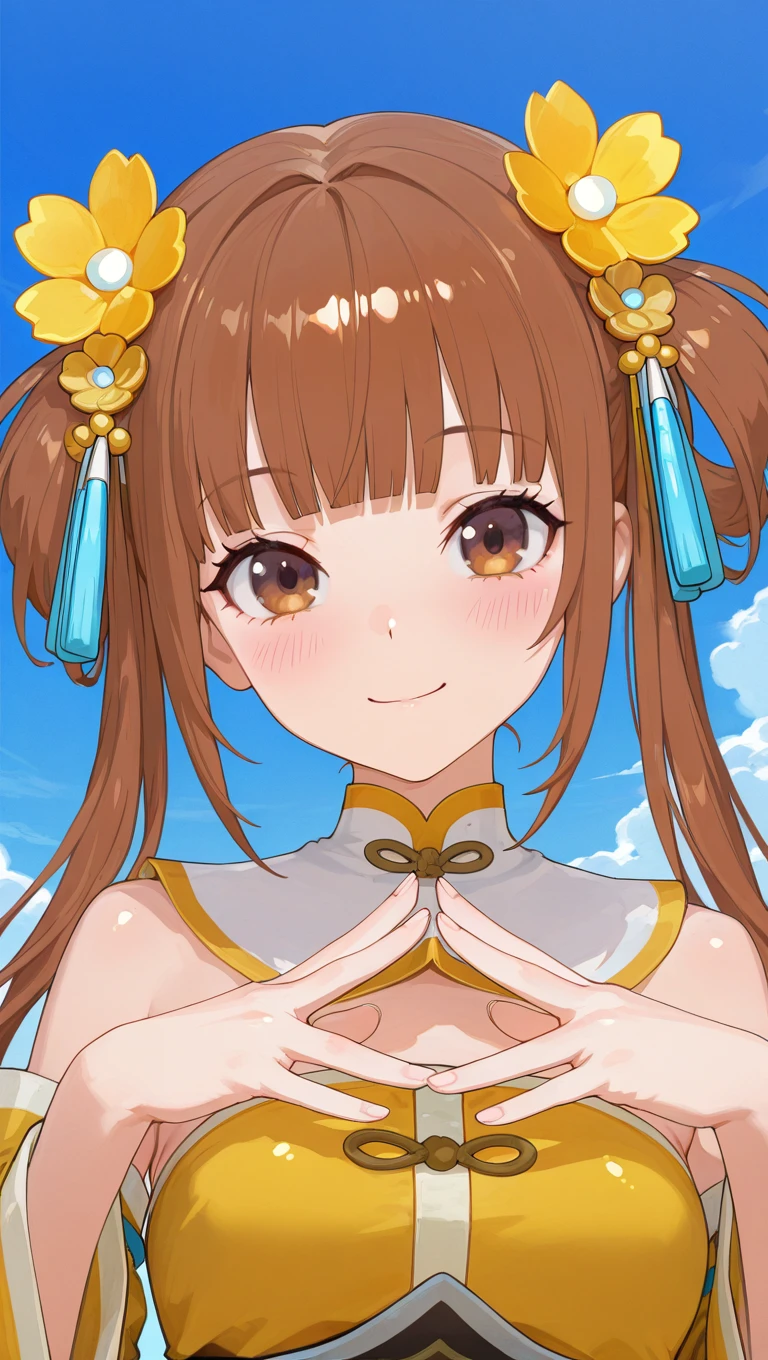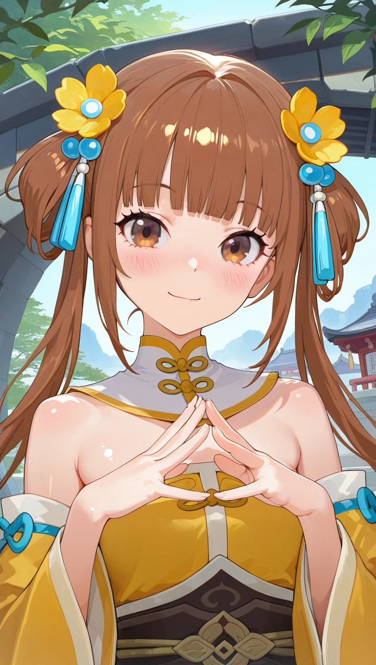 long hair,brown hair,hair rings,twintails,hair ornament,hair flower,yellow flower,blunt bangs,brown eyes