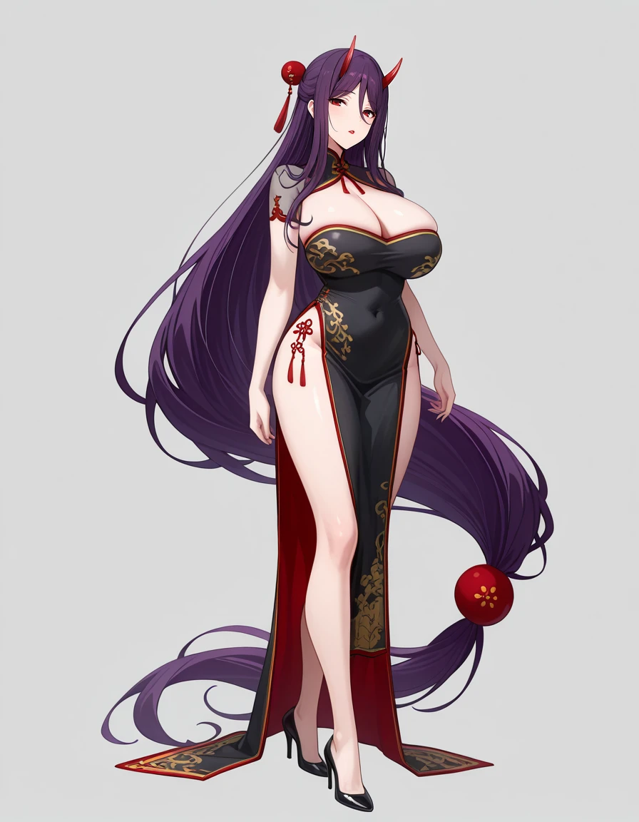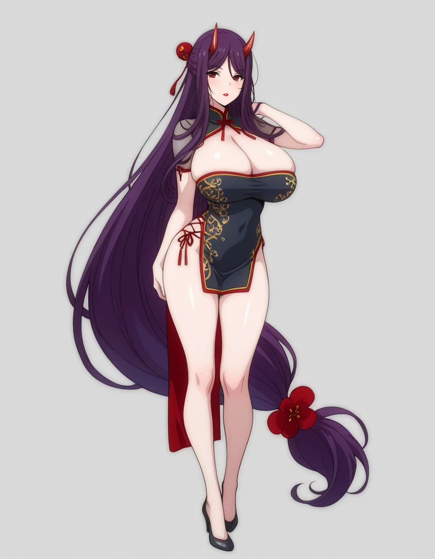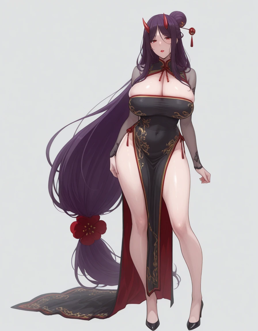 mai_mmyasha,mature_female,hair_bun,absurdly_long_hair,low-tied_long_hair,purple_hair,red_eyes,red_horns,lipstick,large_breasts,cleavage,hair_ornament,hair_flower,chinese_clothes,high_heels,black_footwearRecommend preferred Strength: 0.7~1.