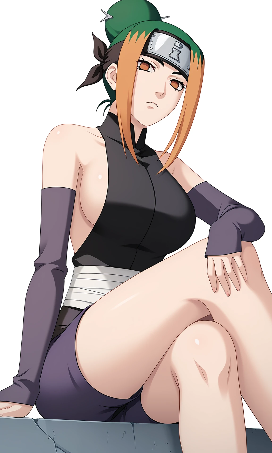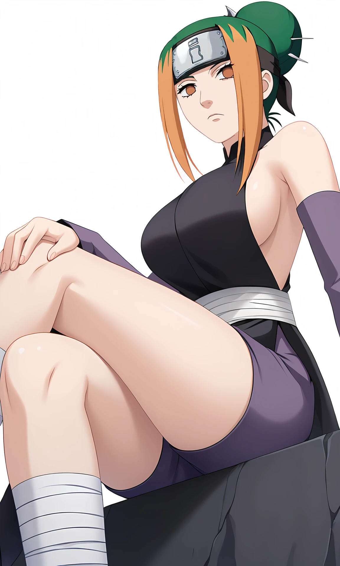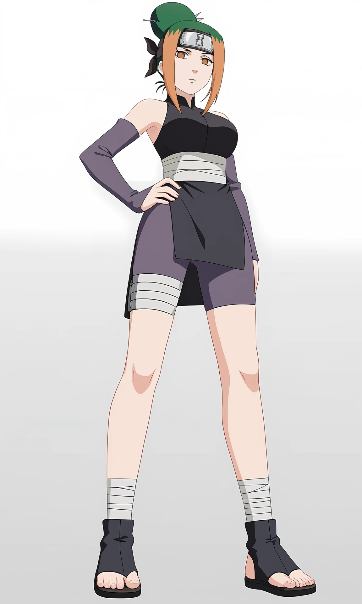 pakurare, 1girl, looking at viewer, orange eyes, forehead protector, two-tone hair, orange hair, green hair, single hair bun, black dress, detached sleeves, bare shoulders, purple shorts, bandaged waist, bandaged legs, toeless footwear, sideboob, breasts,