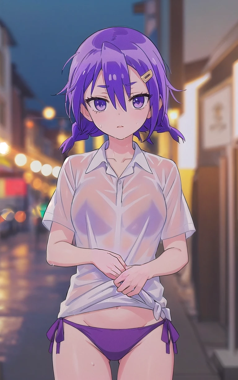 1girl, purple hair, purple eyes, hairclip, long hair, hair between eyes, breasts, small breasts, collarbone,