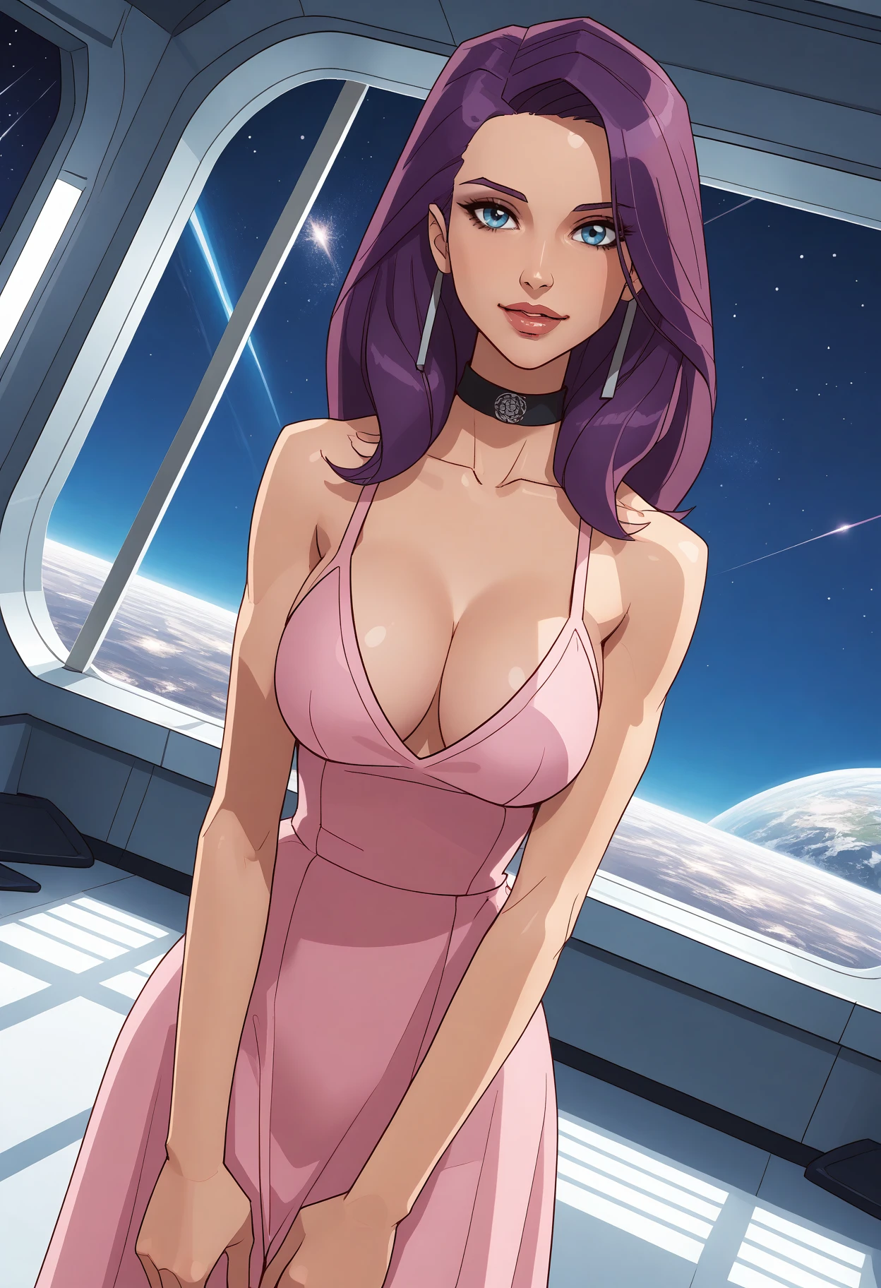 outfit tags: makeup, navel, midriff, jewelry, earrings, dress, cleavage, clothing cutout, cleavage cutout, gloves, fingerless gloves,underwear, panties, pink panties,