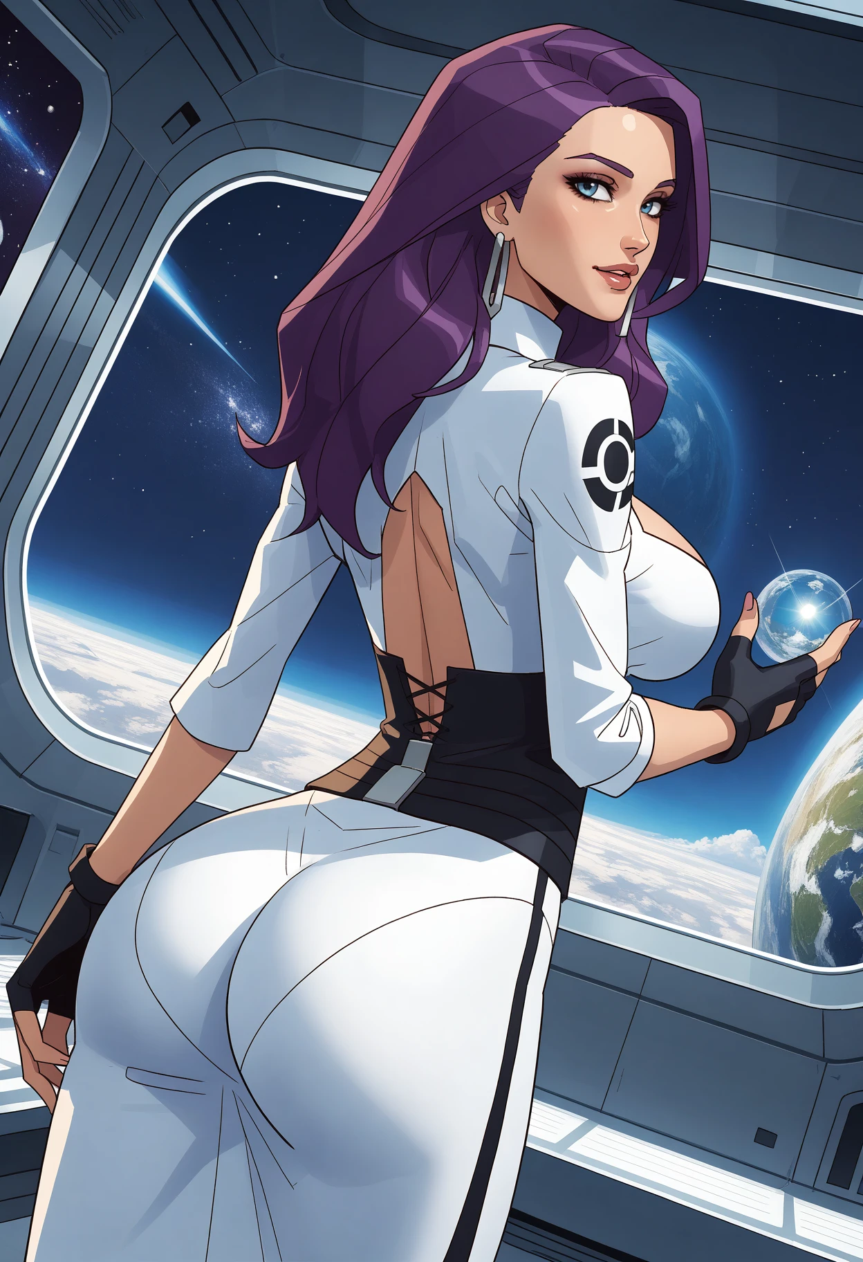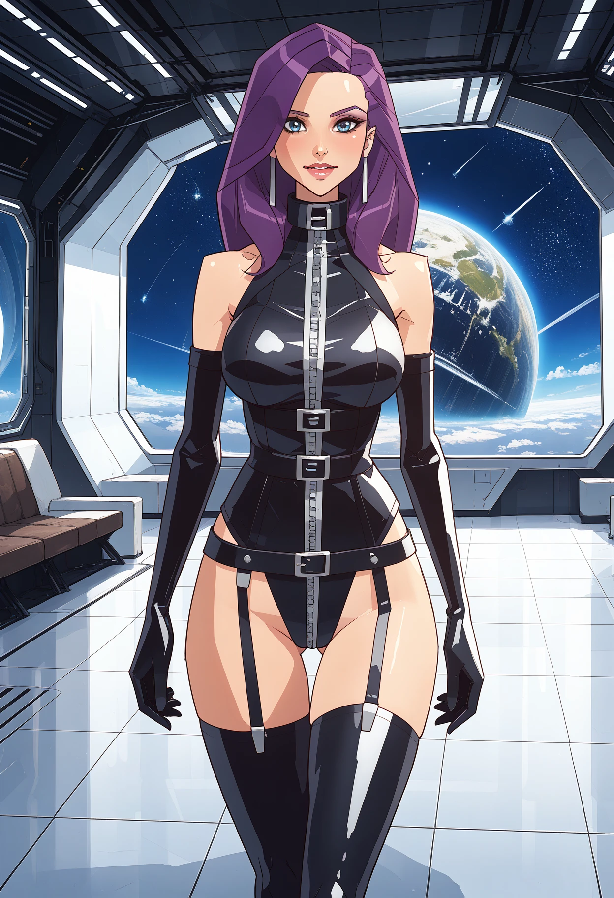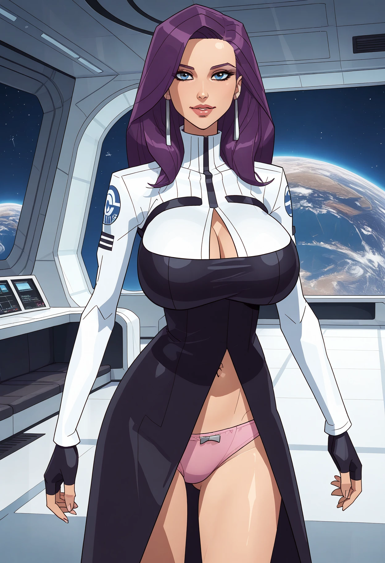 recommended tags: 1girl, solo, blue eyes, long hair, purple hair, breasts, huge breasts, lips,