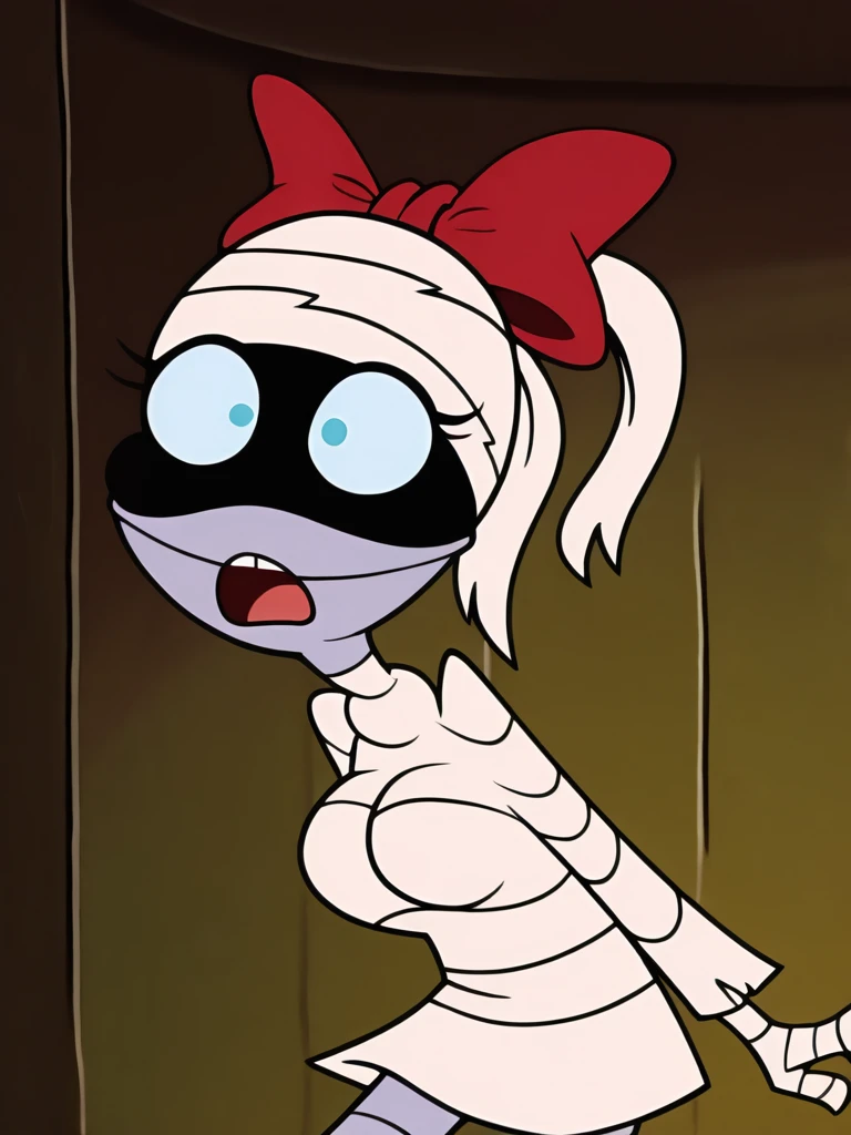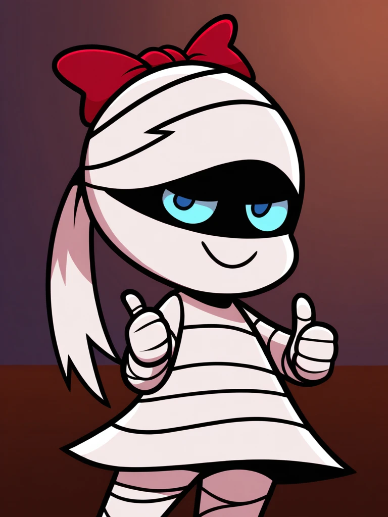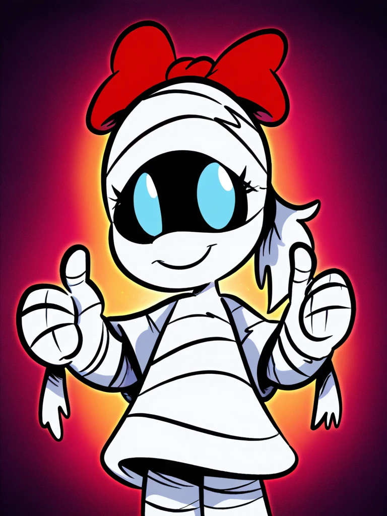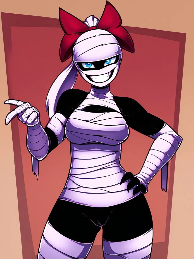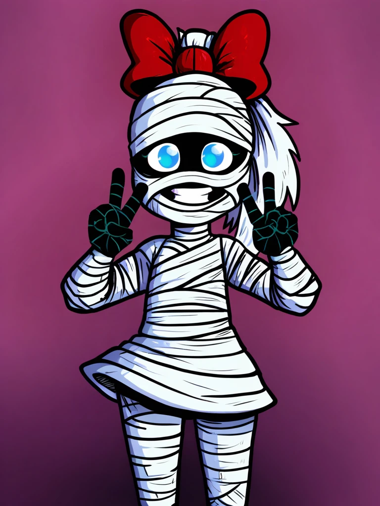 Prompt: tanisil, (mummy, monster girl, bandaged face, white hair, bandaged head, white hair, ponytail), monster girl, colored skin, black skin, bandages, bandaged arms, bandaged legs, bandaged head, bow, hair bow, red bow, blue eyes