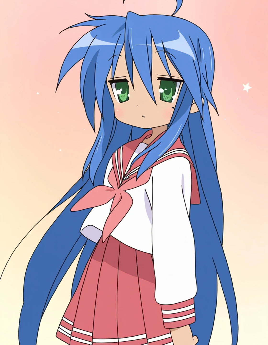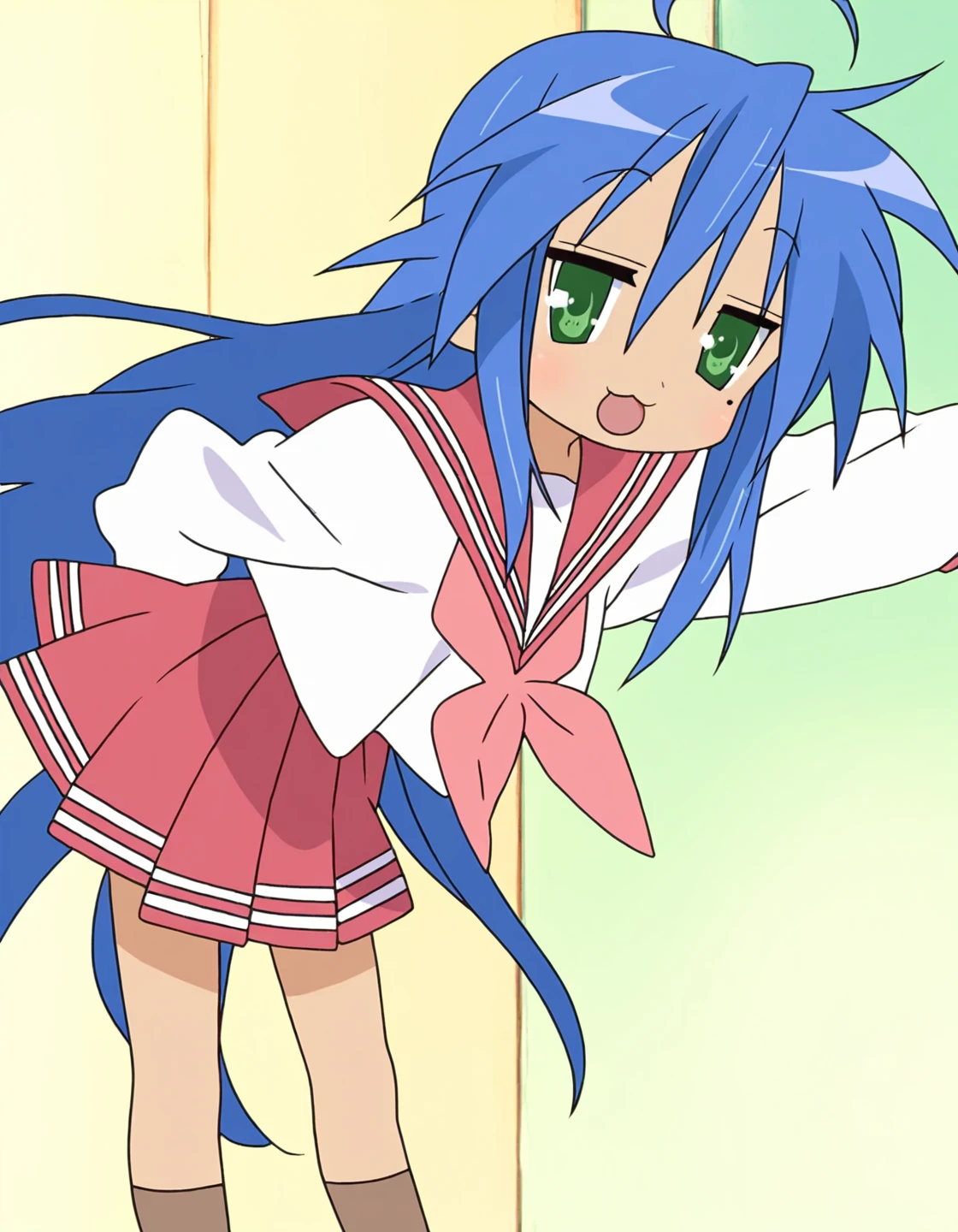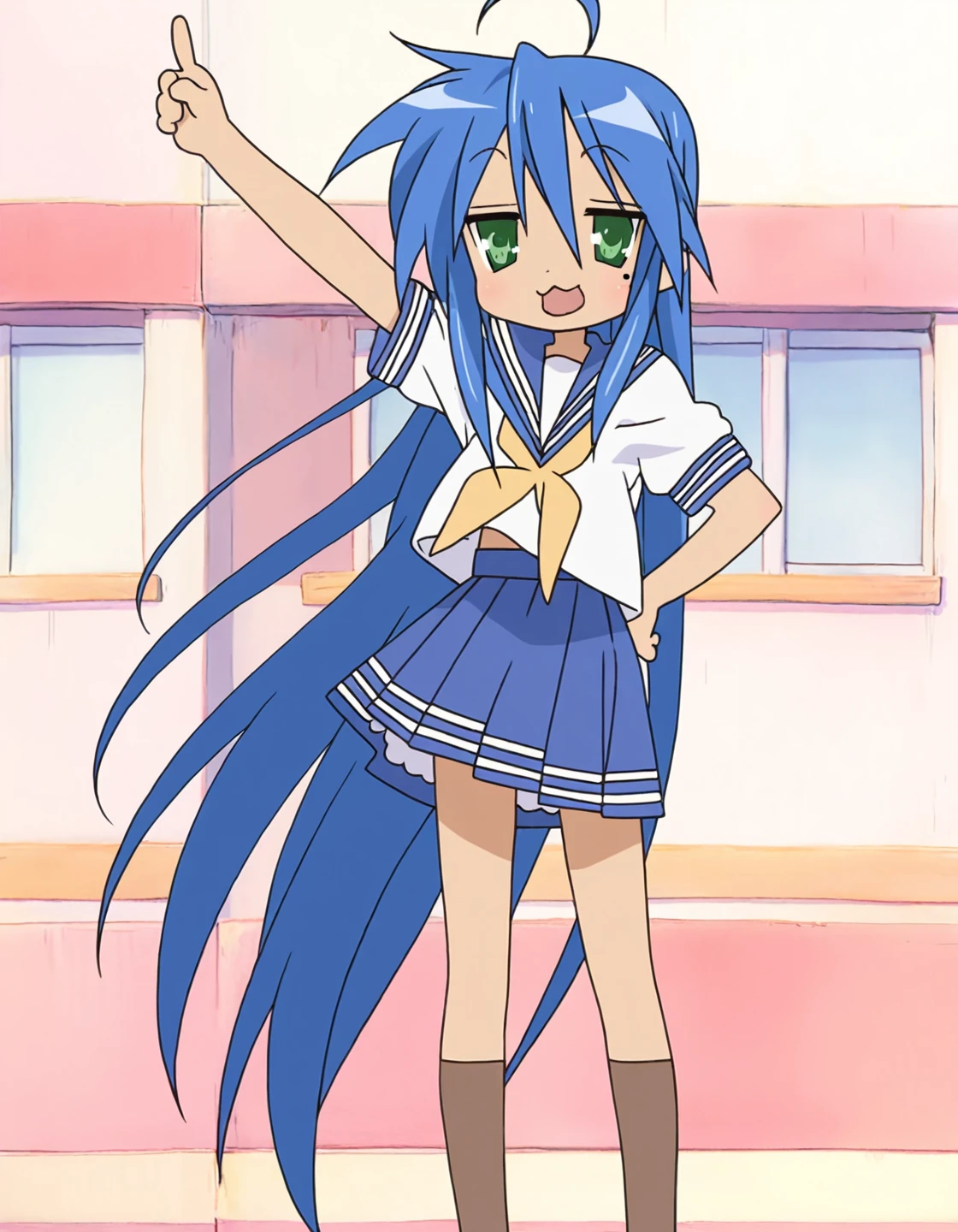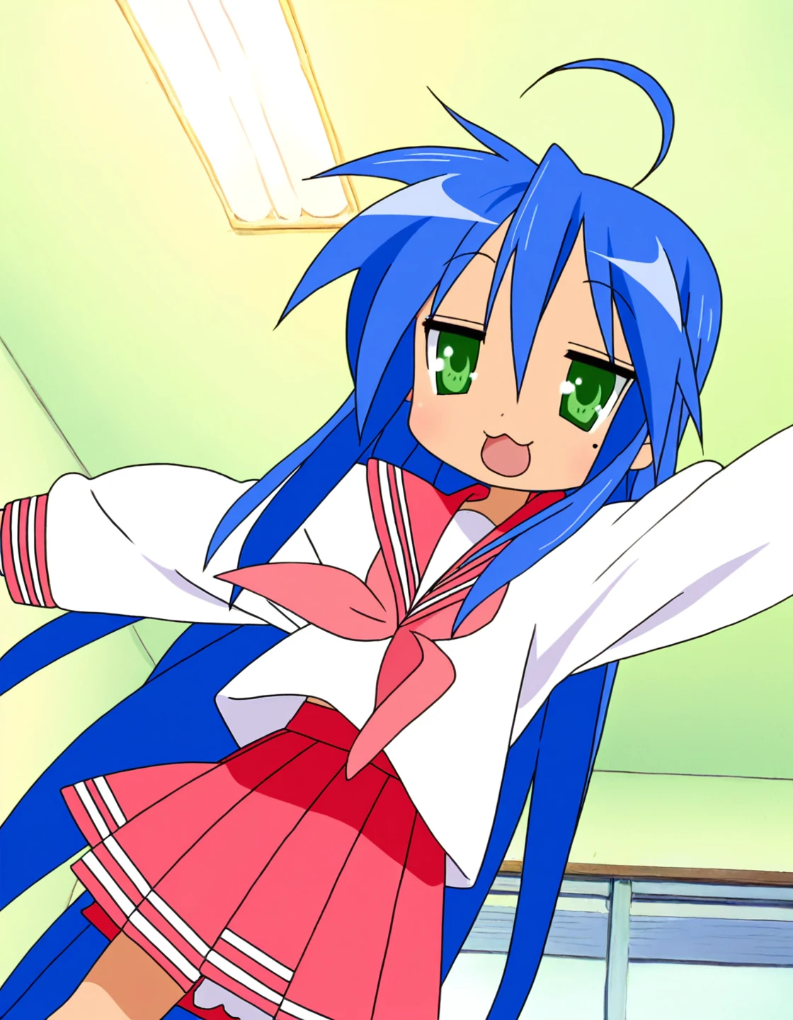 konata_izumi, lucky star, blue hair, very long hair, knee-length hair, ahoge, green eyes, mole under eye, anime screencap,, white sailor shirt, long sleeves, pink sailor collar, pink skirt, red neckerchief,
