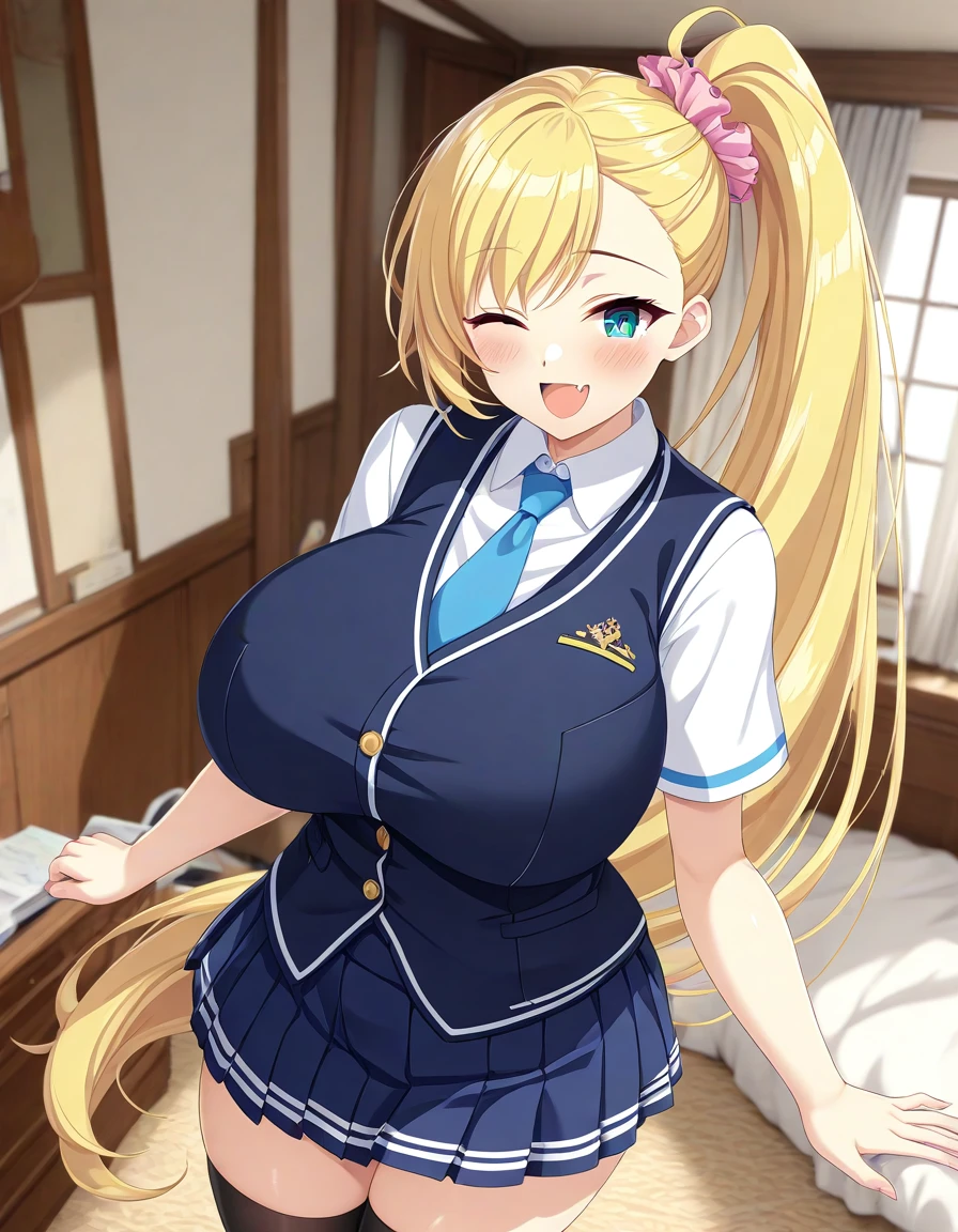 Basic:Yui Hakari, large breasts, green eyes, blonde hair, long hair, bang, fang,