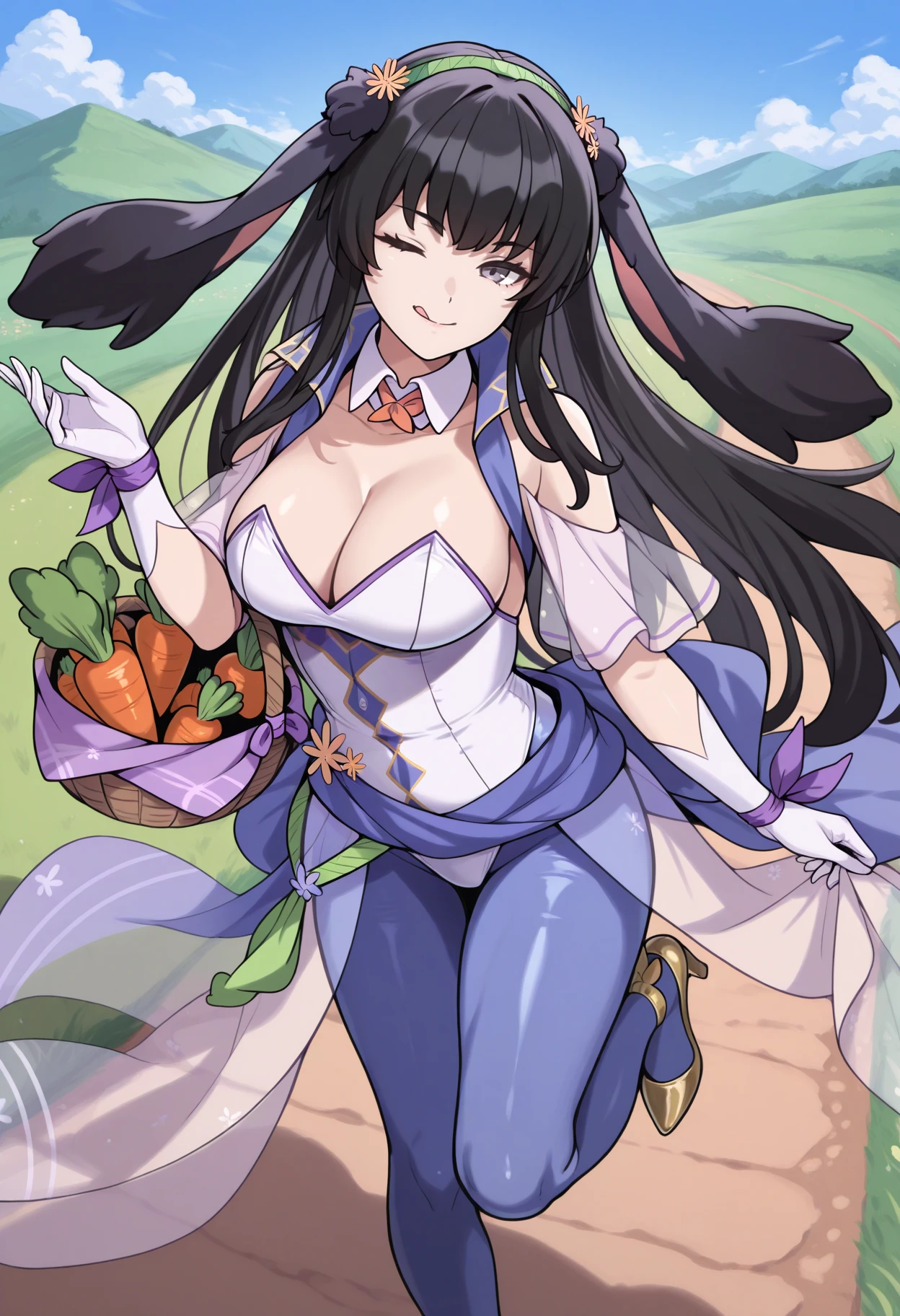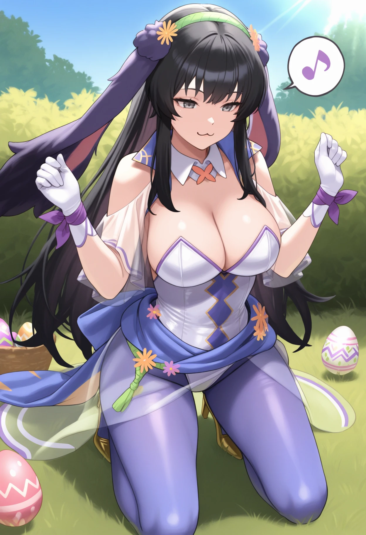 Spring Reveries (FEH): sprKarla, black hair, long hair, hair flower, lop rabbit ears, green hairband, grey eyes, detached collar, large breasts, cleavage, strapless leotard, white leotard, short sleeves, shoulder cutout, see-through sleeves, white gloves, purple wrist ribbon, blue sarong, see-through skirt, blue pantyhose, high heels, gold footwear