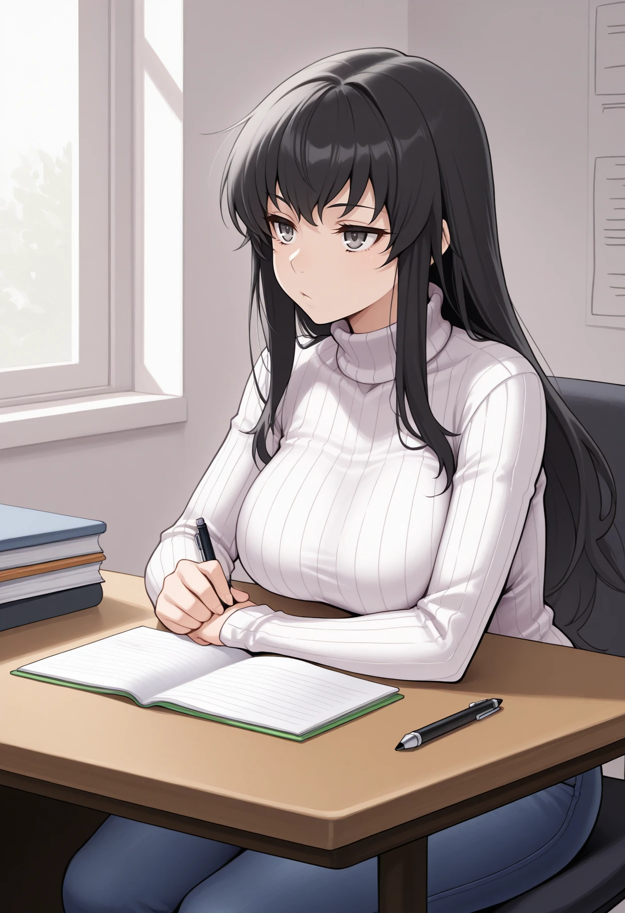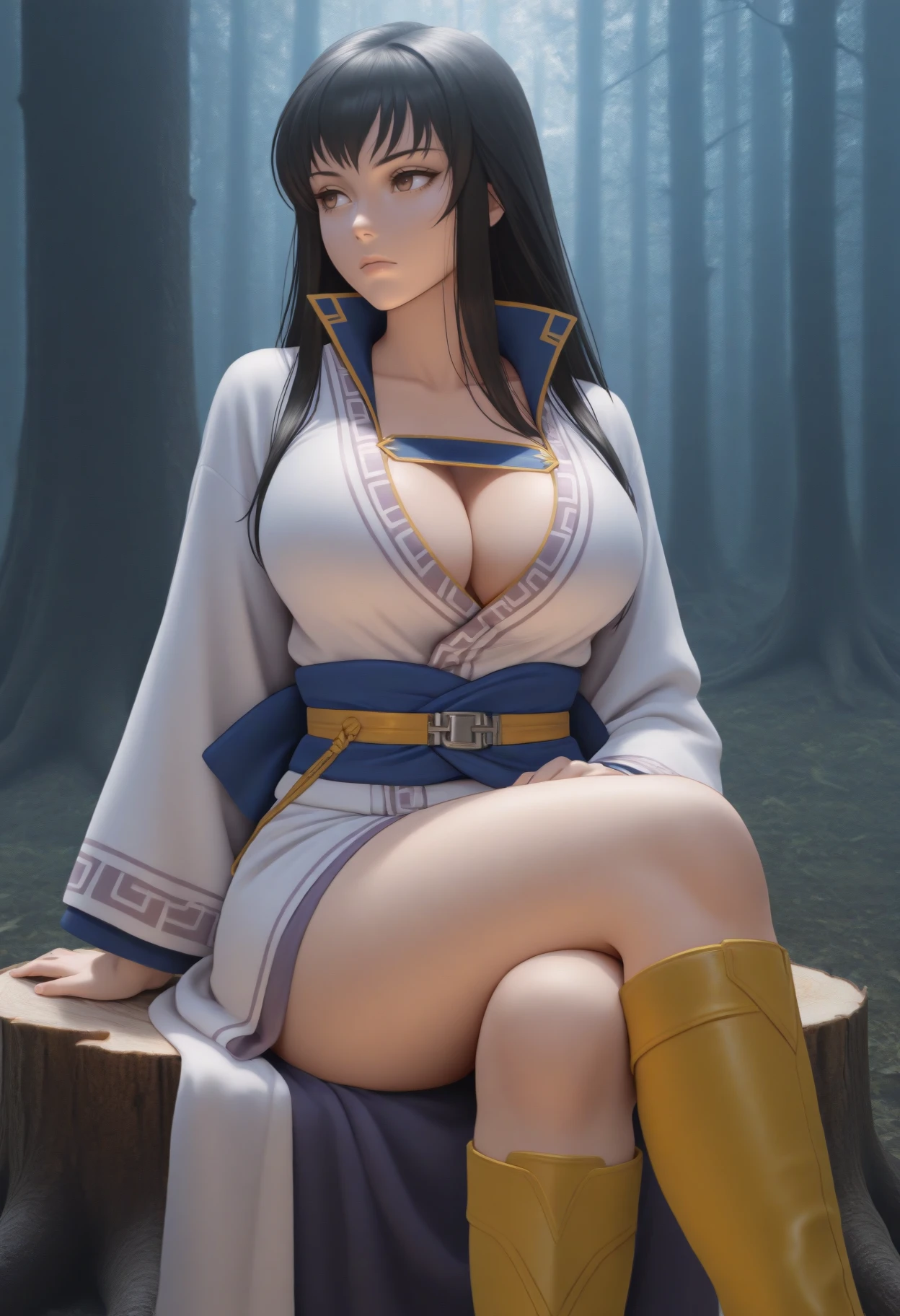 Default appearance: defKarla, black hair, long hair, brown eyes, white kimono, cleavage, large breasts, long sleeves, chest strap, blue obi, side slit, knee boots, yellow footwear