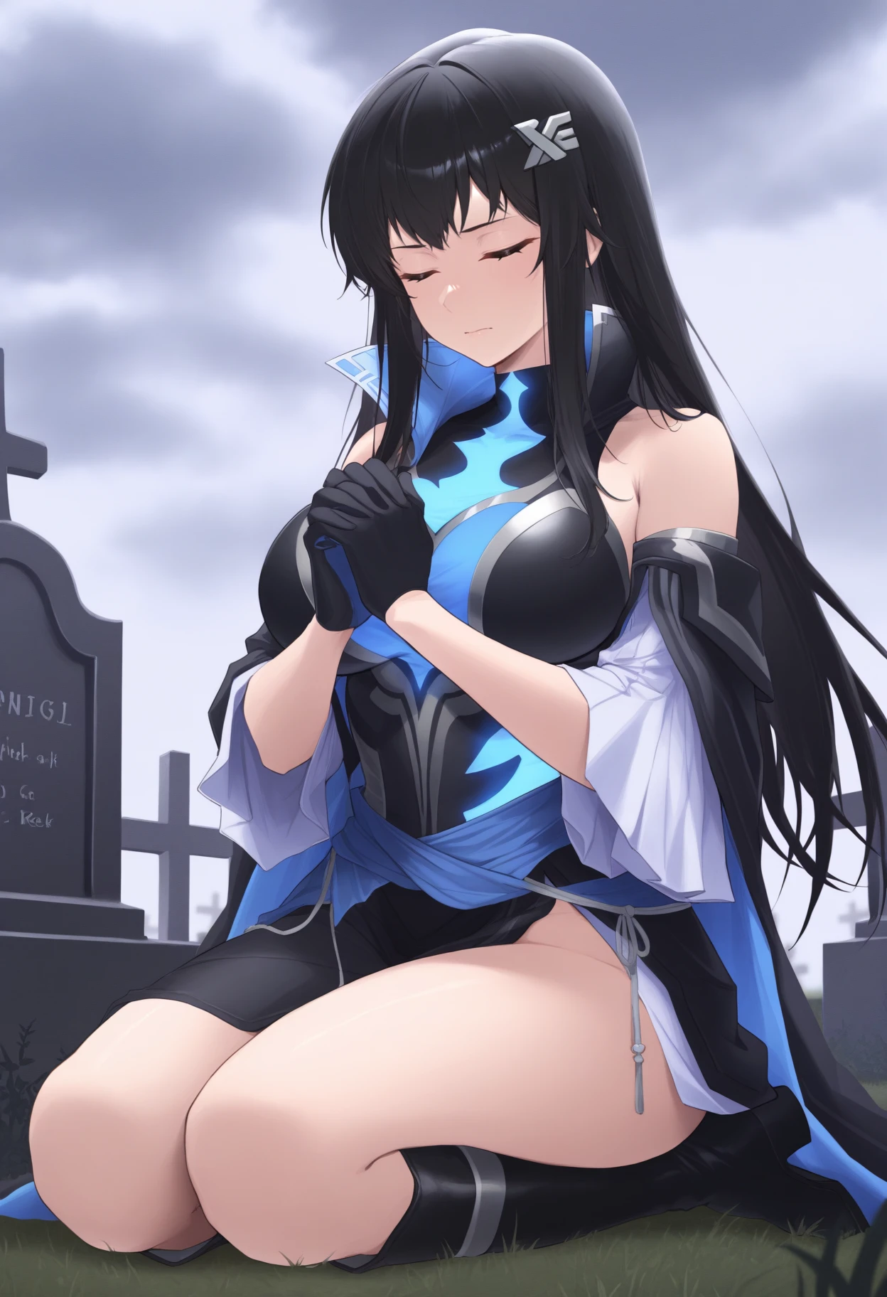 Resplendent (FEH): resK4r, black hair, long hair, grey eyes, hairclip, two-tone dress, black dress, blue dress, turtleneck dress, high collar, detached sleeves, wide sleeves, layered sleeves, black gloves, blue sash, knee boots, black footwear