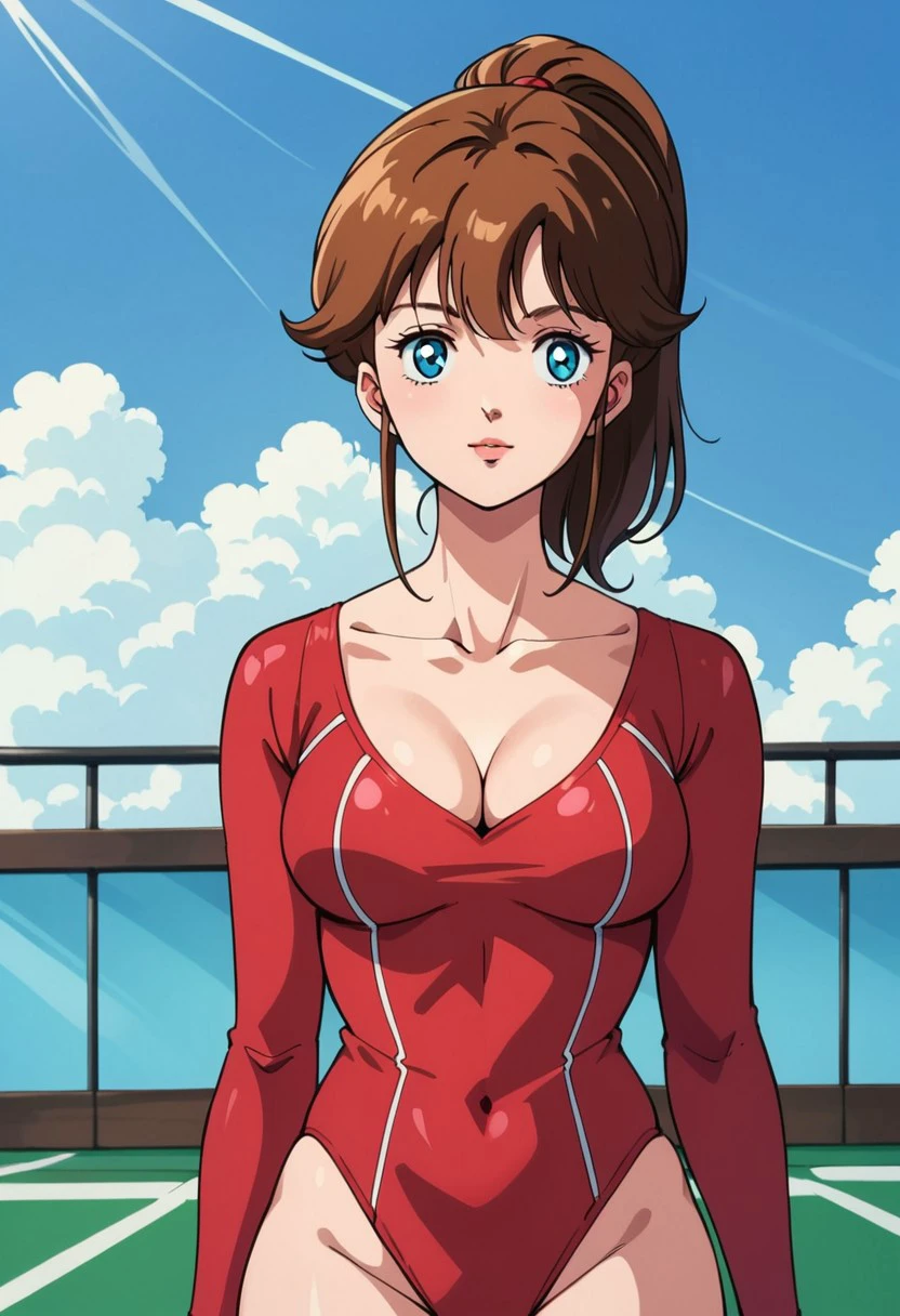 haki_leotard , red leotard, rhythmic_gymnastics, brown ponytail