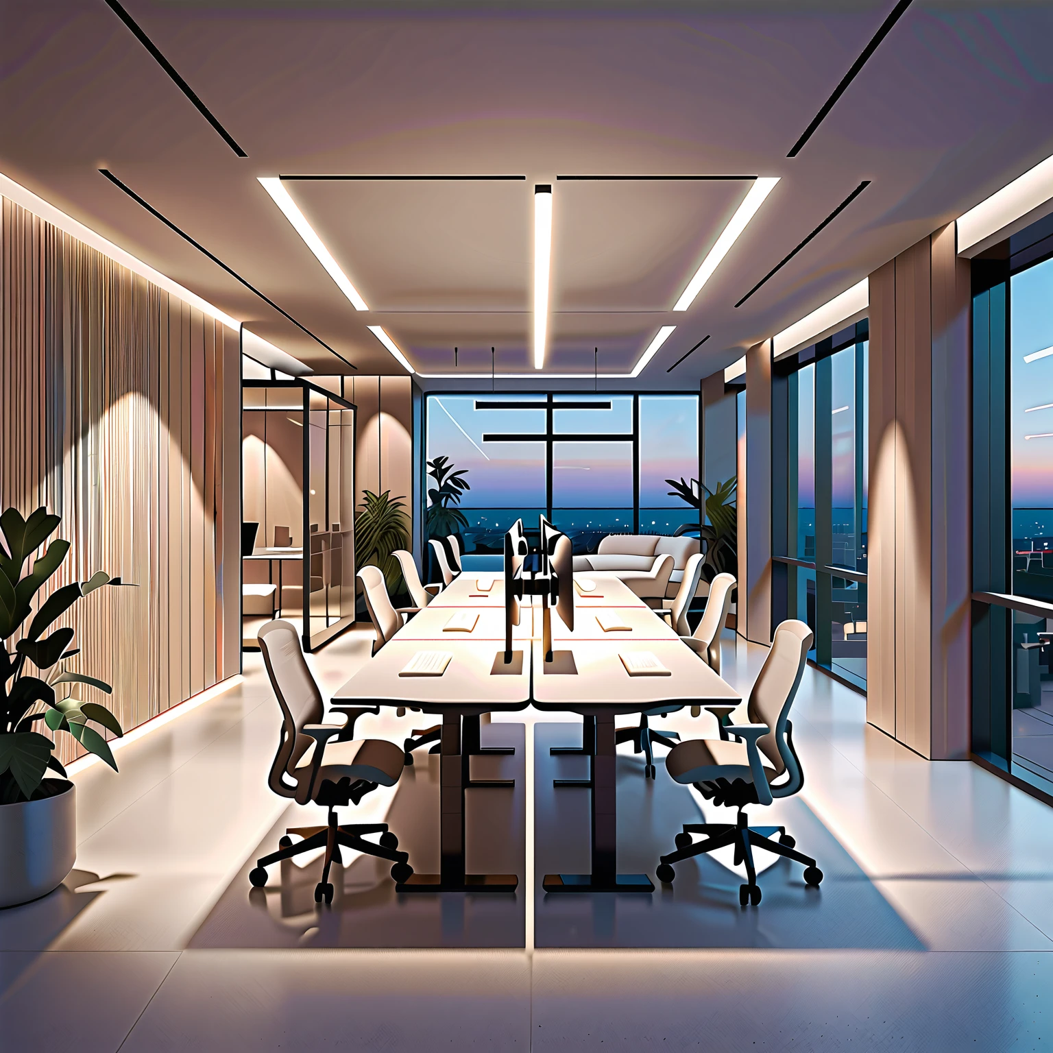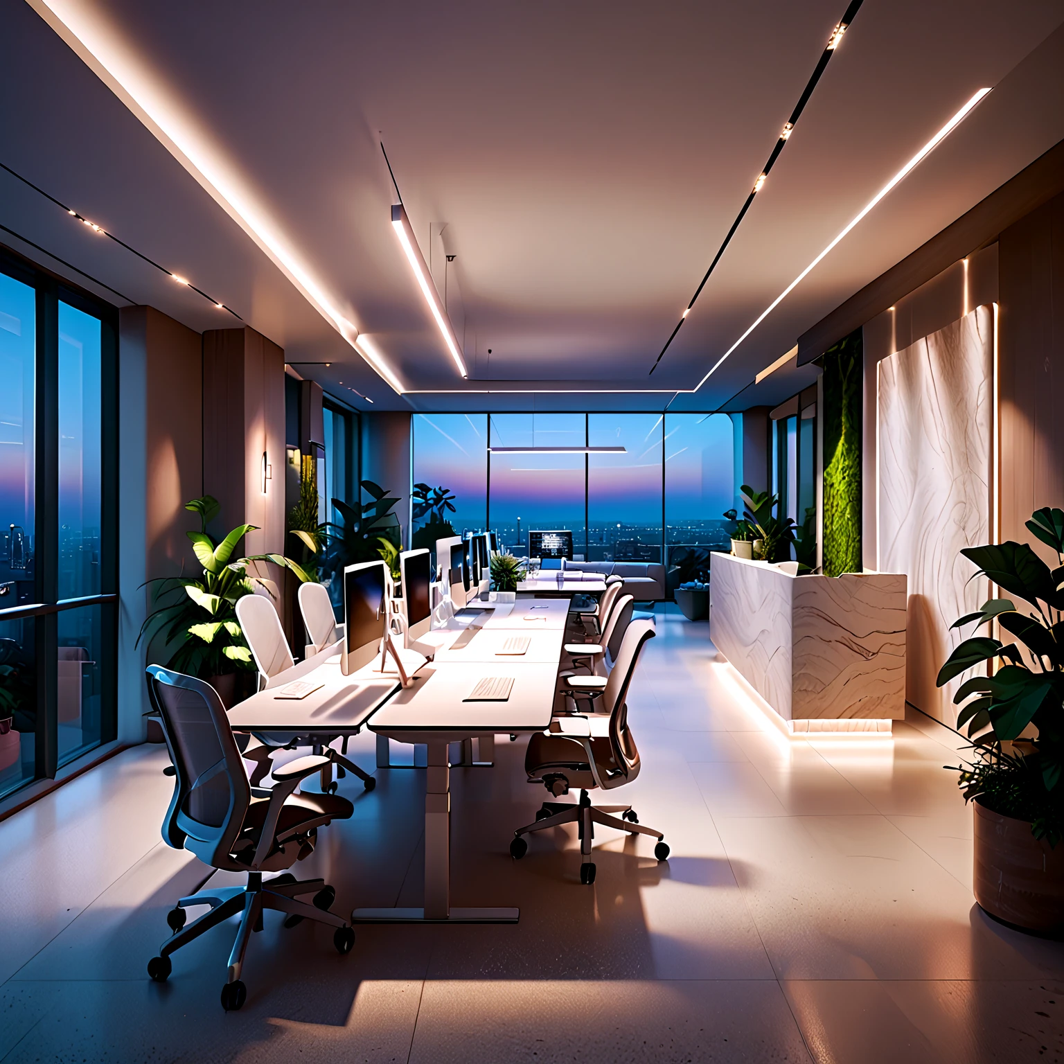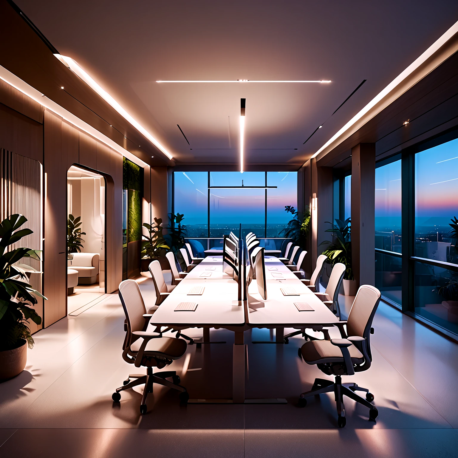 modern_workspace, no humans, scenery, window, evening, indoors, chair, table, plant, evening_lighting