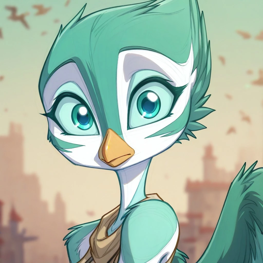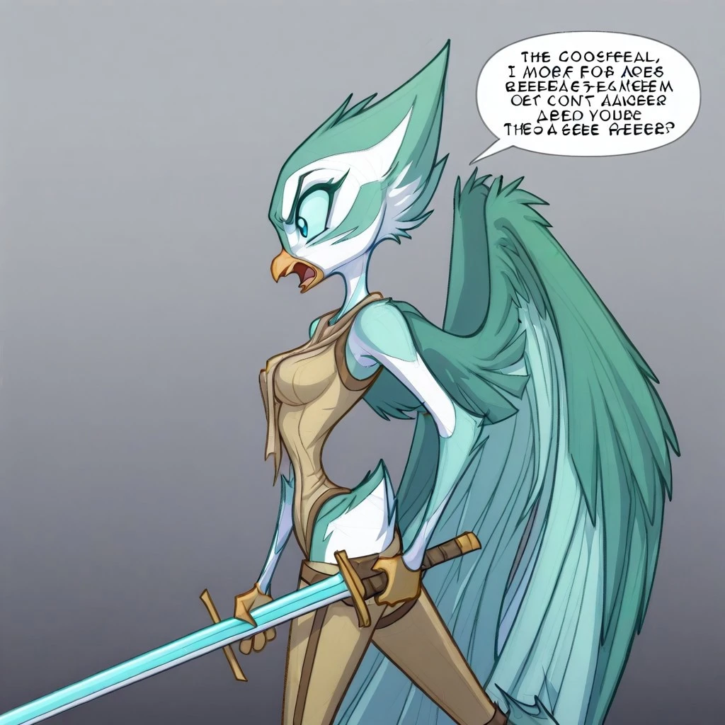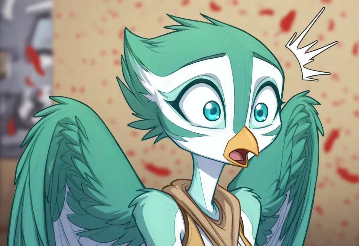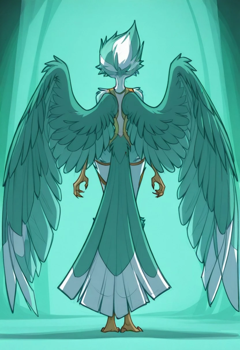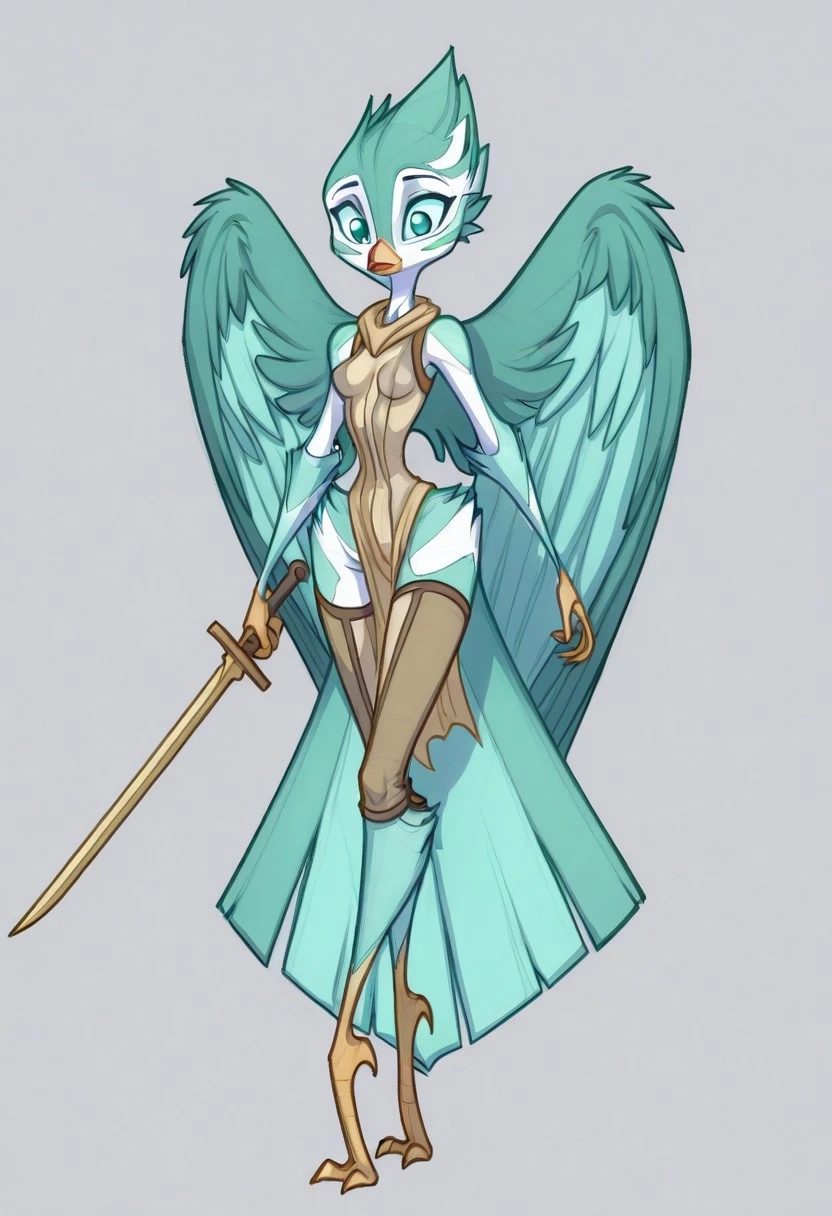 fae_dk, blue eyes, 1girl, solo, wings, furry, furry female, green fur, beak, bird tail, bird, feathered wings,