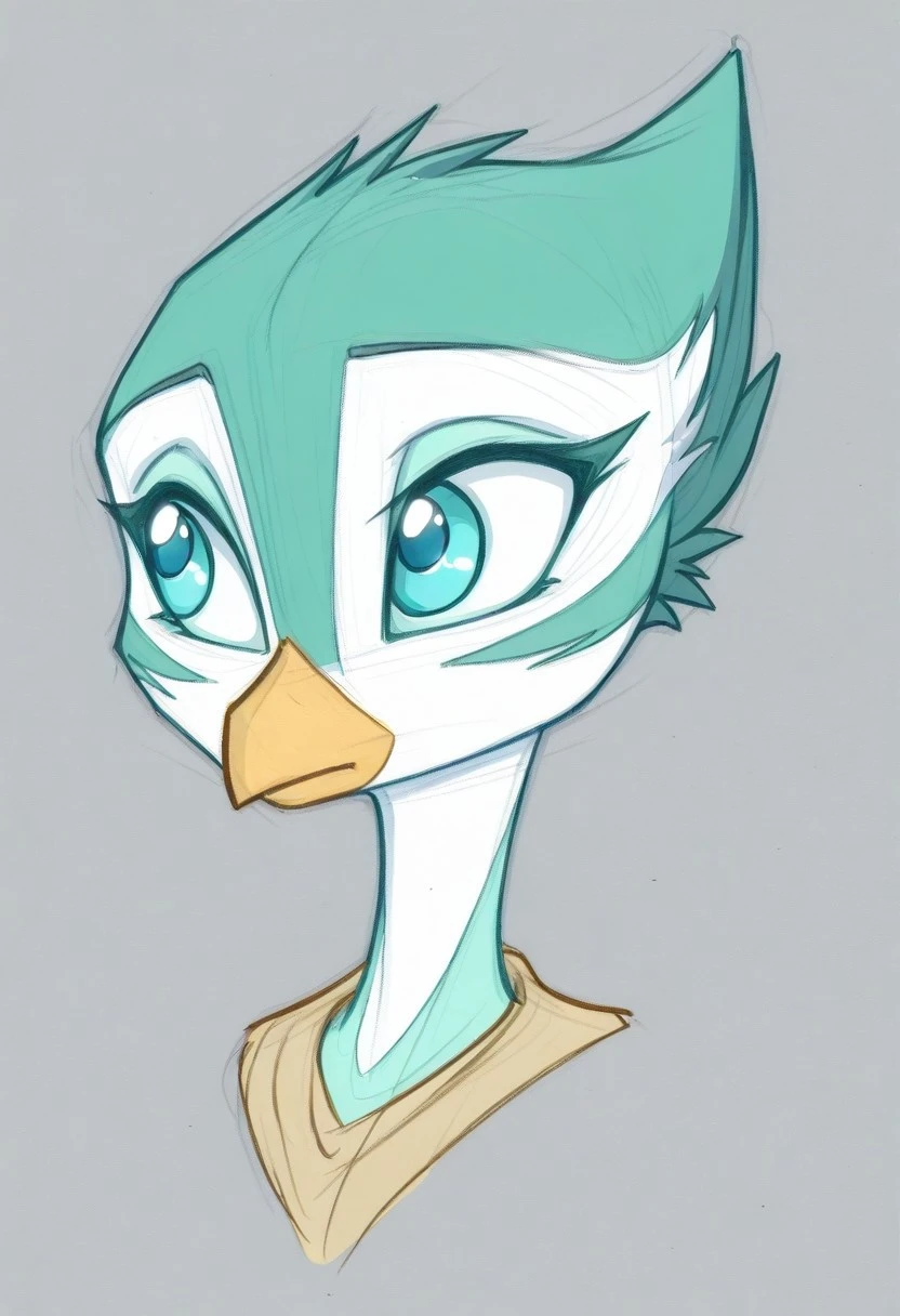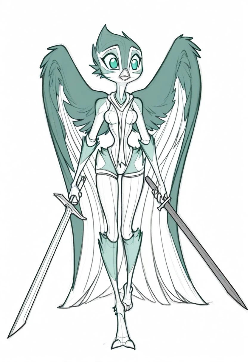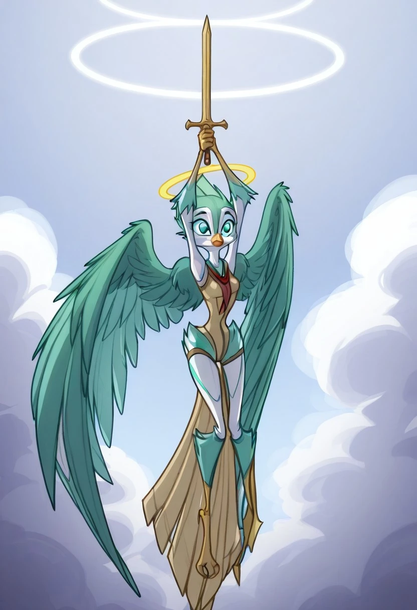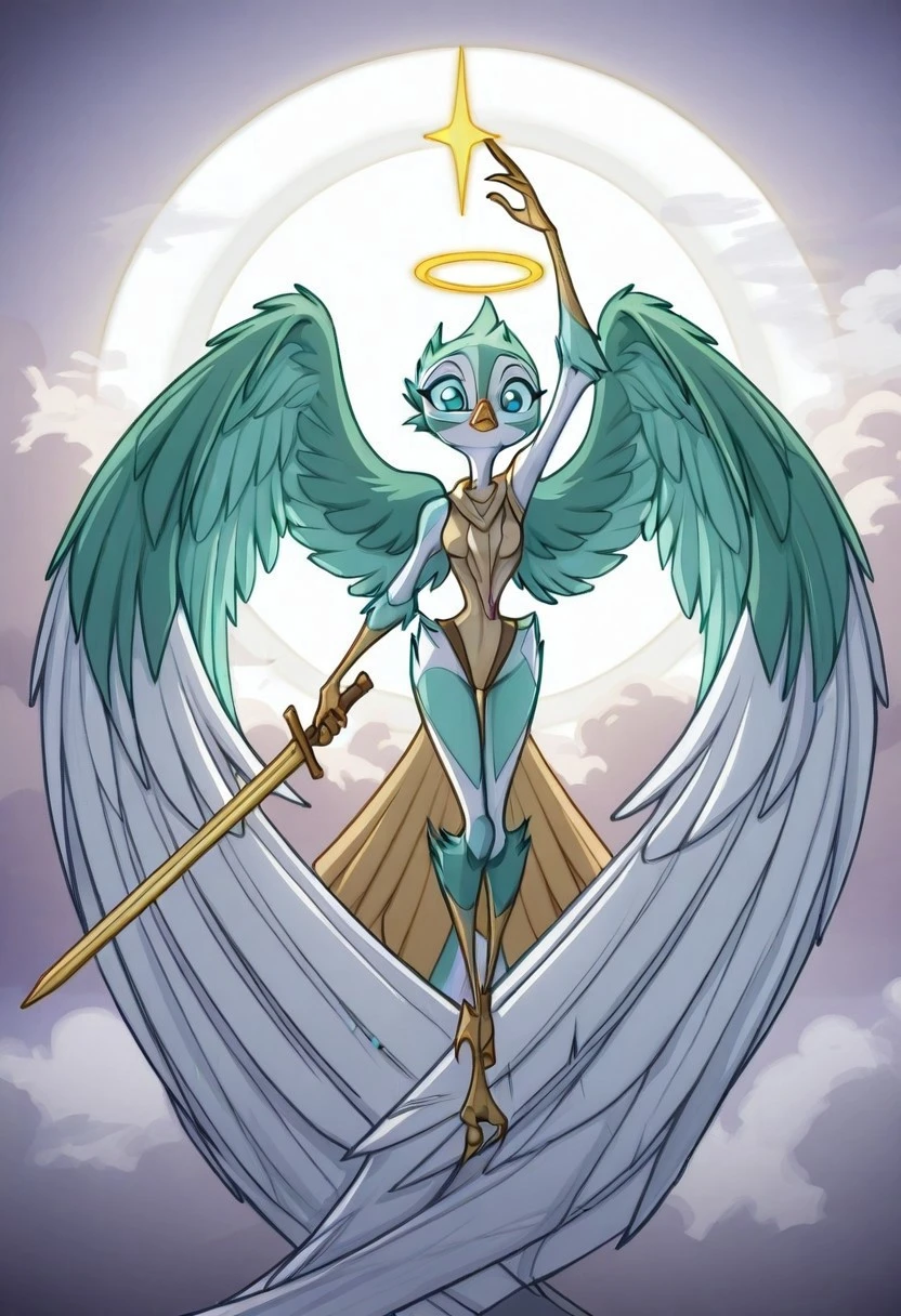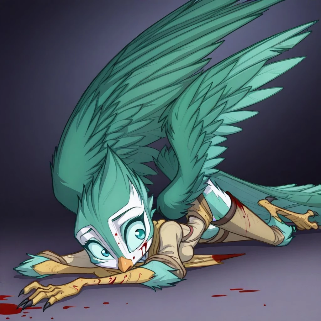 fae_dk, blue eyes, 1girl, solo, wings, furry, furry female, green fur, beak, bird tail, bird, feathered wings,