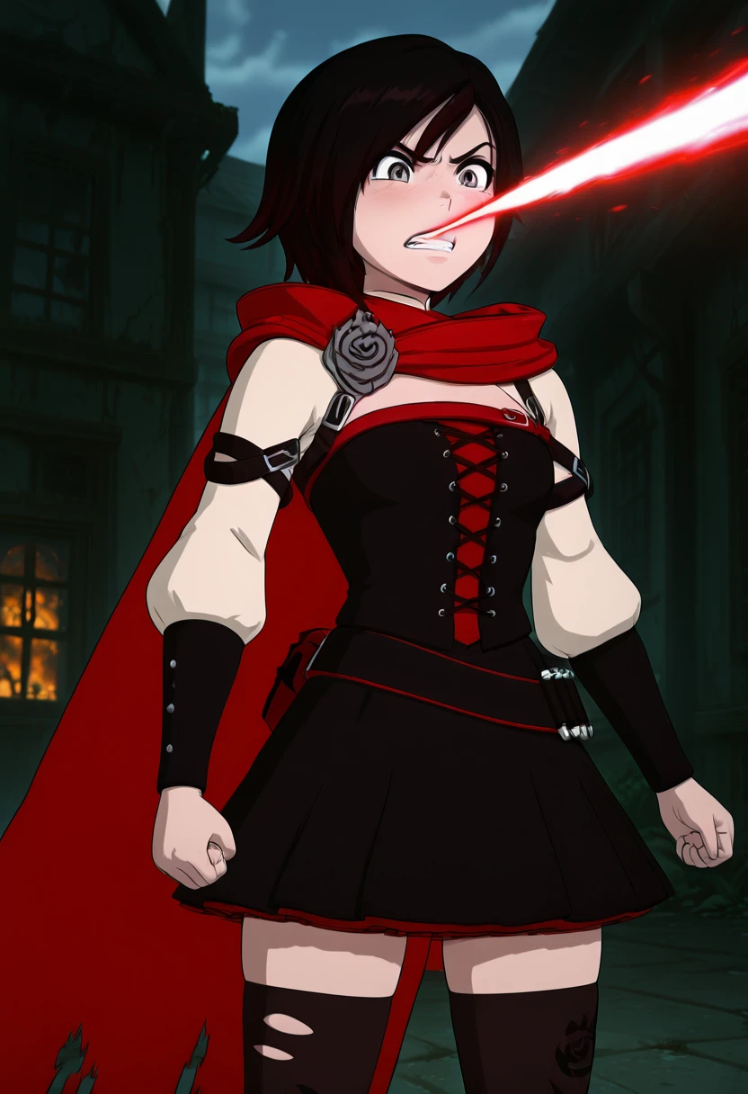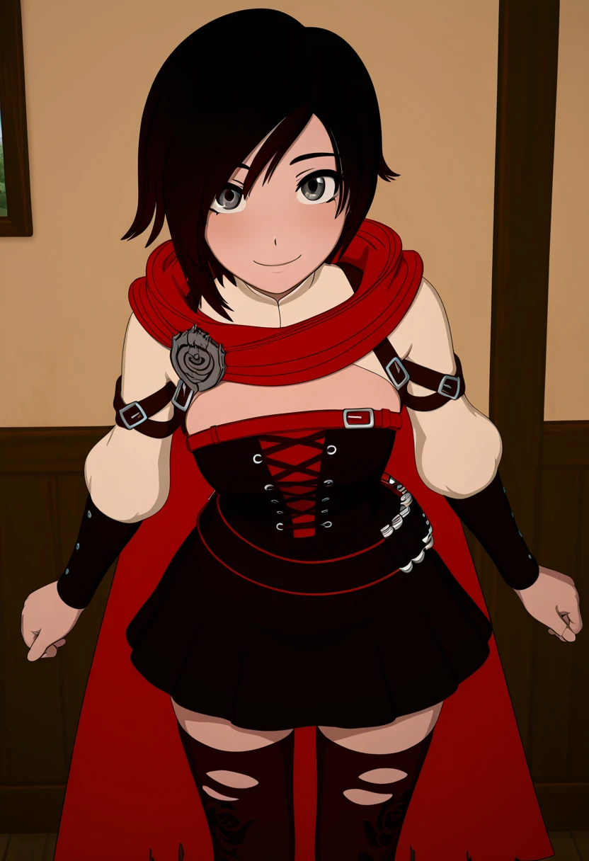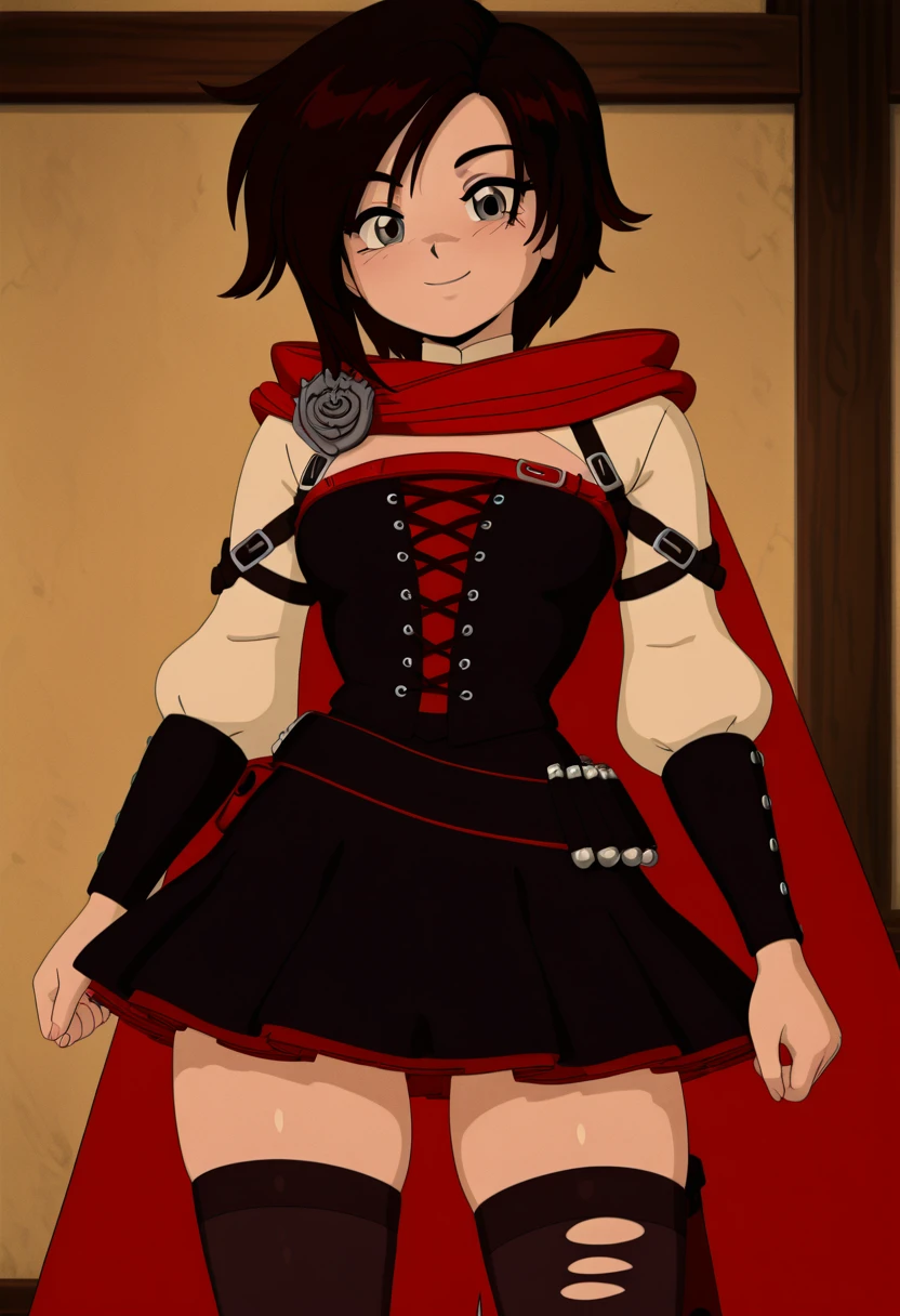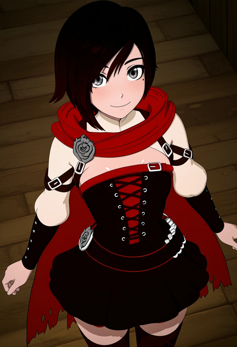 zzRuby, grey eyes, black hair, short hair, corset, belt, torn clothes, red cape, black eyes, flower, skirt, thighhighs,