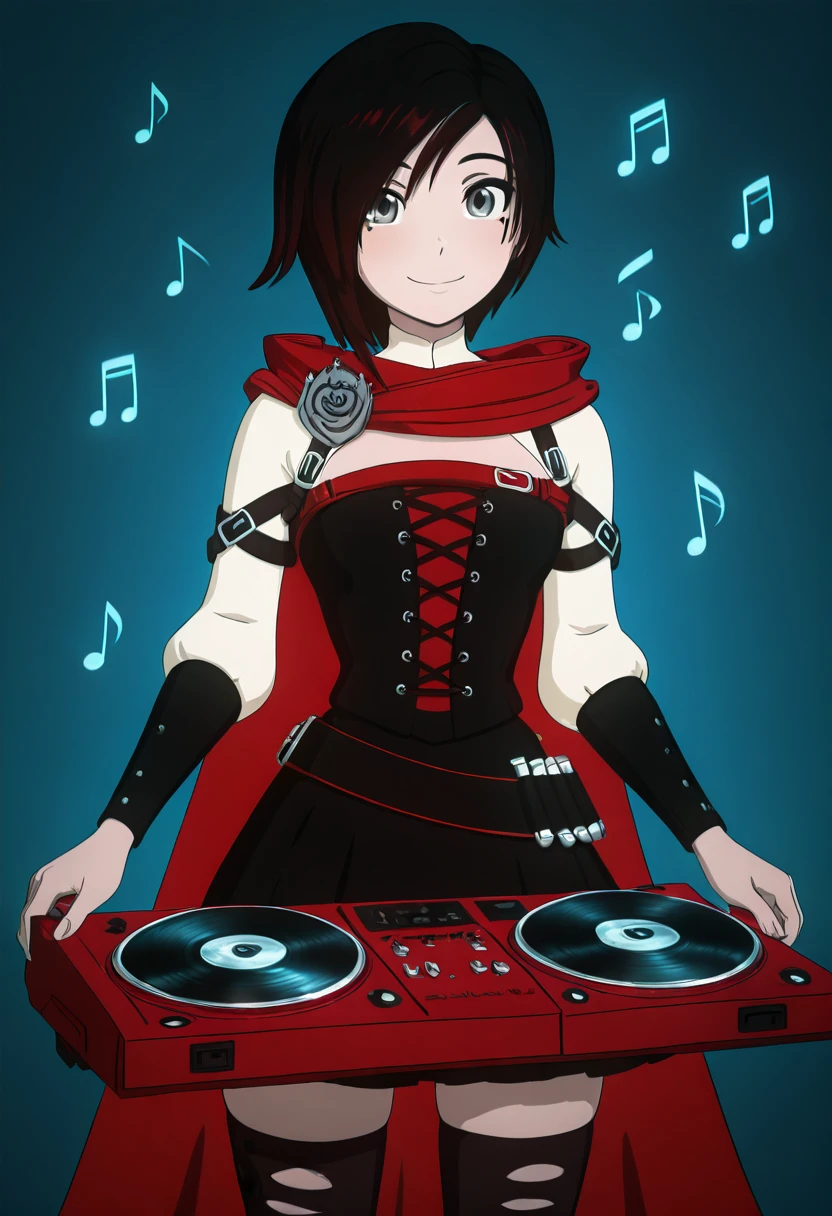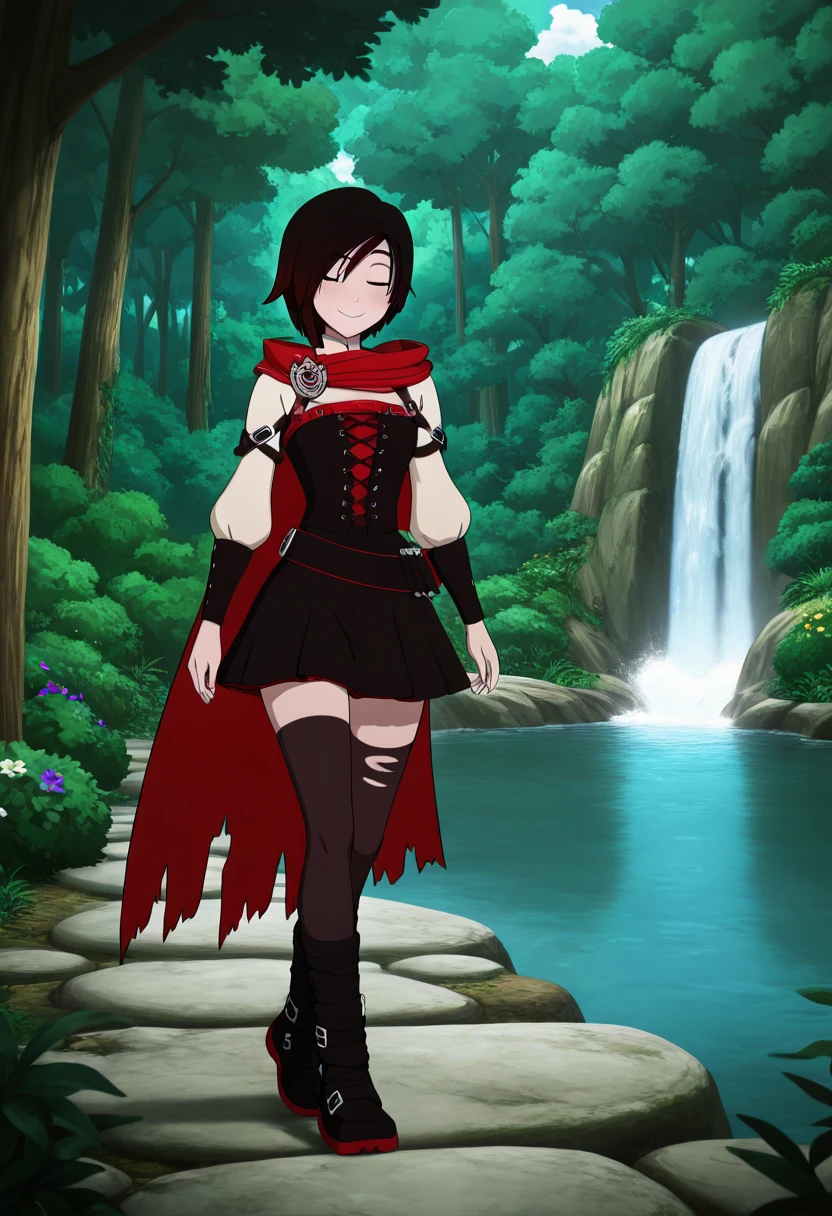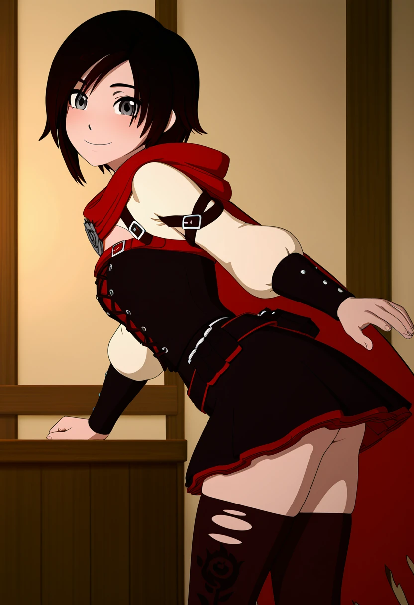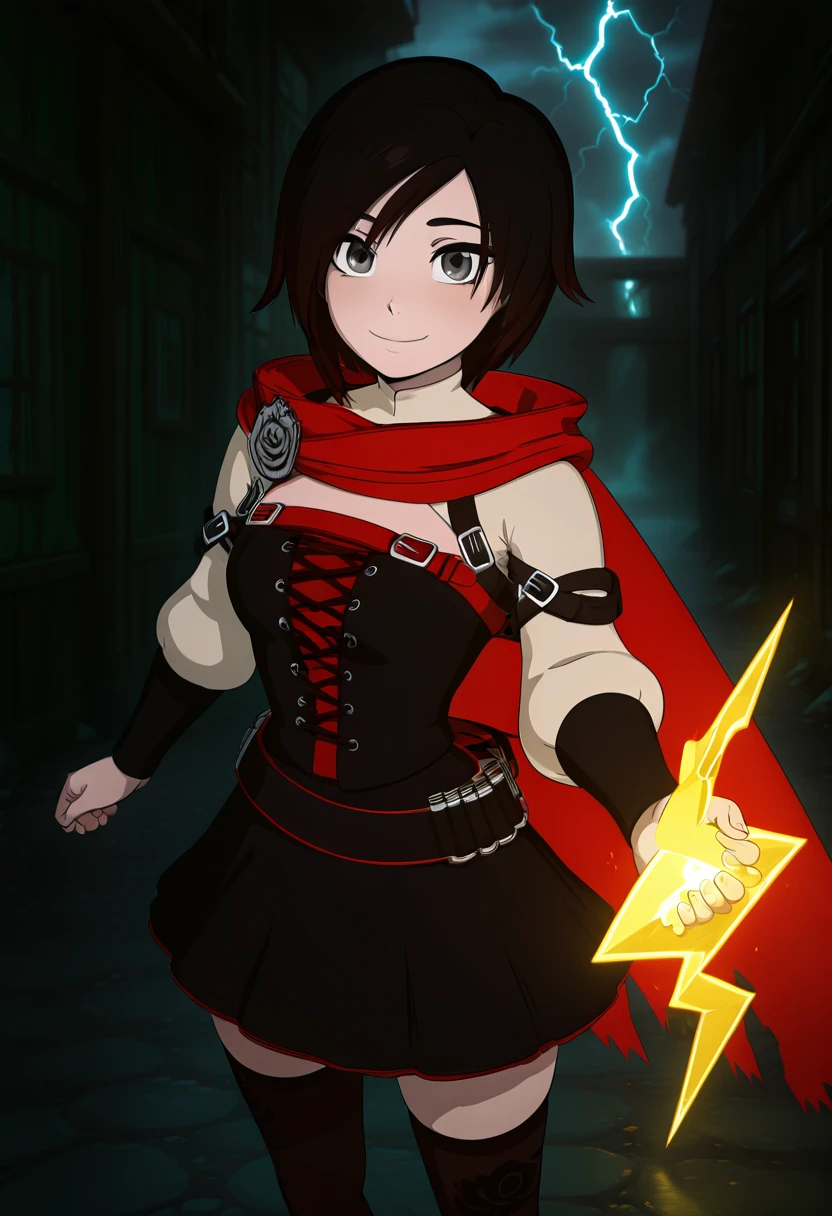 zzRuby, grey eyes, black hair, short hair, corset, belt, torn clothes, red cape, black eyes, flower, skirt, thighhighs,
