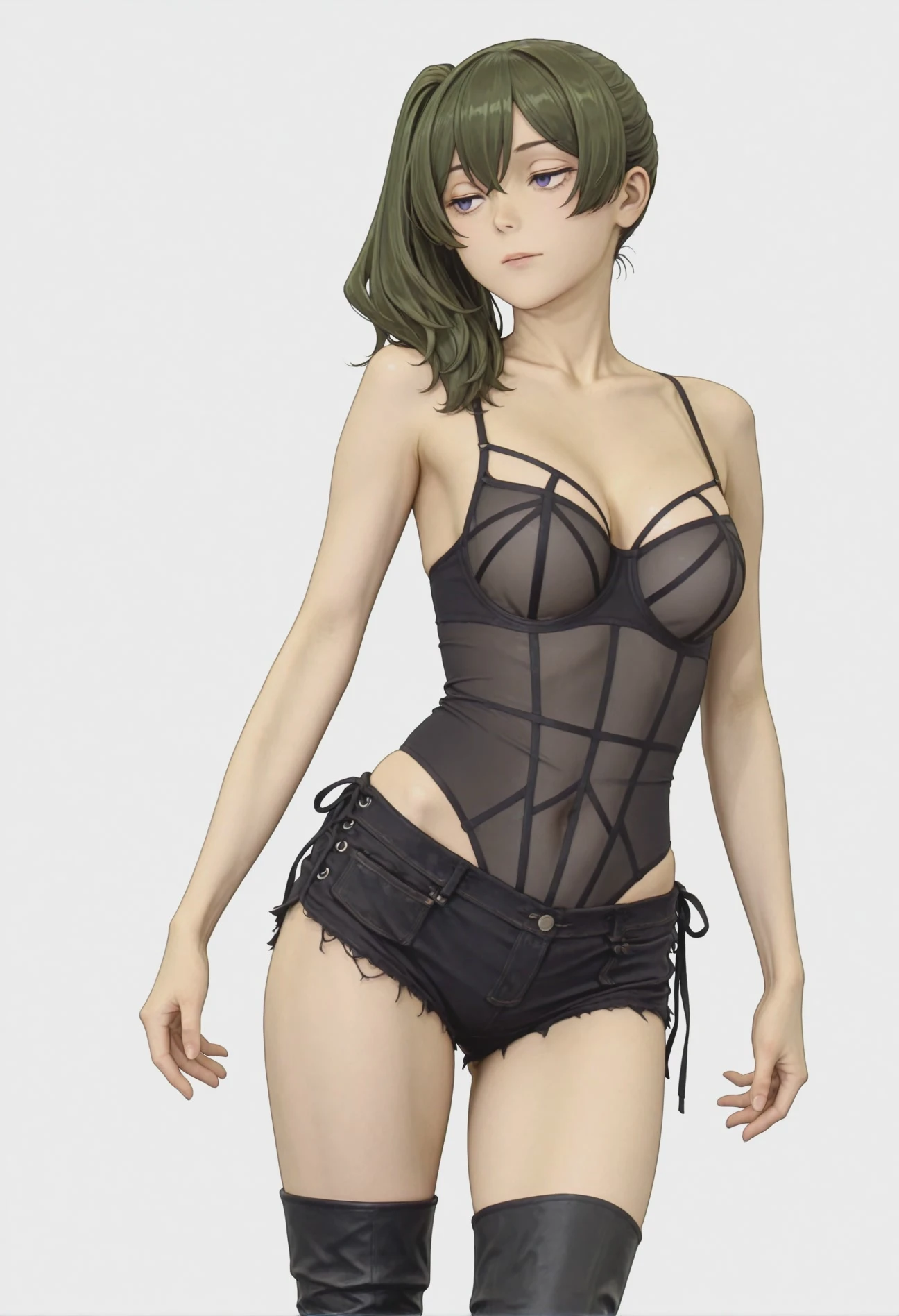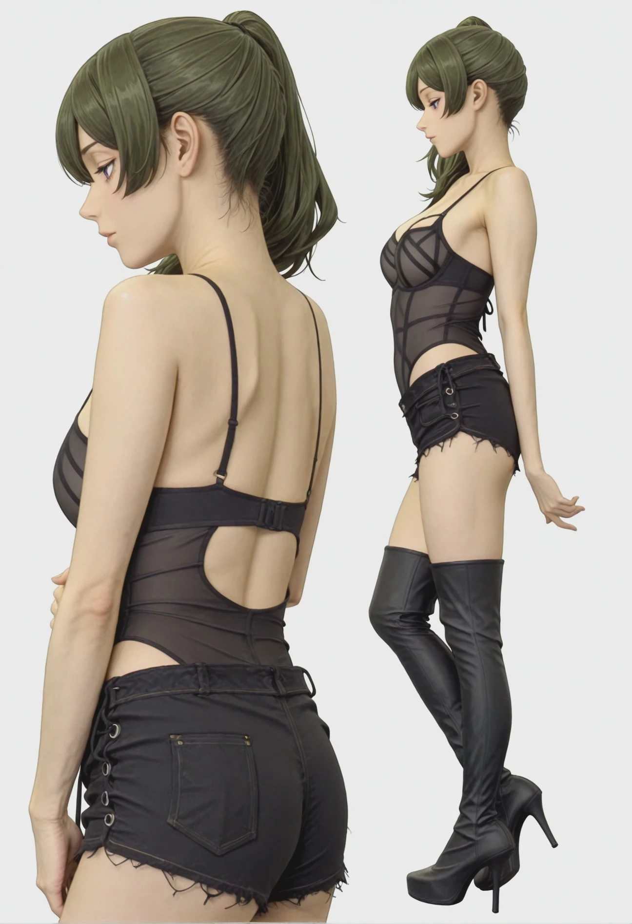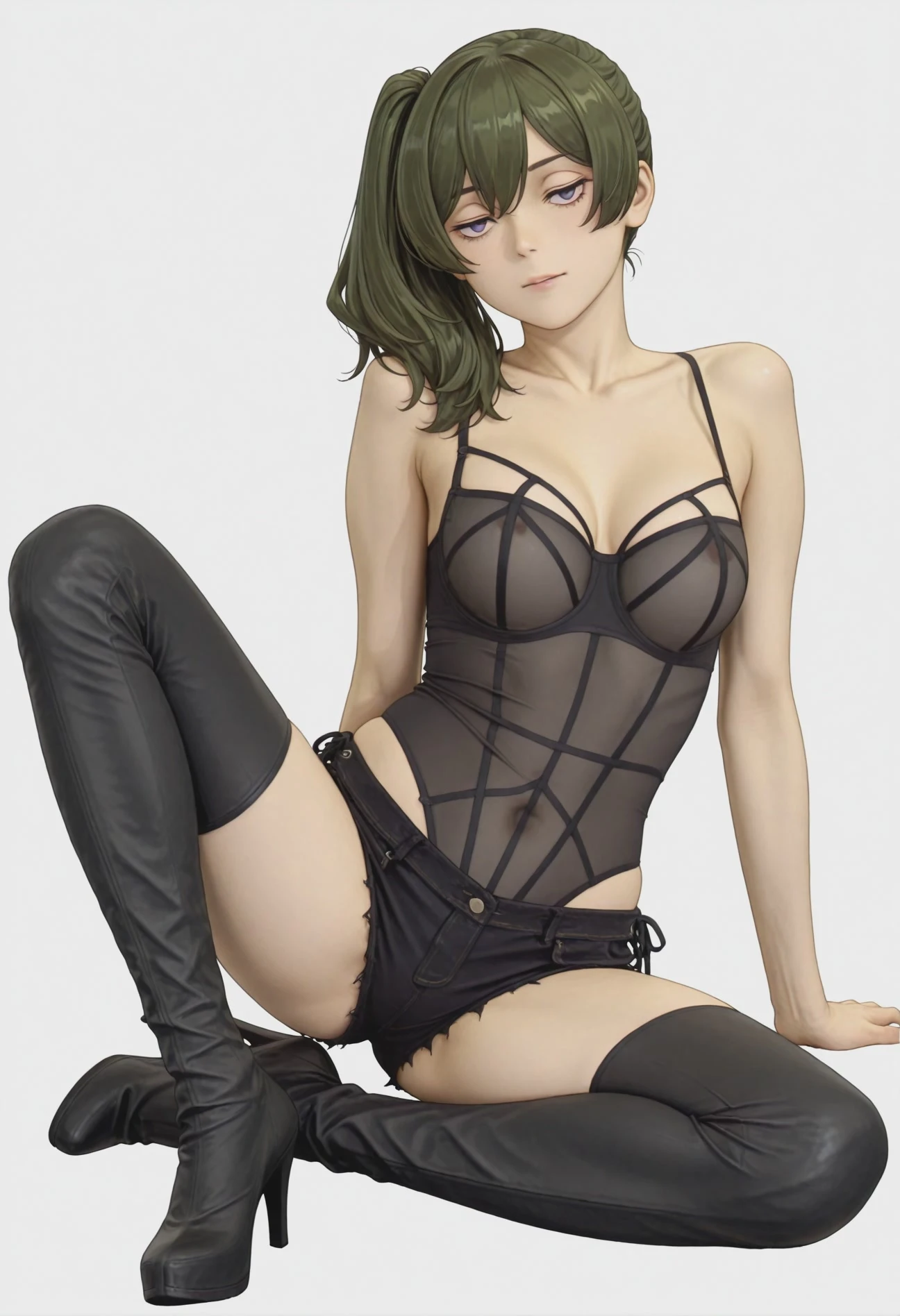 sgdablackstripebra, black lingerie, spaghetti strap, see-through swimsuit, high-leg swimsuit, thigh boots, black footwear, short shorts, high heel boots, black shorts