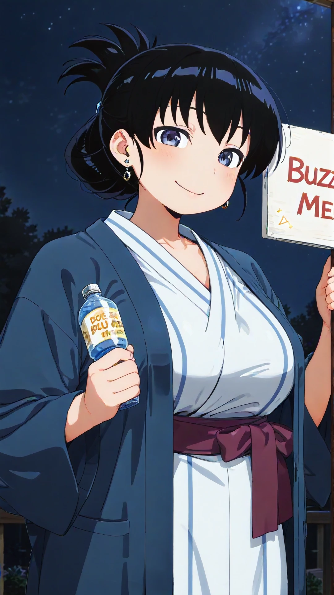 (aratonagi, black hair, blue-purple eyes, cleavage,), nagiyukata, stud earrings, light blue yukata, purple sash, striped kimono, blue-gray hanten (clothes), 1girl, japanese clothes, solo, kimono, yukata, sash, hanten (clothes), smile, looking at viewer, single hair bun, high detail, realistic textures,