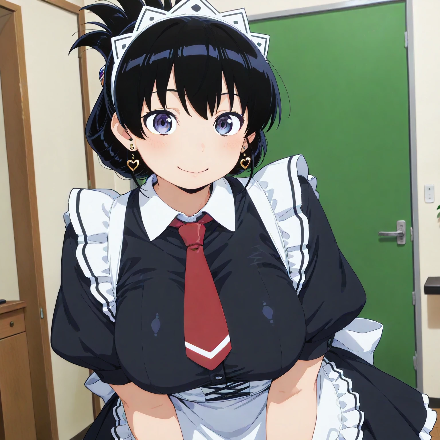(aratonagi, black hair, blue-purple eyes, cleavage,), nagimaid, heart earrings, red necktie, black dress, maid headdress, frilled apron, black pantyhose, white wrist cuffs, back bow, hair ornament, very long straight hair, folded ponytail, single hair bun, high detail, realistic textures,