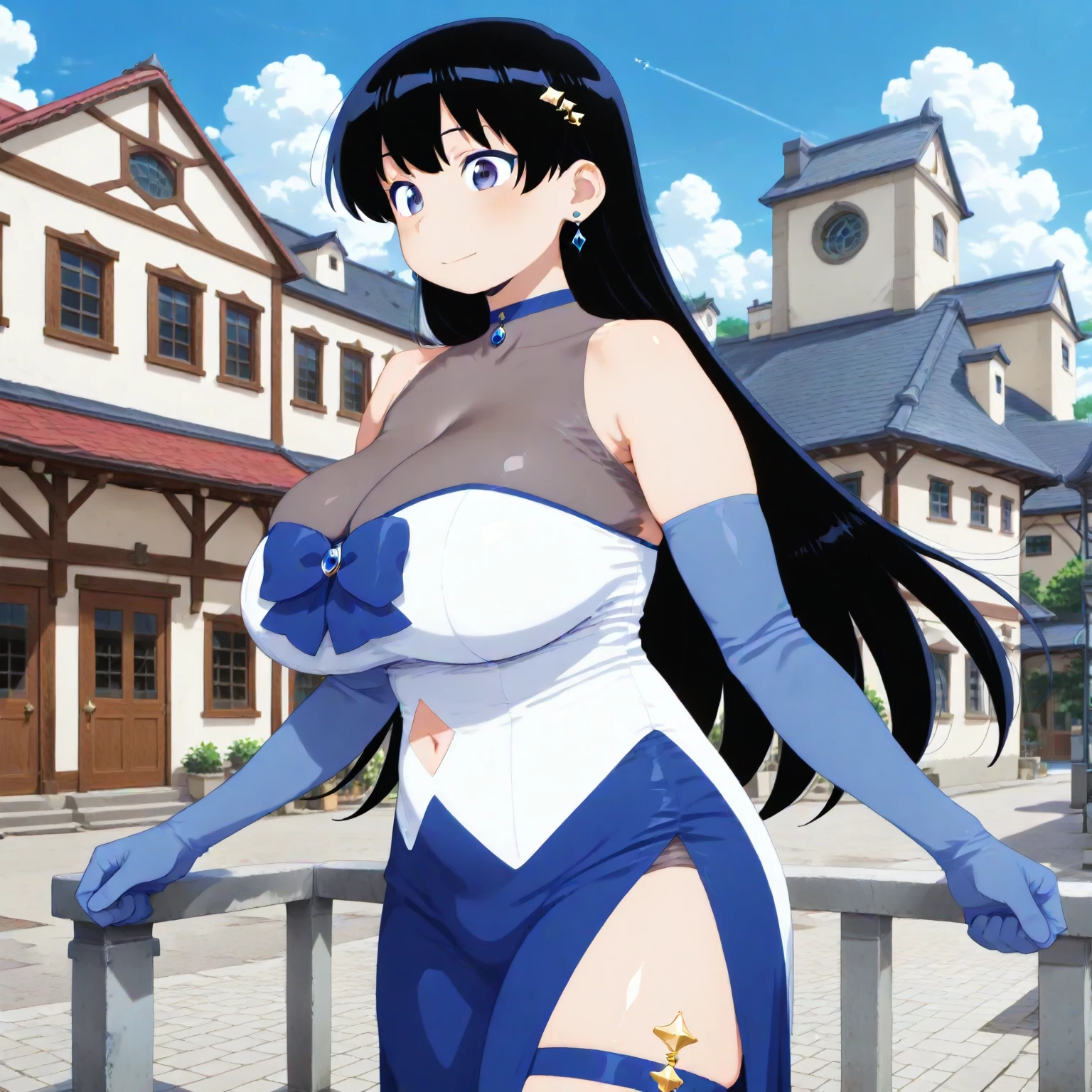 (aratonagi, black hair, blue-purple eyes, cleavage,), nagimagic, white-blue strapless dress, side slit, blue elbow gloves, thigh strap, blue choker, choker, hair ornament, sparkle hair ornament, blue bow, navel cutout, bare shoulders, covered collarbone, very long straight hair, folded ponytail, single hair bun, high detail, realistic textures,