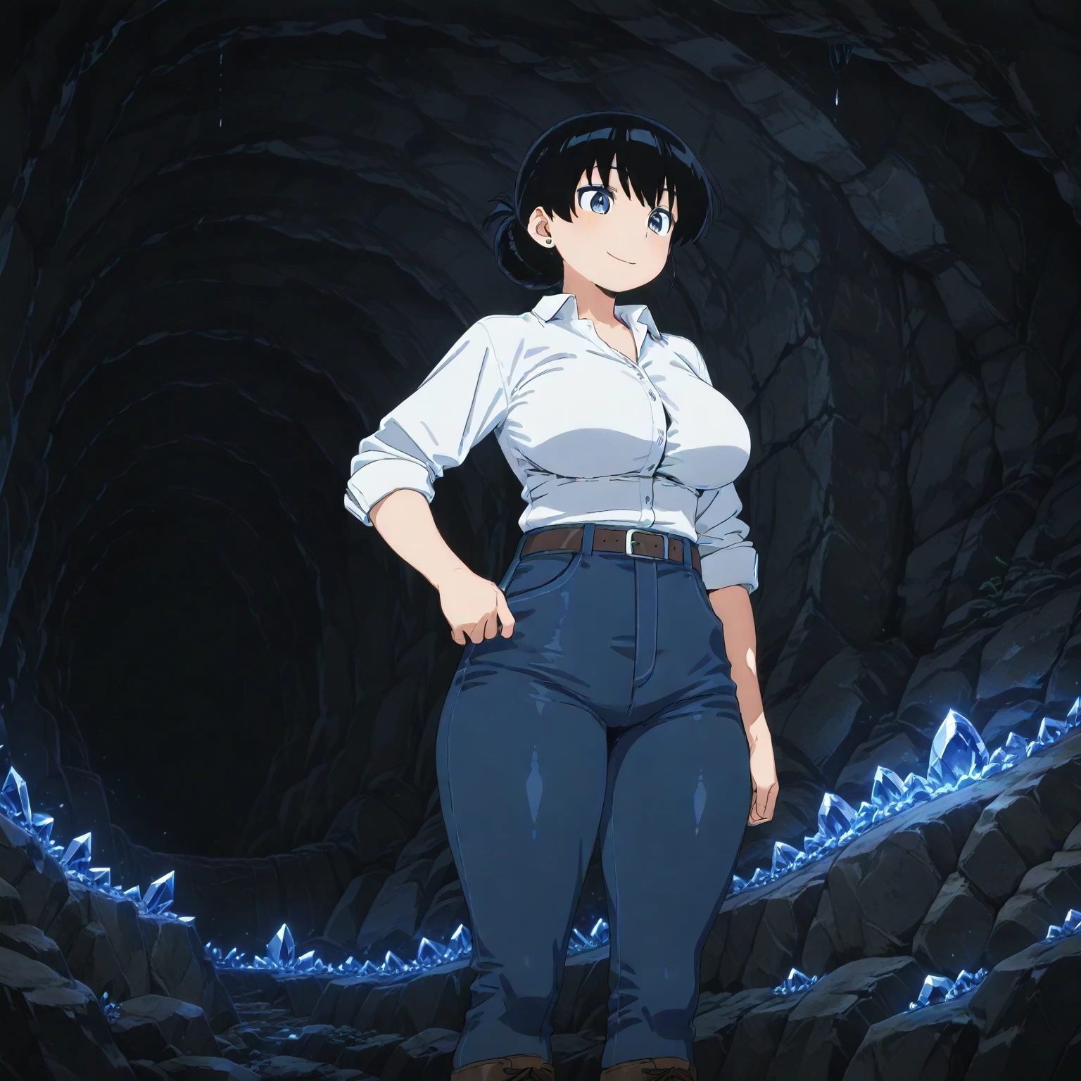 (aratonagi, black hair, blue-purple eyes, cleavage,), naginormal, stud earrings, white collared shirt, rolled-up long sleeves, open collar, shirt tucked in, jeans, brown belt, lace-up boots, very long straight hair, folded ponytail, single hair bun, high detail, realistic textures,