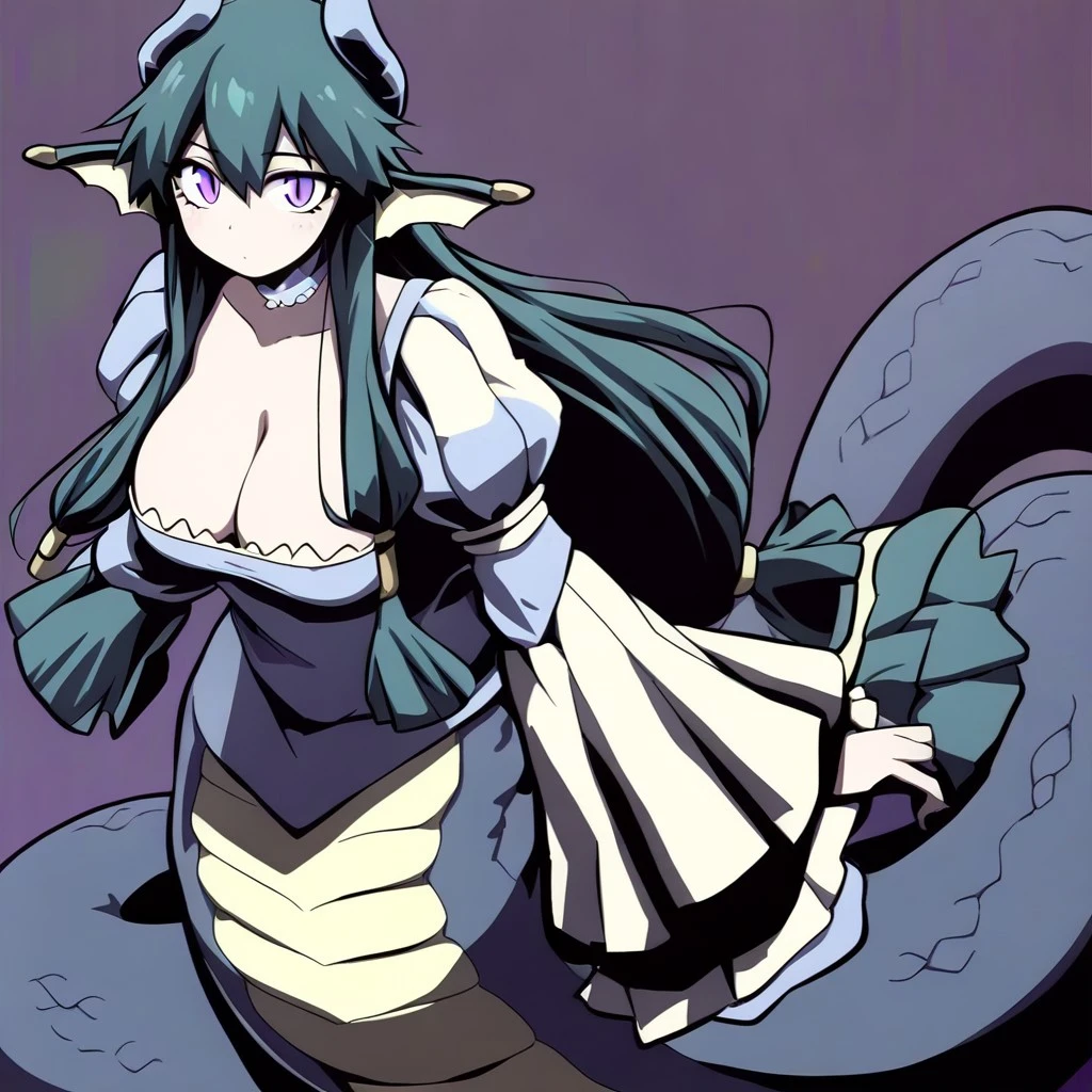 dominic, half-human, long hair, long sleeves, cleavage, purple eyes, horns, choker, puffy sleeves, head fins, purple eyes, monster girl, head fins, large breasts, cleavage