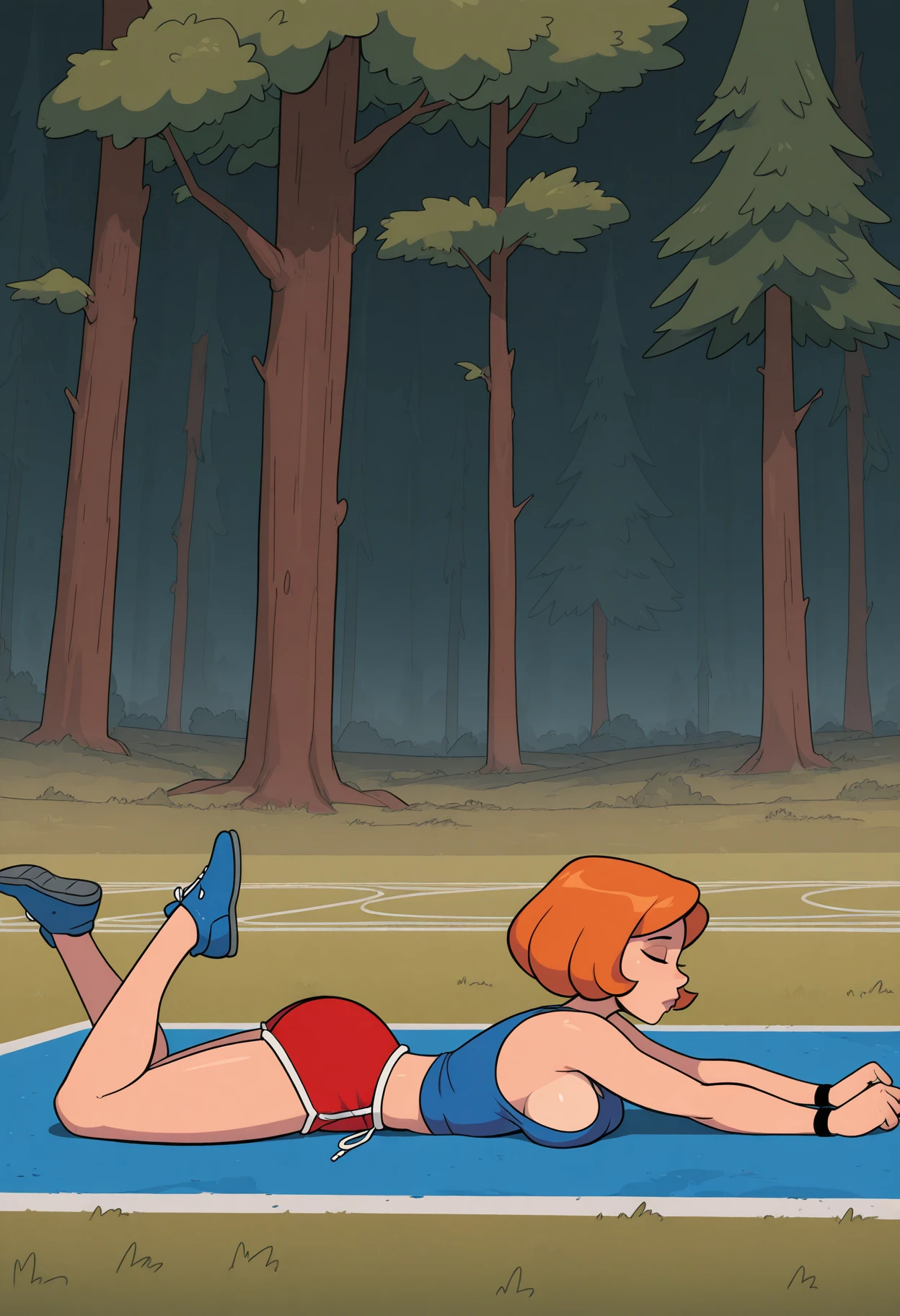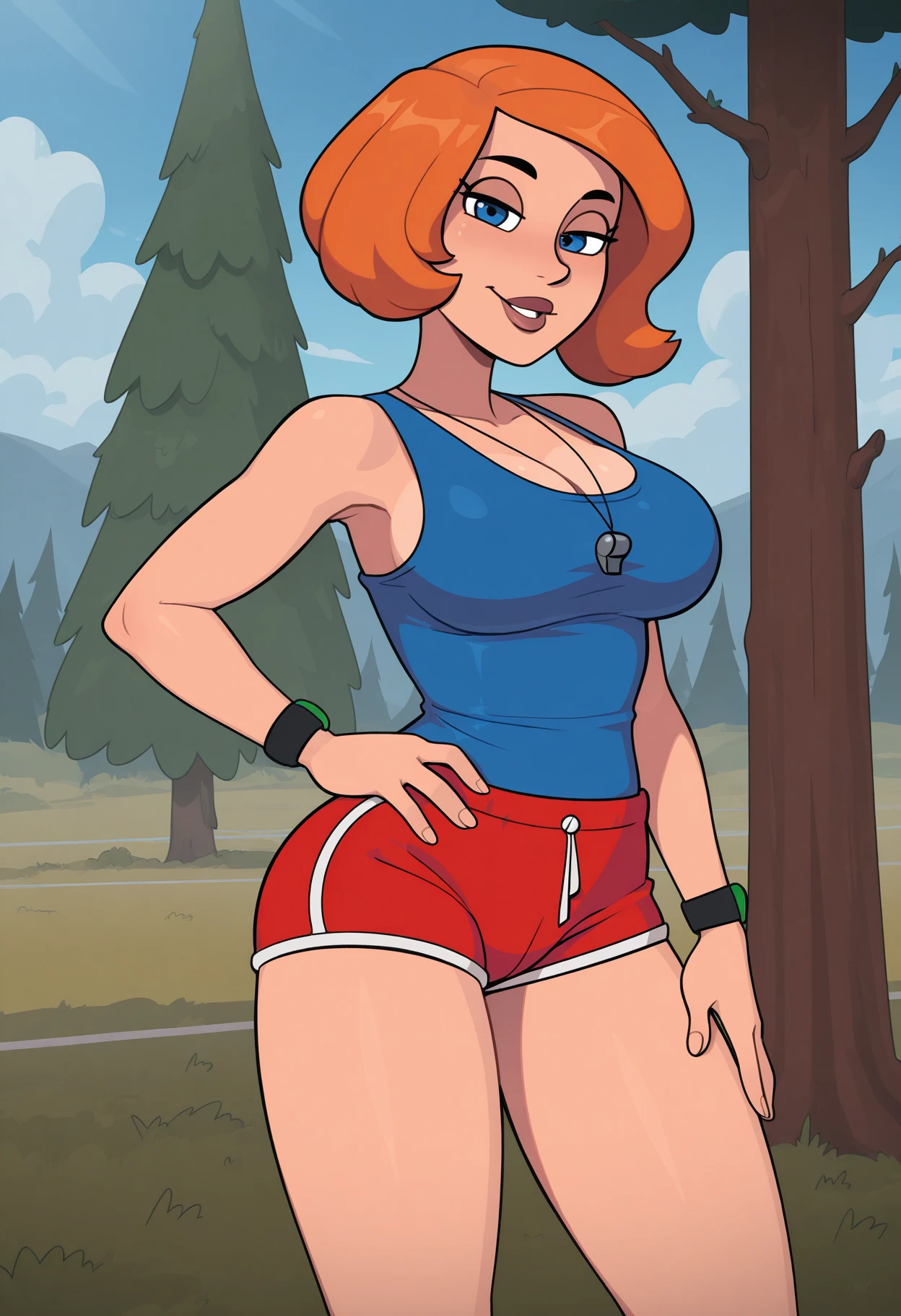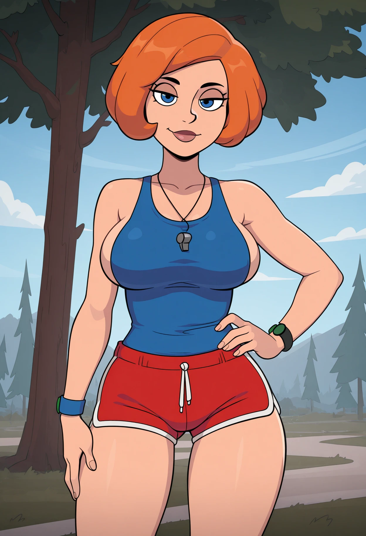 jewelry, whistle, wristband, bare shoulders, blue shirt, tank top, sleeveless, sideboob, shorts, short shorts, dolphin shorts, red shorts, You can support my work by following the link: https://boosty.to/nmackelie