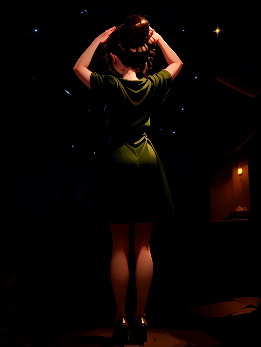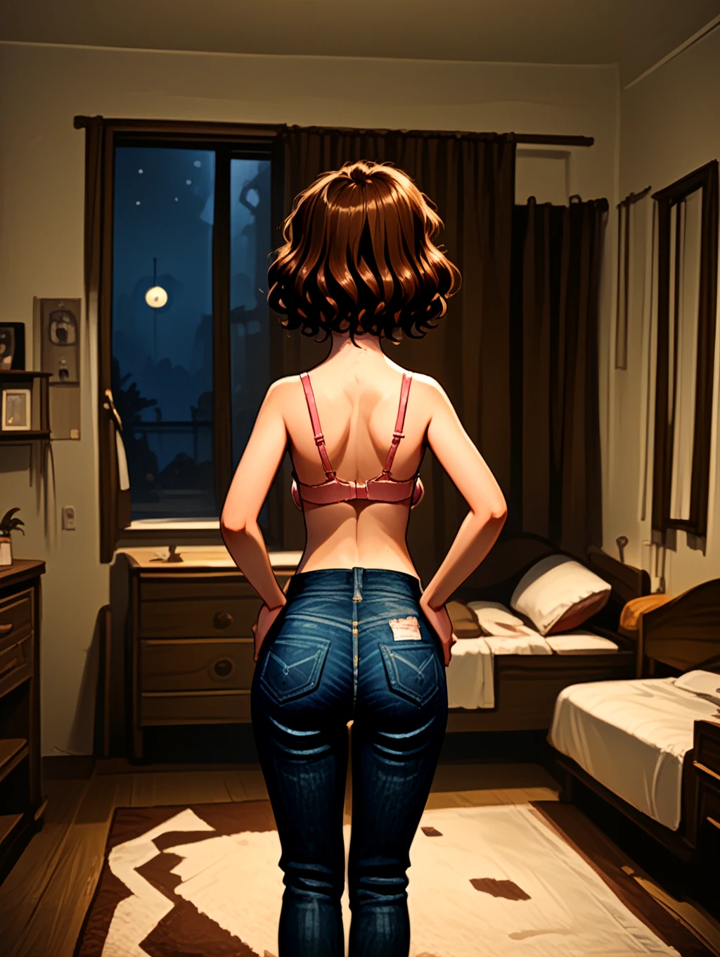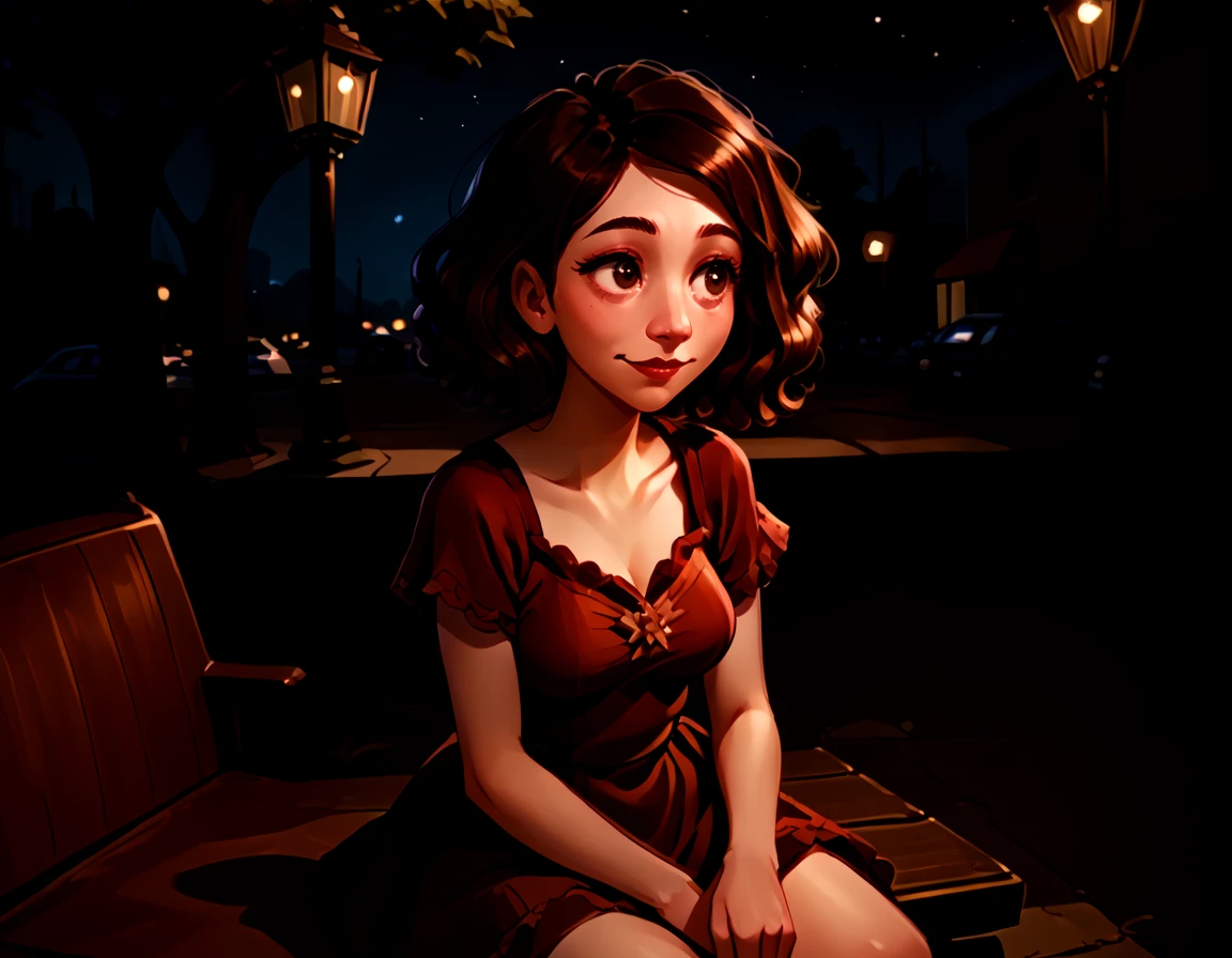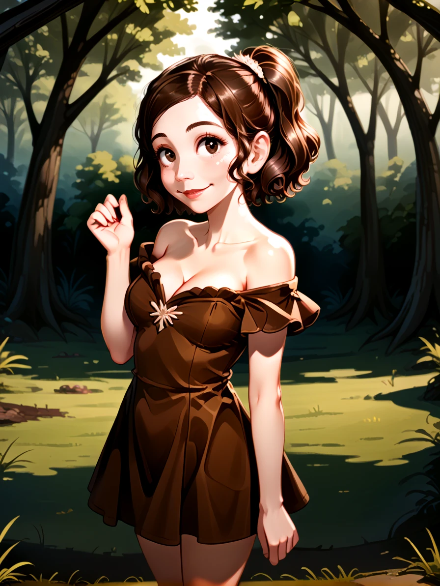 maggie_rose, 1girl, brown eyes, brown hair, wavy hair, short hair, smile, solo, breasts, looking at viewer, smile, dress, cleavage, bare shoulders,