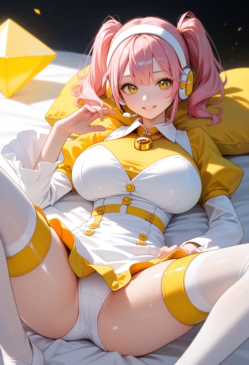 <lora:amulet_dia:1> amulet_dia, lock button, twintails, medium hair, pink hair, yellow eyes, hairband, thighhighs, yellow and white dress, headset, white hairband, long sleeves, diamond (shape), white dress, detached sleeves, double yellow diamond (shape) jewel on hairband