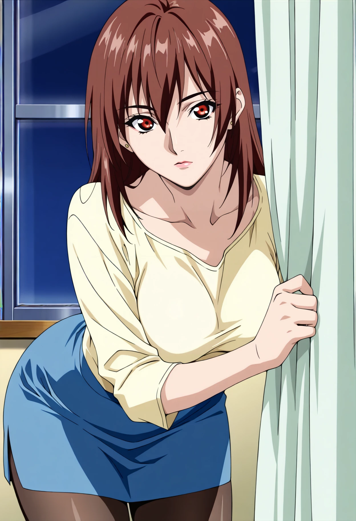 Yellow shirt: a_rena, 1girl, anime coloring, retro artstyle, solo, long hair, brown red hair, hair between eyes, stud earrings, red eyes, lips, lipstick, rena yellow shirt, long sleeves, blue skirt, miniskirt, medium breasts,