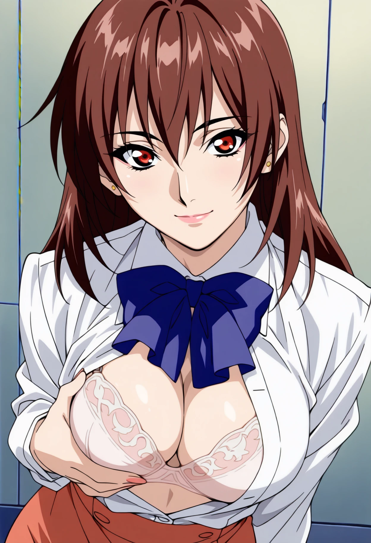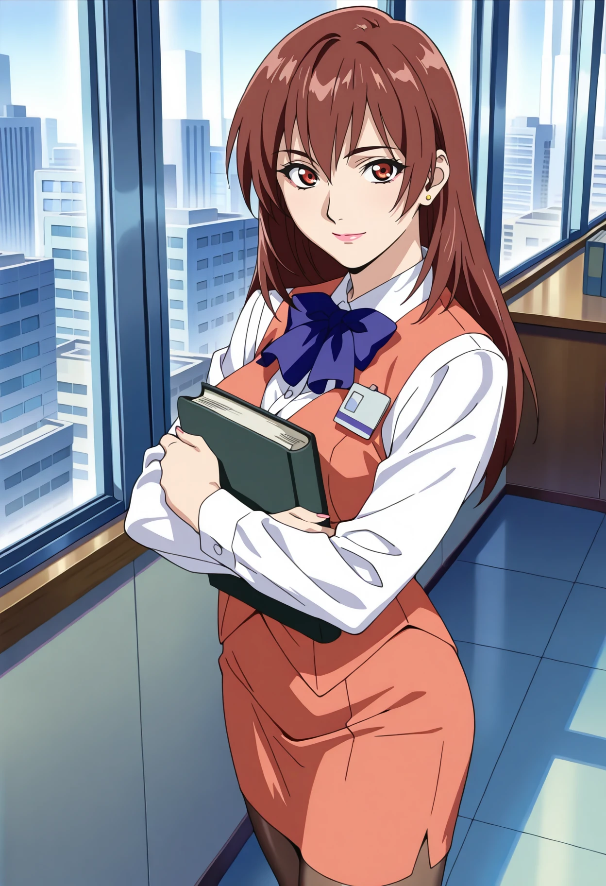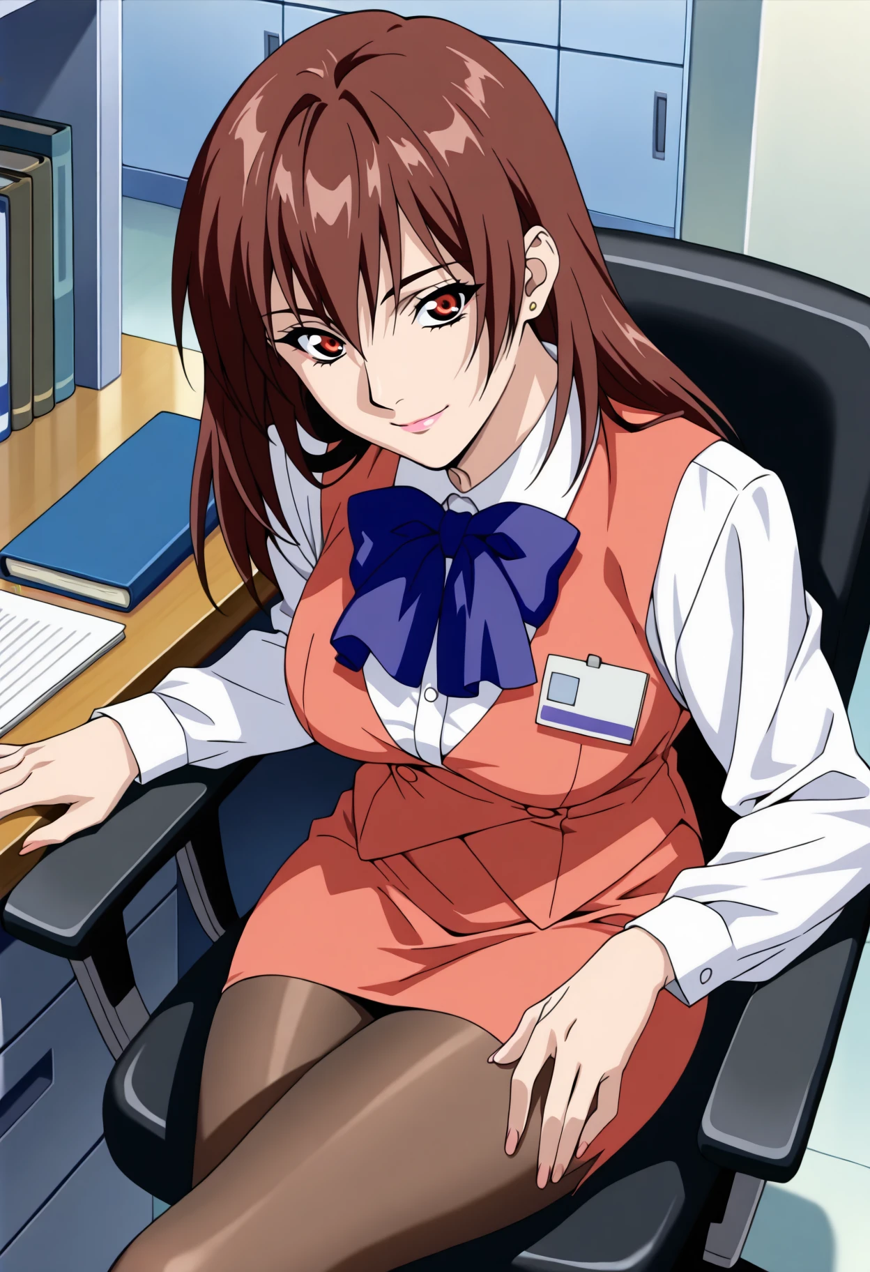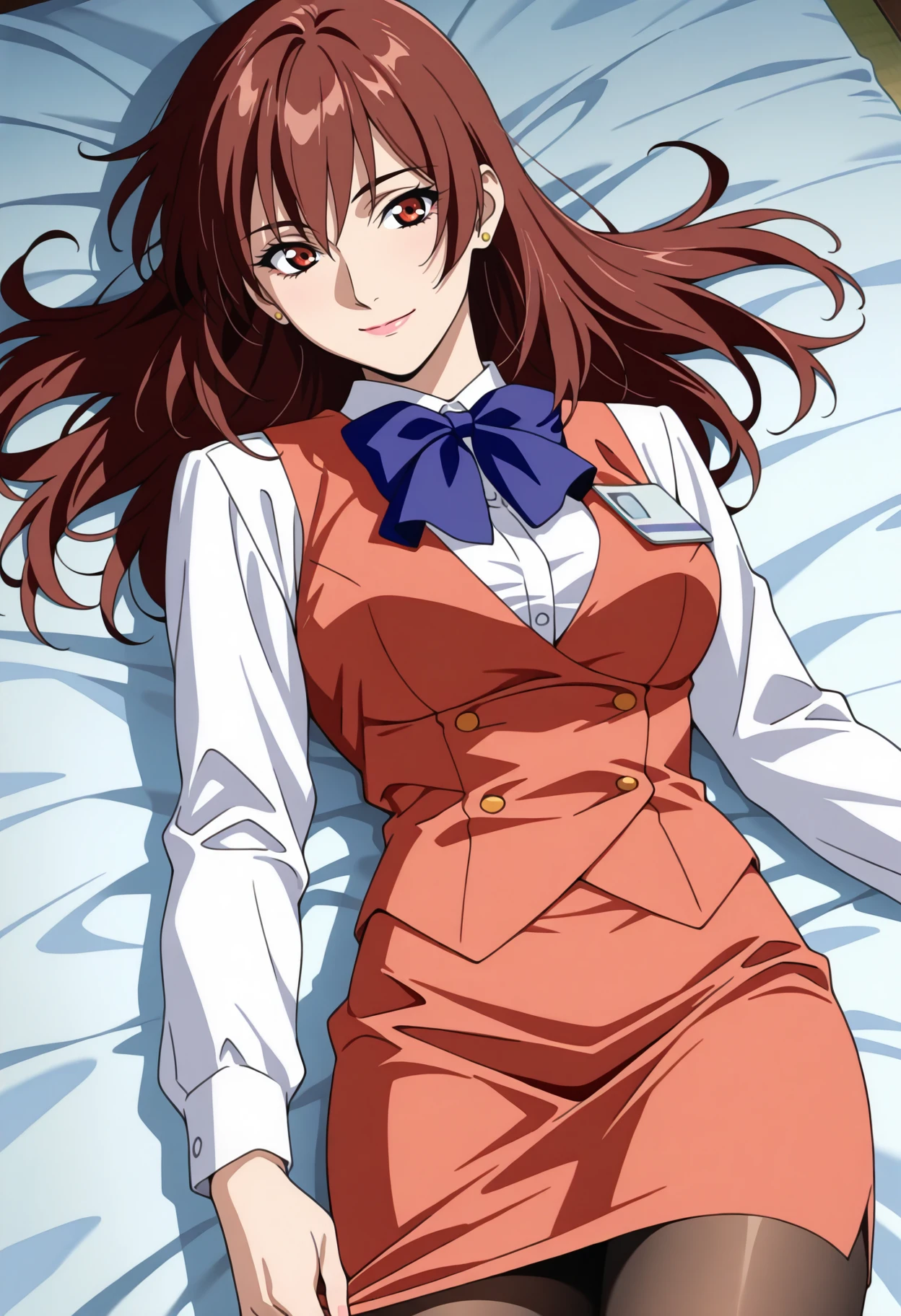Base: a_rena, 1girl, anime coloring, retro artstyle, solo, long hair, brown red hair, hair between eyes, stud earrings, red eyes, lips, lipstick, rena uniform, blue bowtie, red vest, collared shirt, long sleeves, name tag, pencil skirt, red skirt, medium breasts, pantyhose,