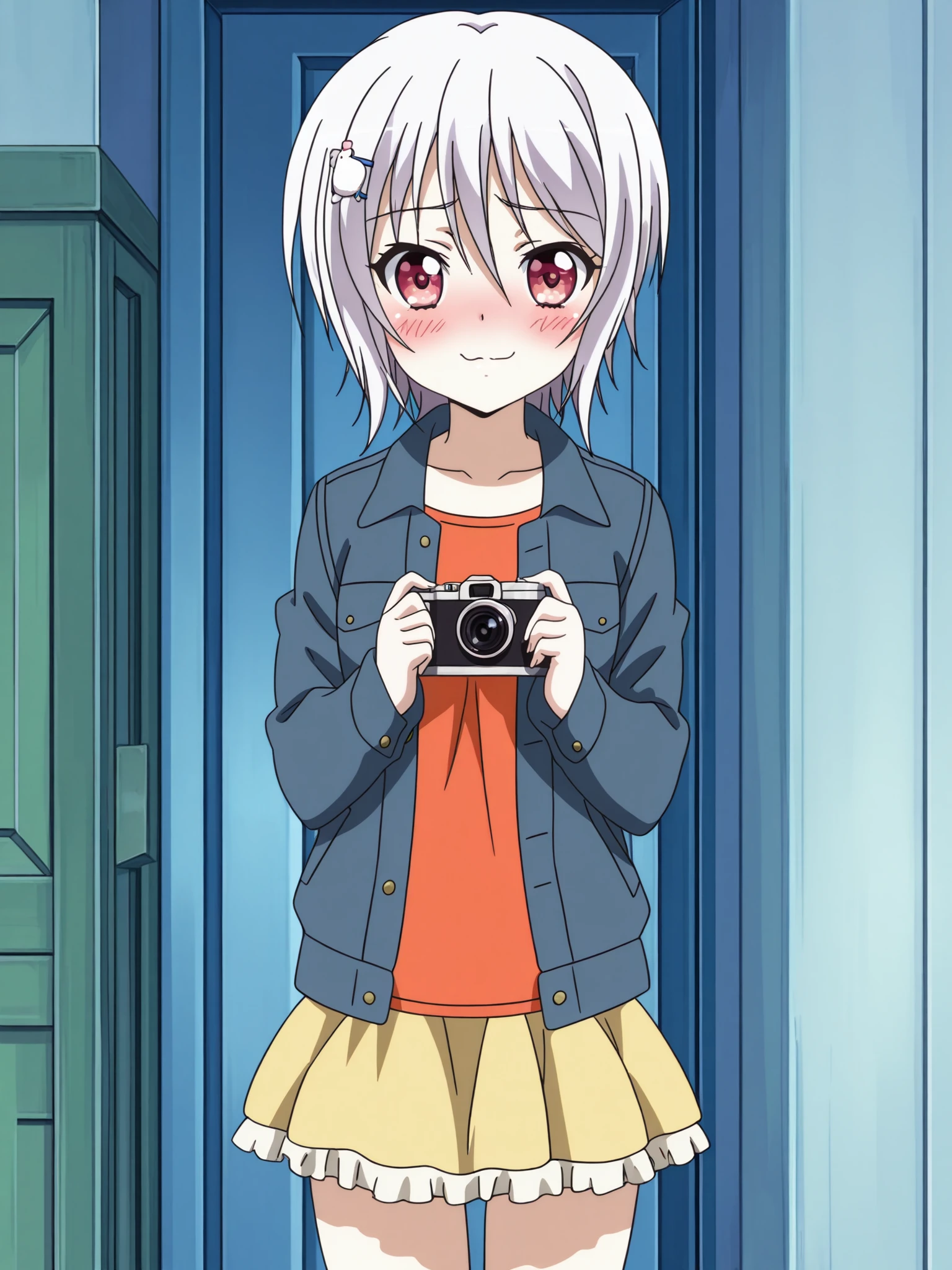 Furano Yukihira (character), Furano casual outfit, 1girl, short hair, skirt, hair ornament, red eyes, white hair, jacket, hairclip, small breasts