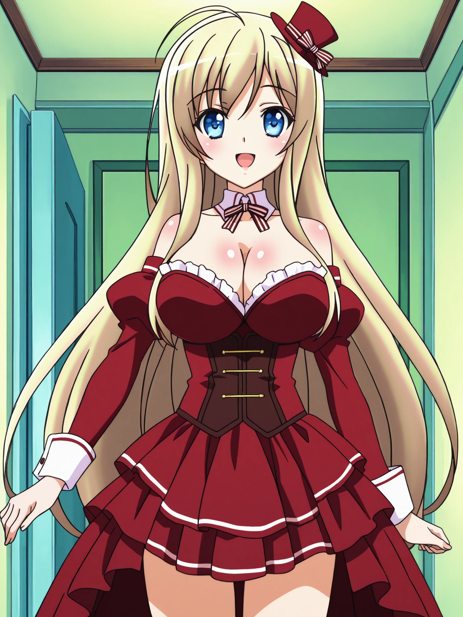 Chocolat (character), Chocolat standard outfit, 1girl, blonde hair, blue eyes, long hair, hat, cleavage, red dress, mini hat, large breasts, bare shoulders, detached sleeves, detached collar