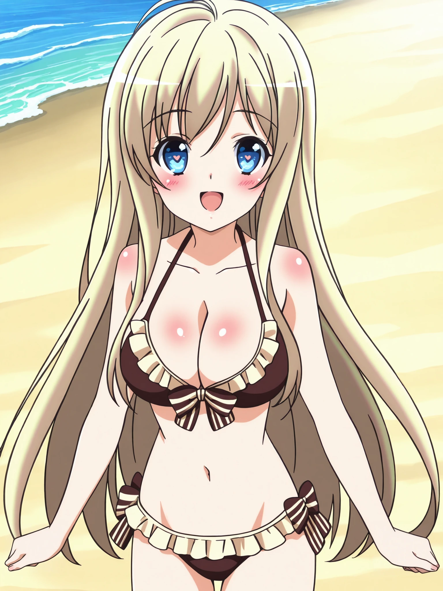 Chocolat (character), Chocolat swimsuit outfit, swimsuit, long hair, bikini, 1girl, cleavage, navel, blonde hair, frills, frilled bikini, groin, large breasts, blue eyes, long hair, bare shoulders