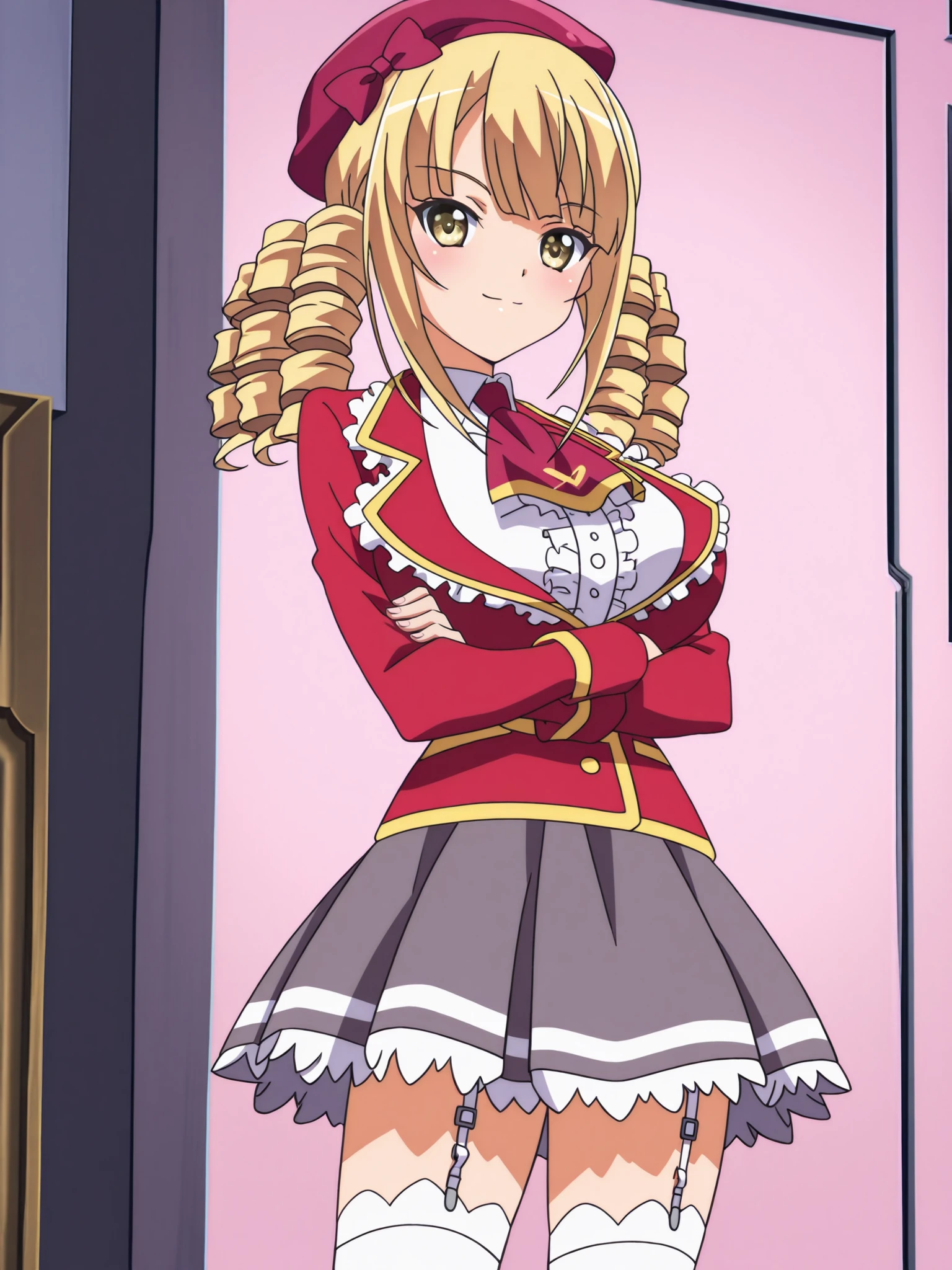 Ayame Reikadou (character), Ayame school uniform outfit, 1girl, blonde hair, drill hair, hat, garter straps, skirt, white thighhighs, yellow eyes, large breasts, beret