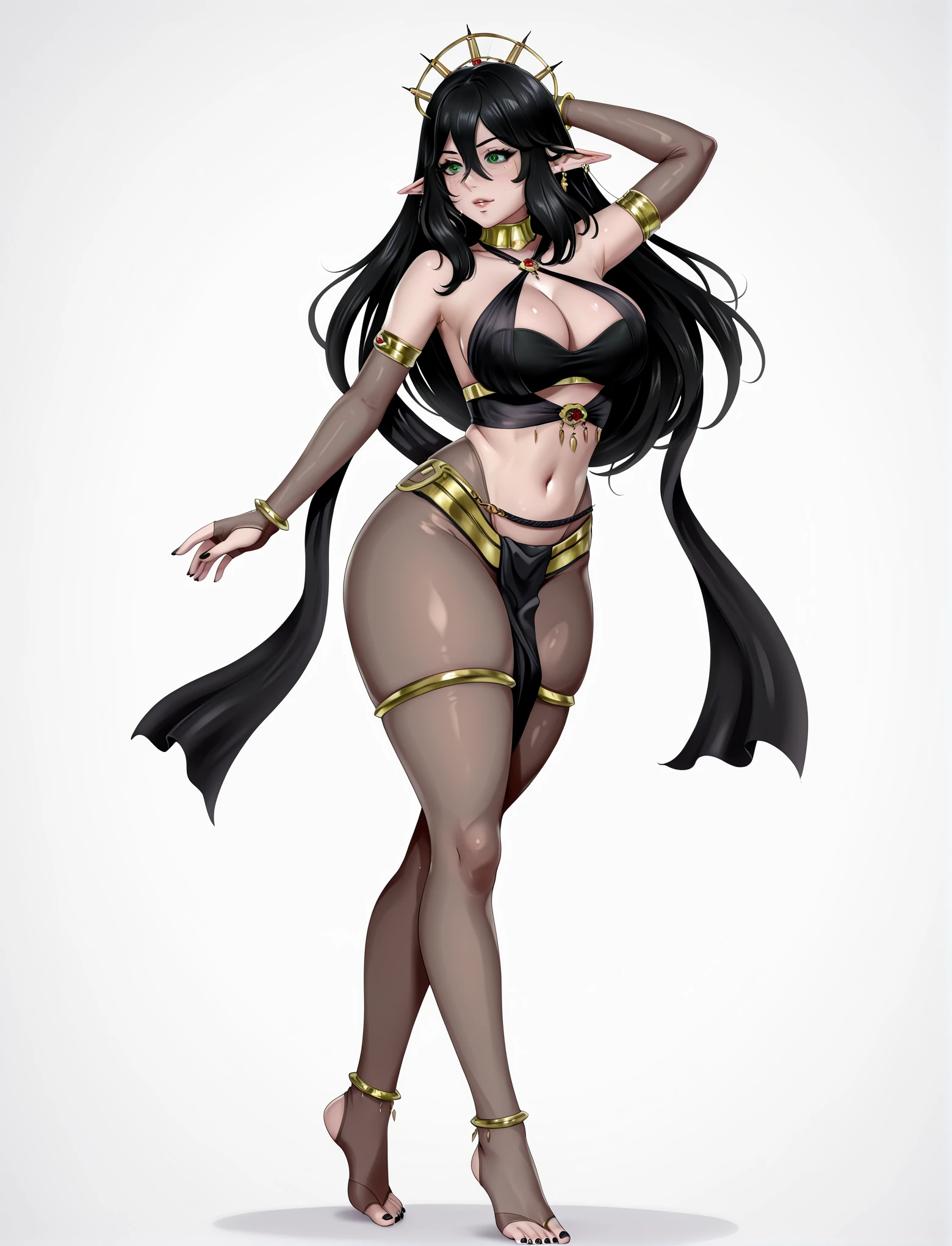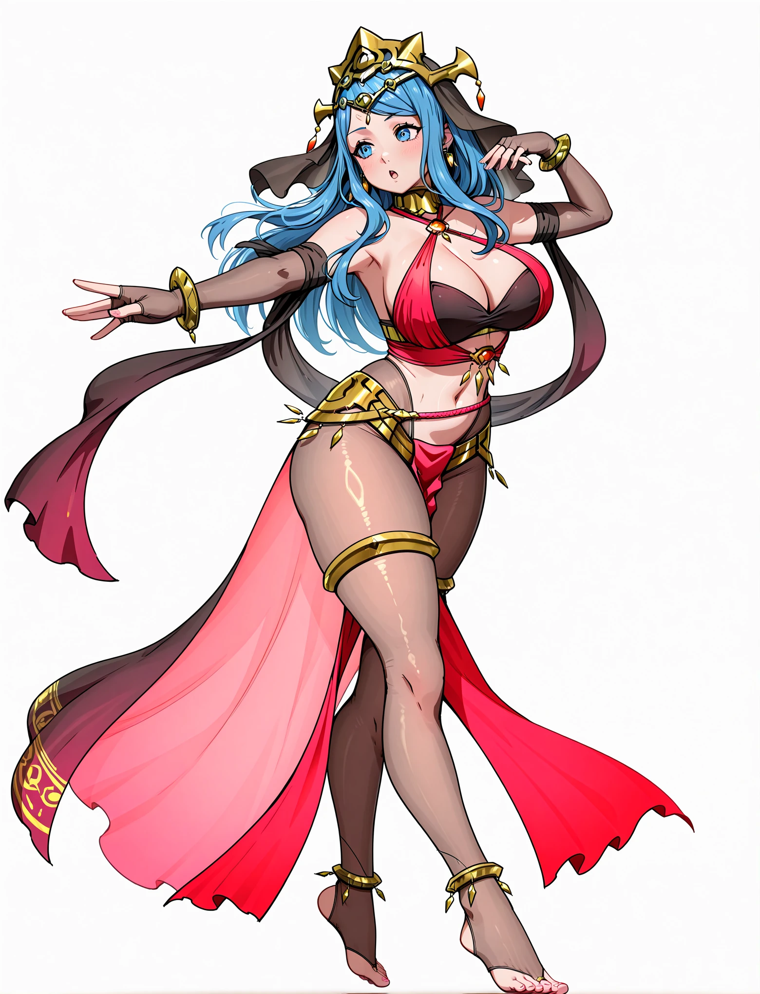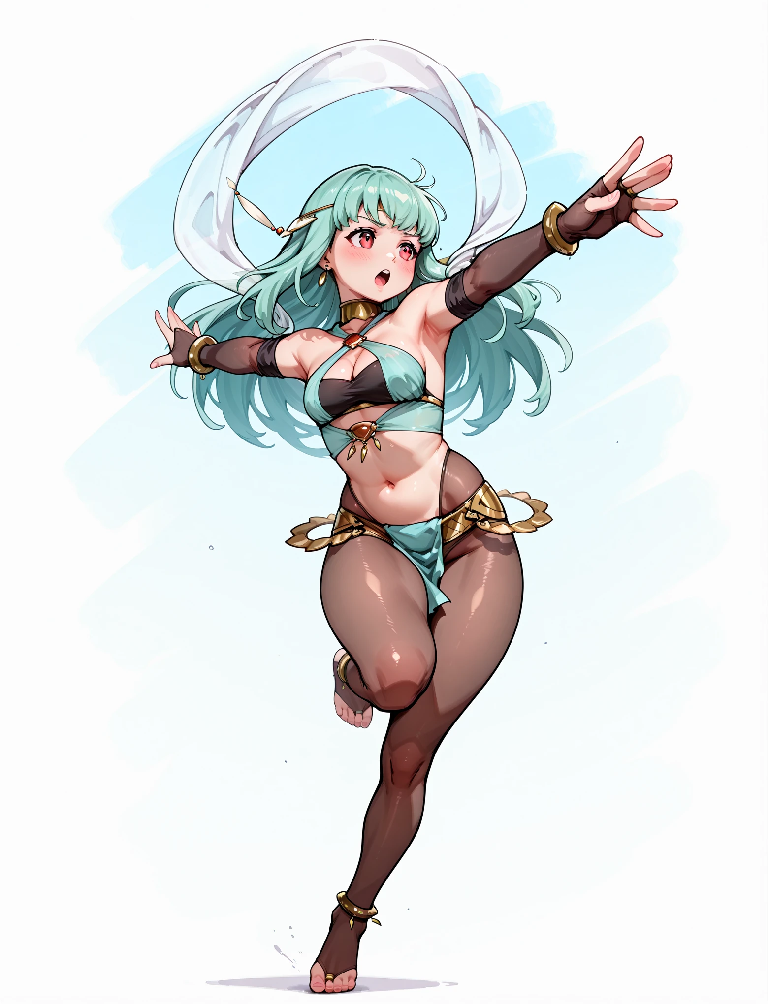 dancer, harem outfit, alternate costume, criss-cross halter, gold collar, gold bangles, bare shoulders, bracelet, cleavage, earrings, jewelry, navel, midriff, body jewelry, gold thighlets, see-through pantyhose, toeless pantyhose, loincloth, shawl, anklet, fingerless elbow gloves,