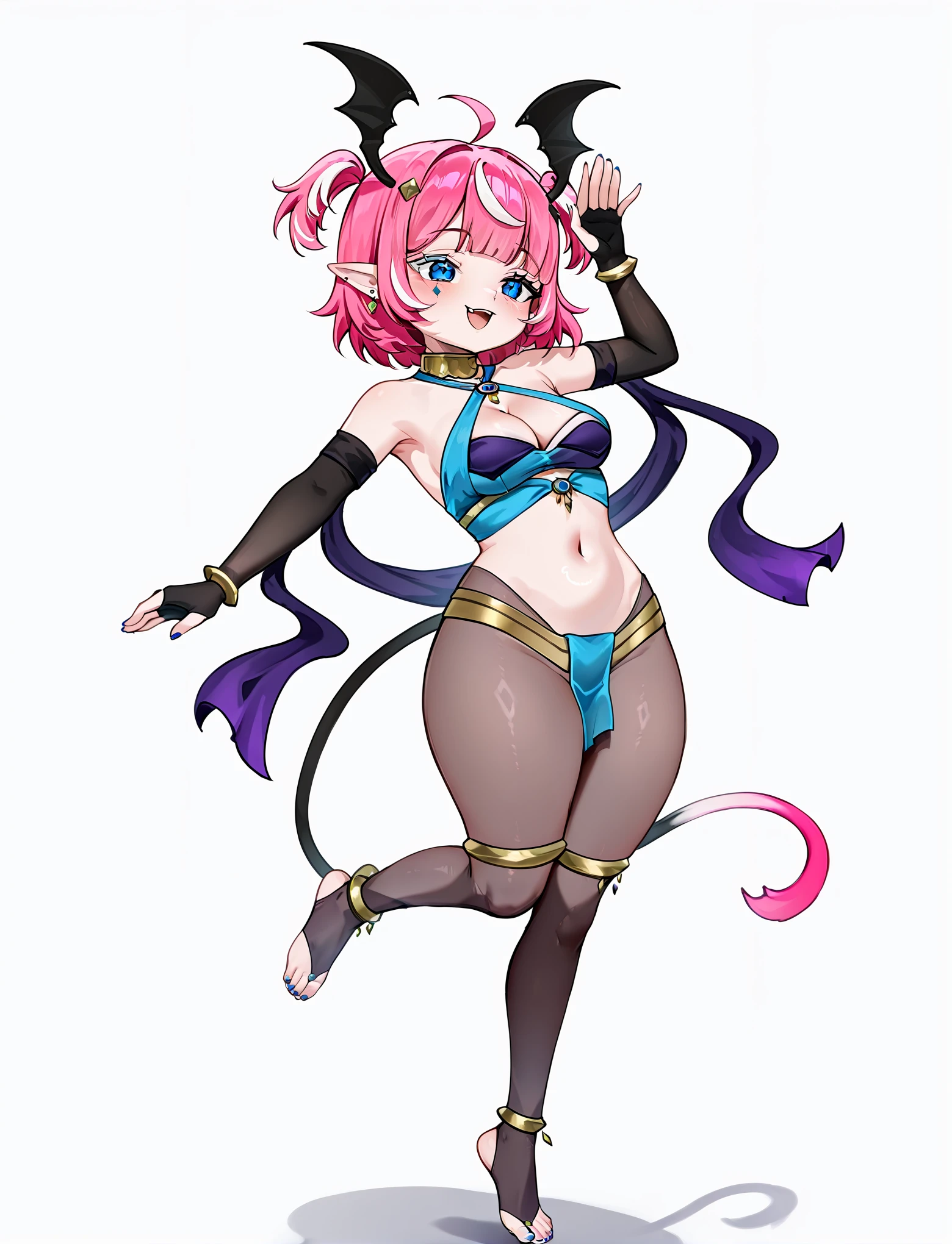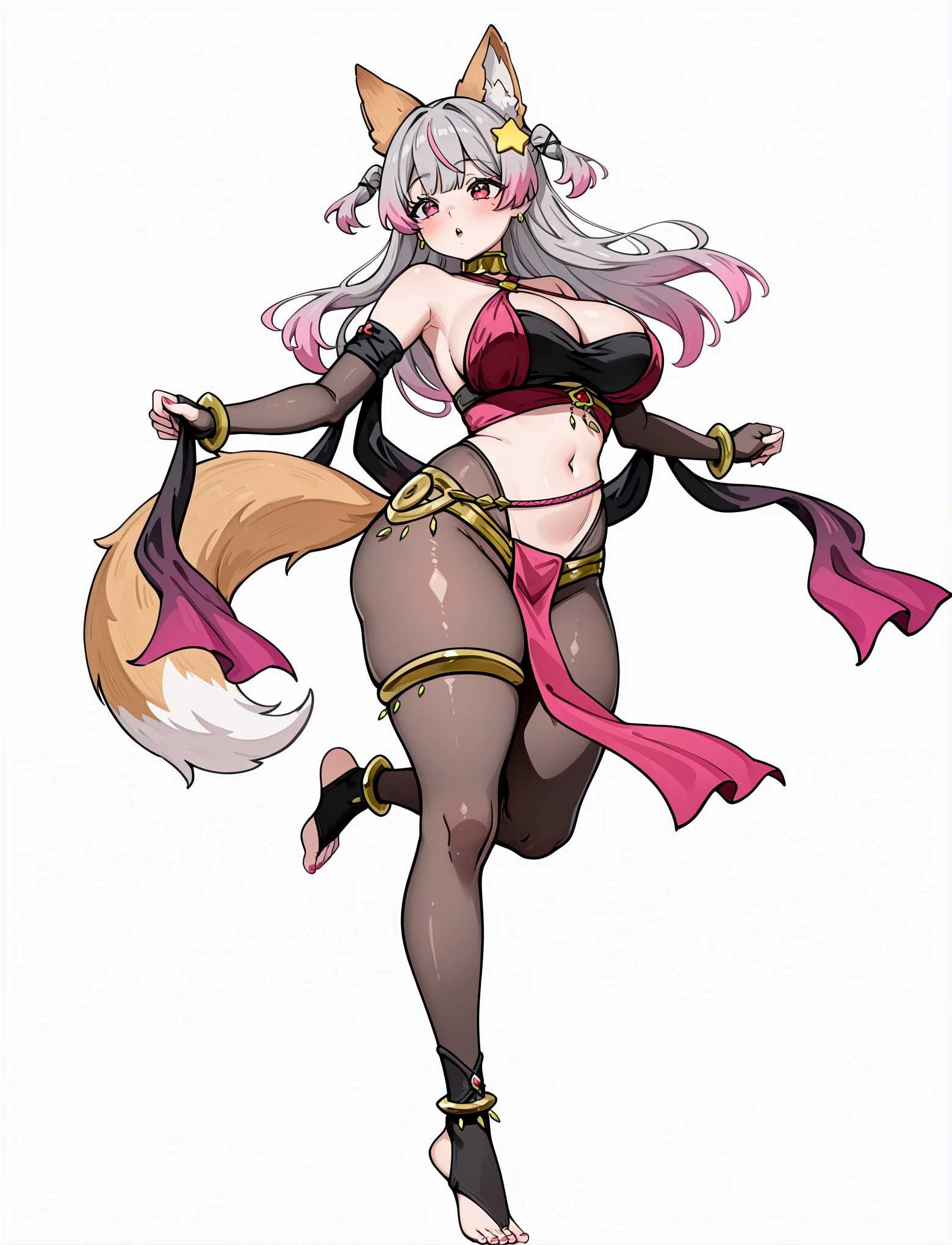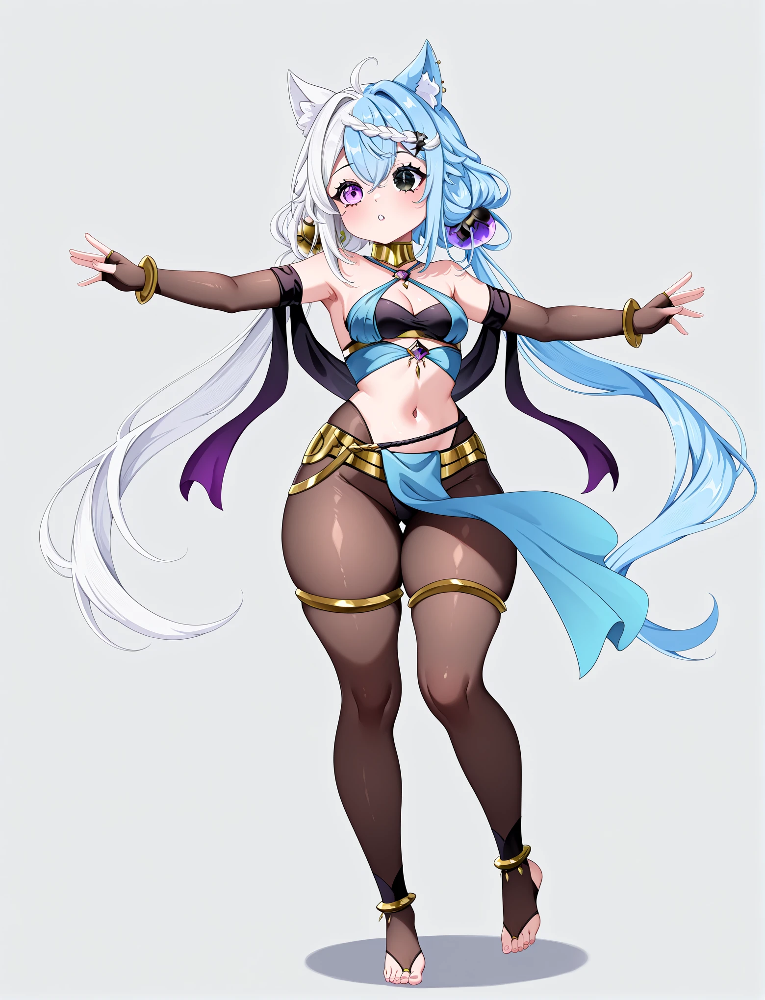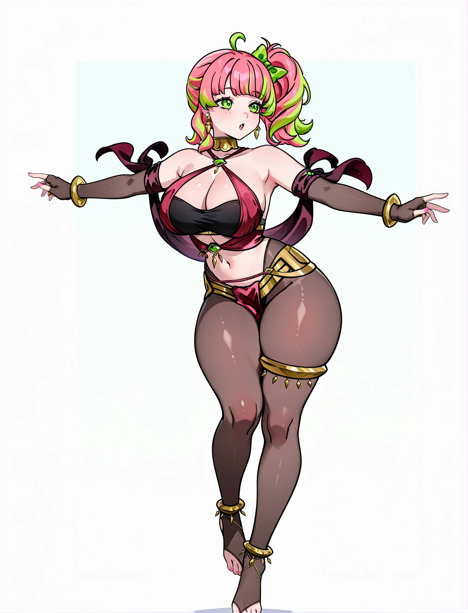 dancer, harem outfit, alternate costume, criss-cross halter, gold collar, gold bangles, bare shoulders, bracelet, cleavage, earrings, jewelry, navel, midriff, body jewelry, gold thighlets, see-through pantyhose, toeless pantyhose, loincloth, shawl, anklet, fingerless elbow gloves,