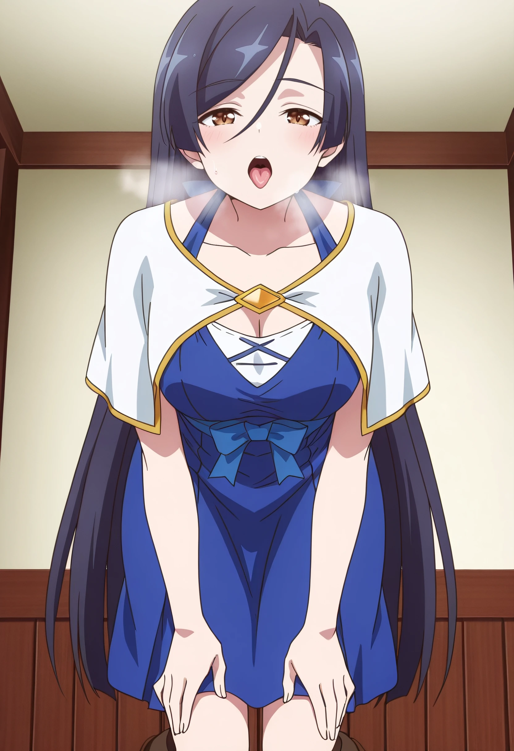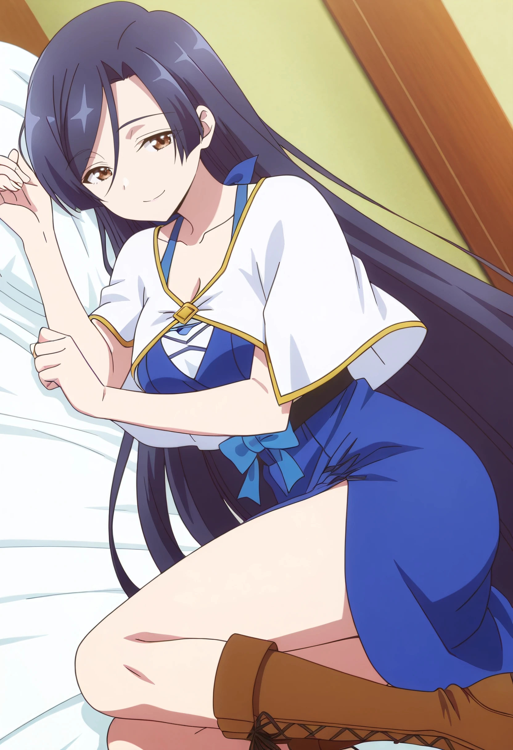 ShirleyDress, capelet, white capelet, dress, blue dress, cleavage, collarbone, straight hair, blue bow, boots, brown footwear,