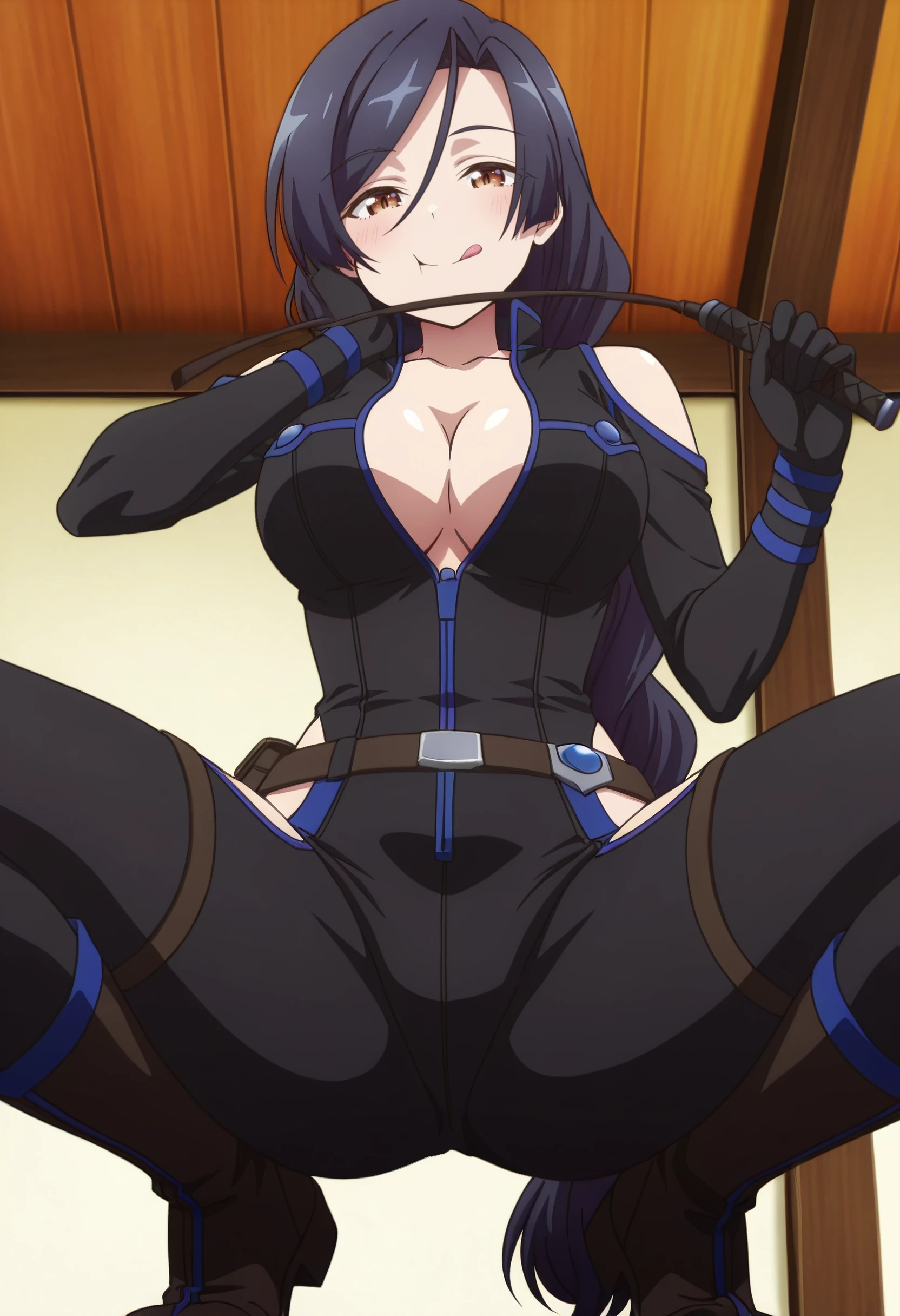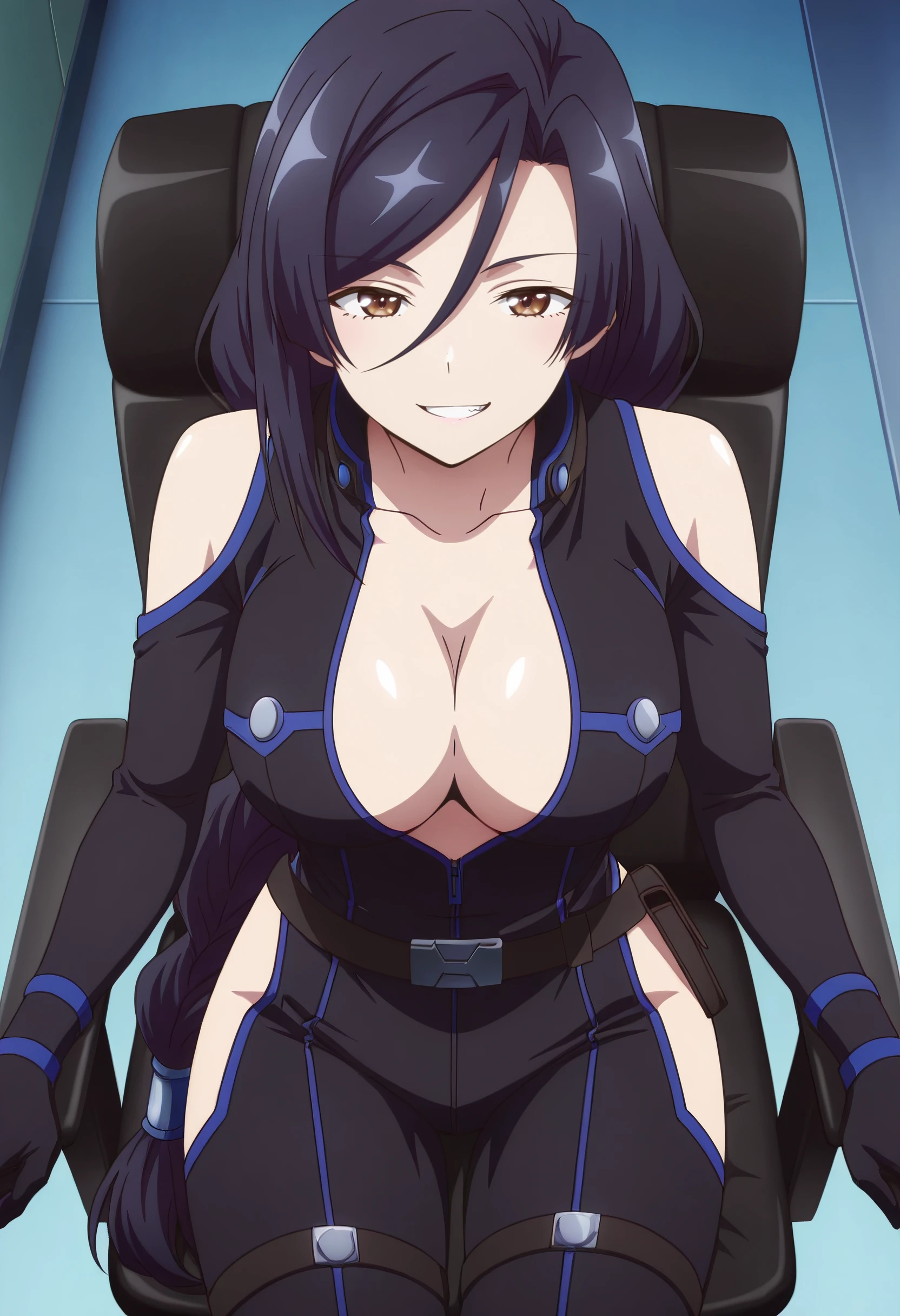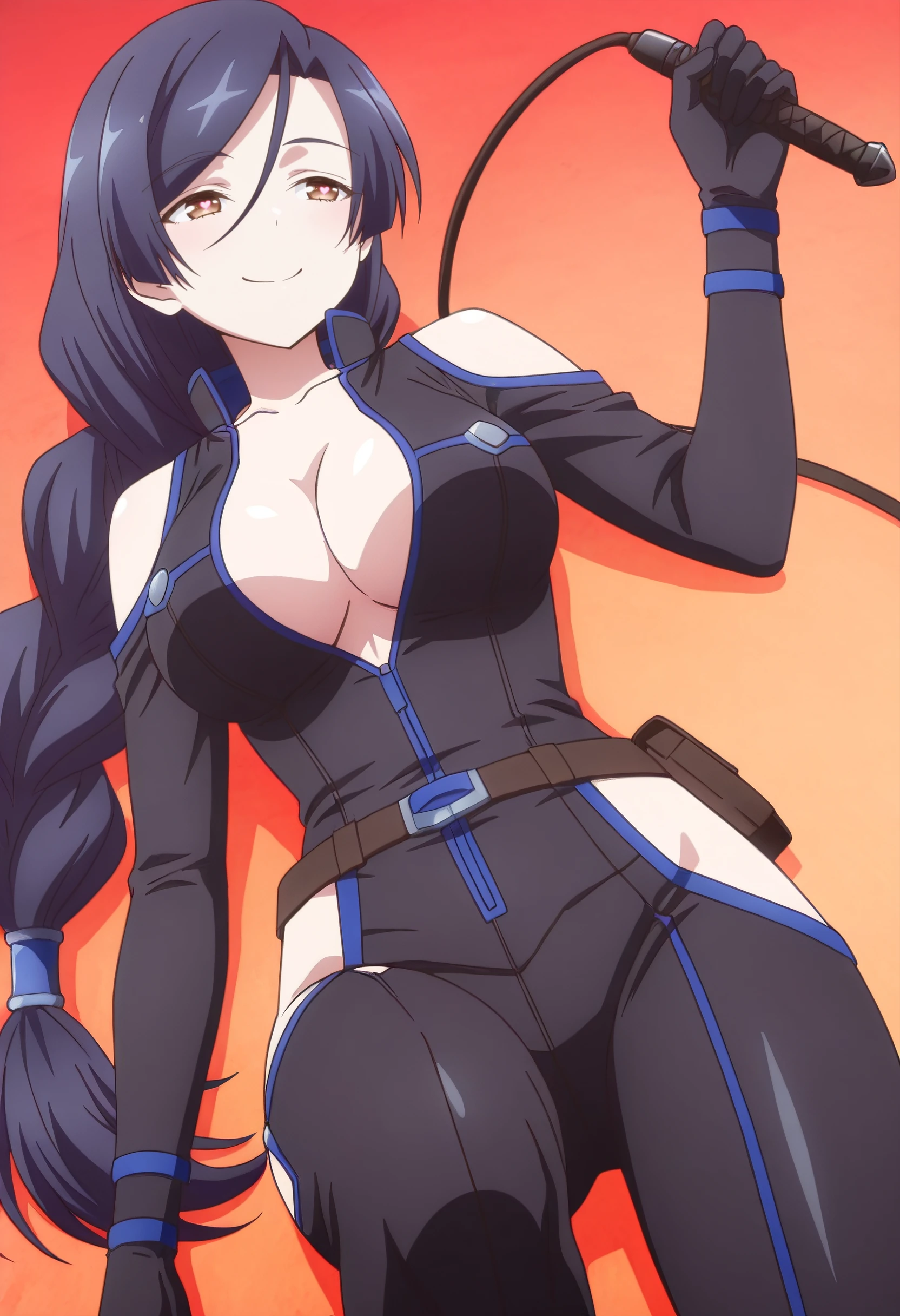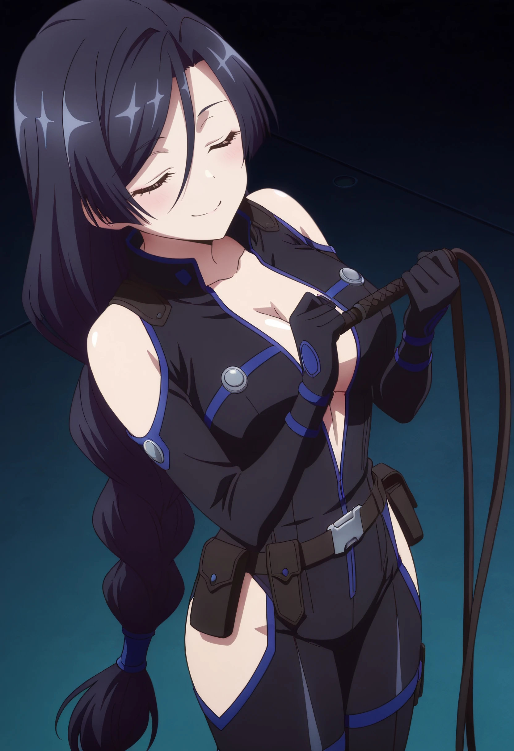 ShirleyBodysuit, shoulder cutout, bodysuit, clothing cutout, black bodysuit, hip vent, black gloves, boots, thigh cutout, gloves, braid, low-braided long hair, low-tied long hair, cleavage, single braid, belt, braided ponytail, pouch, bare shoulders, long braid, open bodysuit, sleeveless, elbow gloves, center opening,