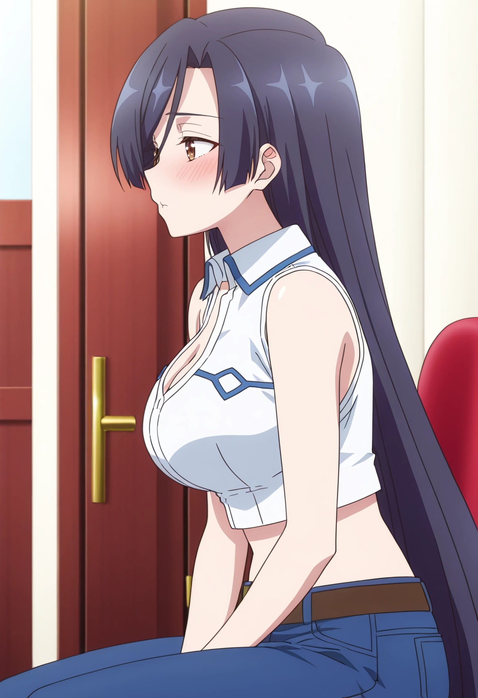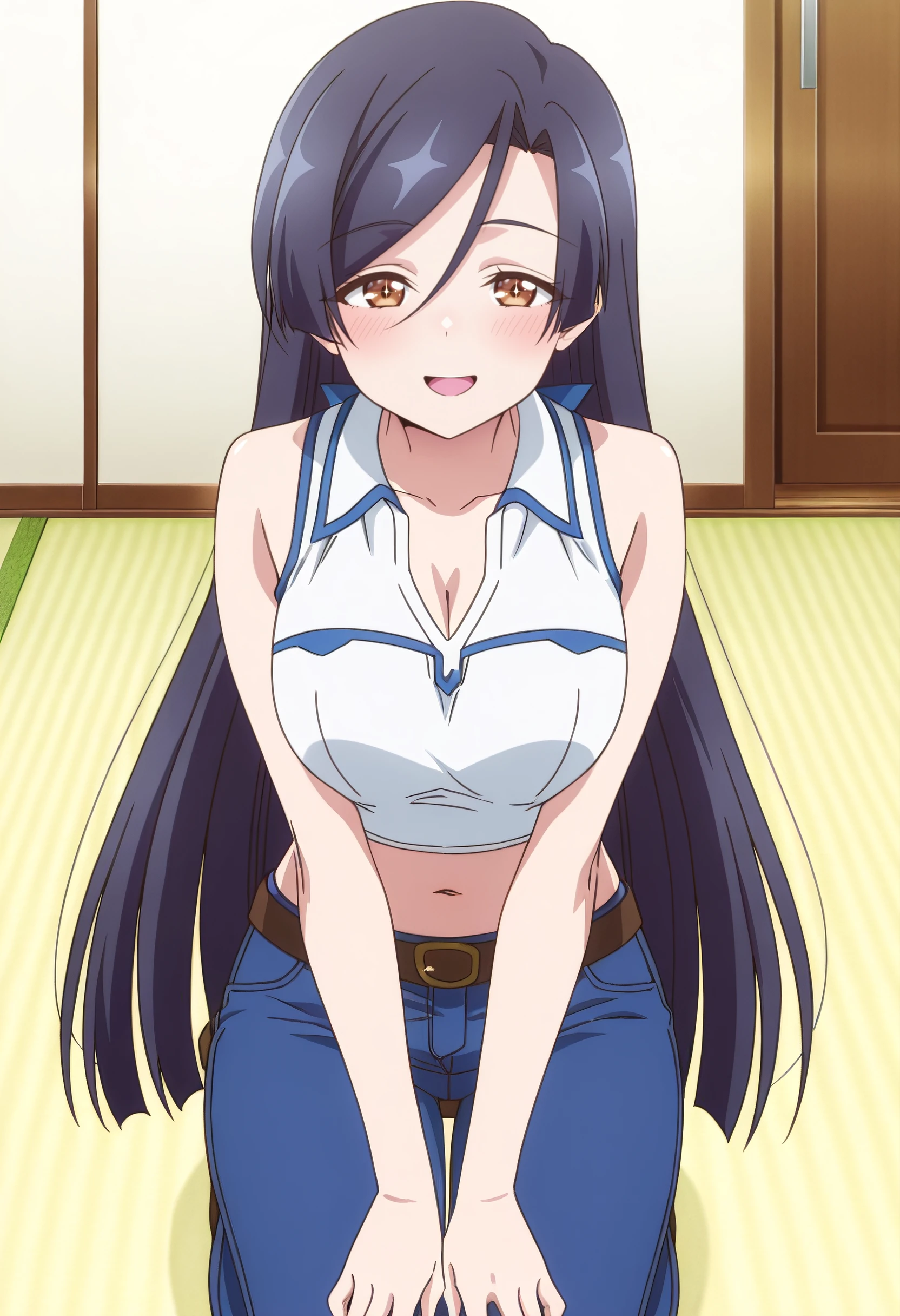 ShirleyShirt, cleavage, sleeveless, sleeveless shirt, shirt, white shirt, straight hair, collared shirt, crop top, midriff, pants, jeans, denim, bare shoulders, cropped shirt, bare arms,