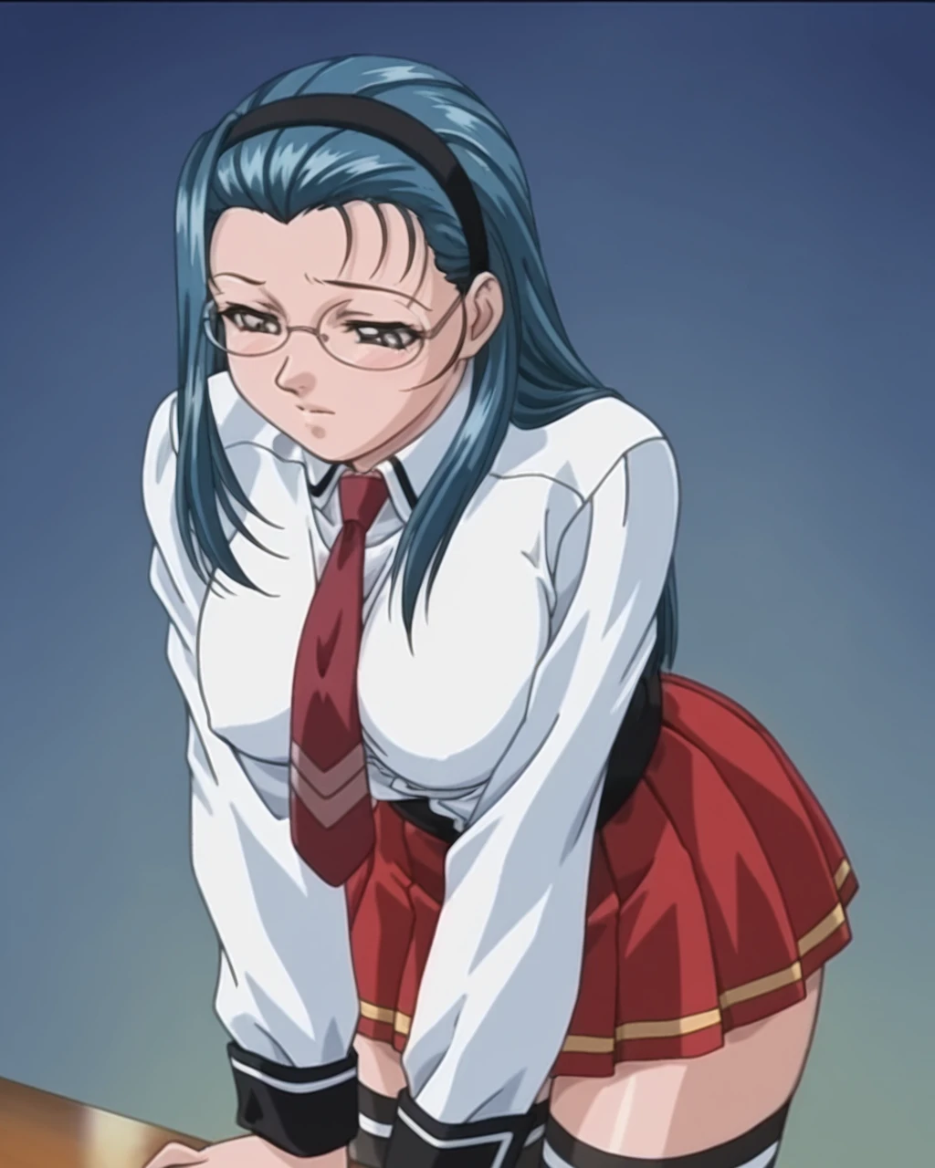 Junko Mochida, junko, dark blue hair, hairband, long hair, gray eyes, glasses, , 1girl, solo, retro artstyle, 1990s (style)
