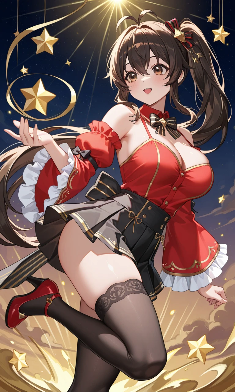 skirt, shirt, thighhighs, long_sleeves, bow, cleavage, bare_shoulders, pleated_skirt, frills, detached_sleeves, striped, black_thighhighs, miniskirt, wide_sleeves, bowtie, black_skirt, star_\(symbol\), high_heels, zettai_ryouiki, black_bow, detached_collar, frilled_sleeves, red_footwear, red_shirt, gold_trim, striped_bow, black_bowtie, back_bow, striped_bowtie, red_sleeves