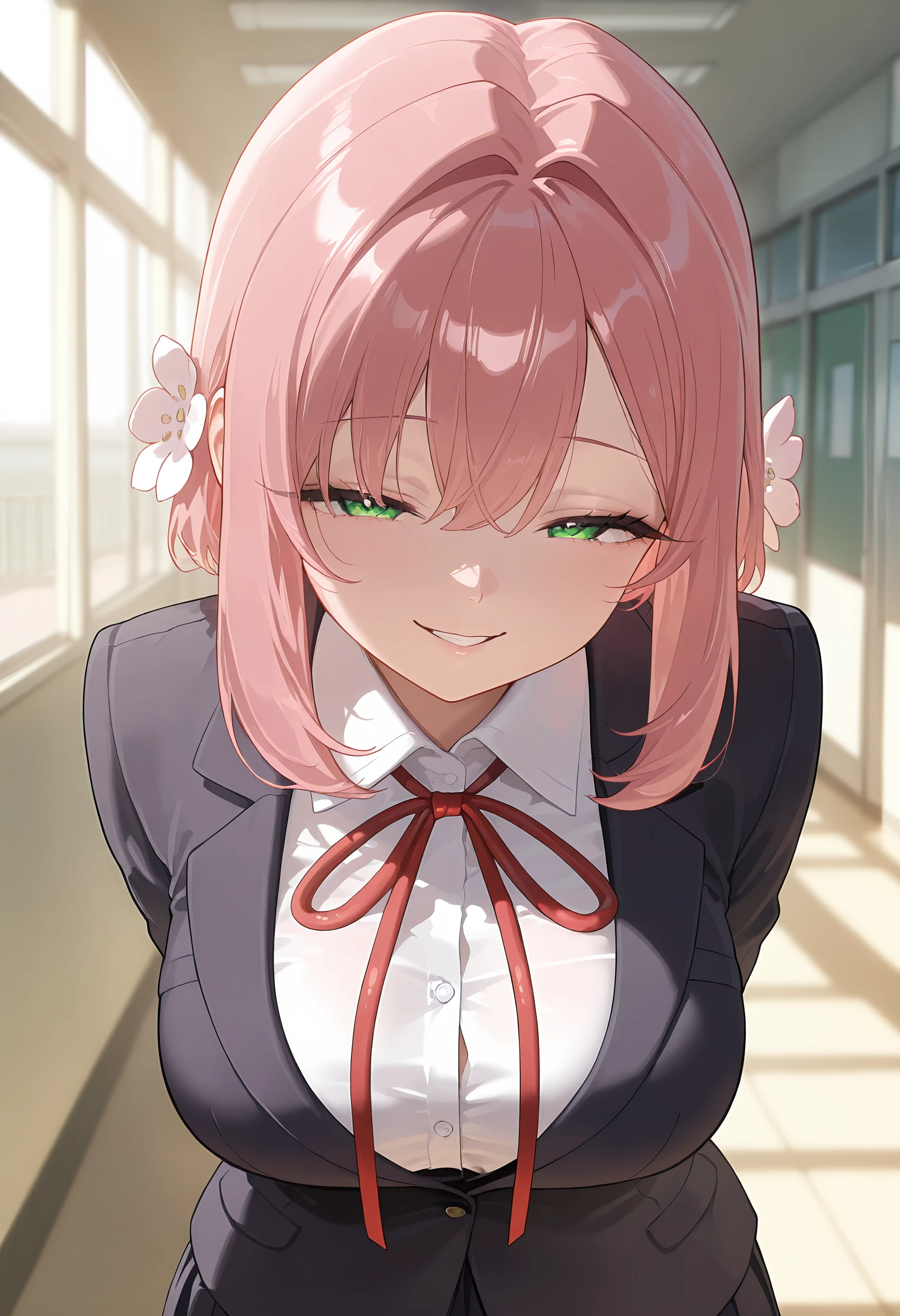 1girl, solo, long hair, large breasts, green eyes, pink hair, hair intakes, thick thighs, hair flower, medium hair