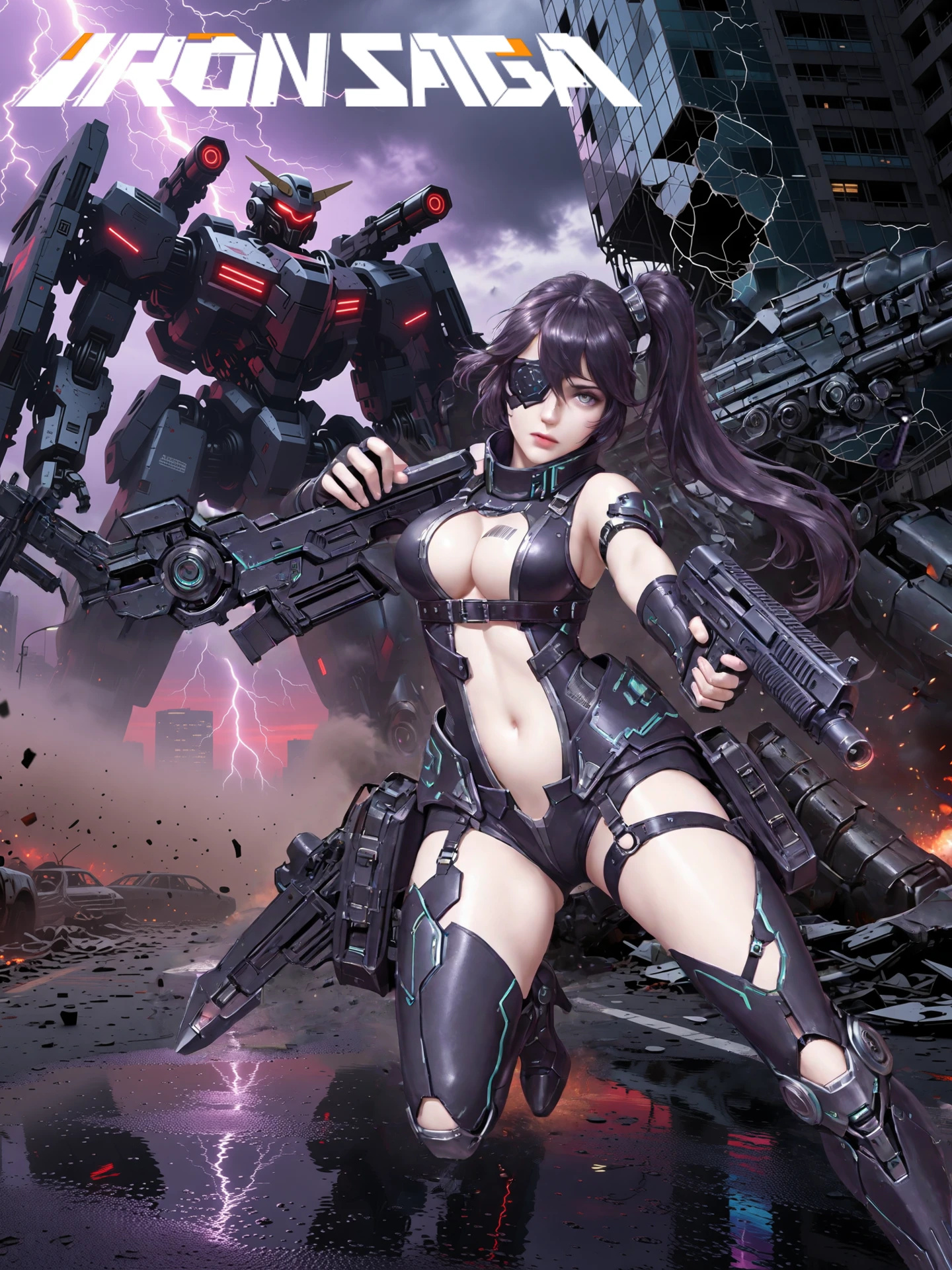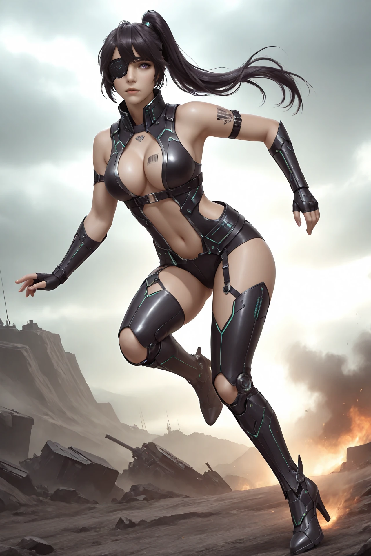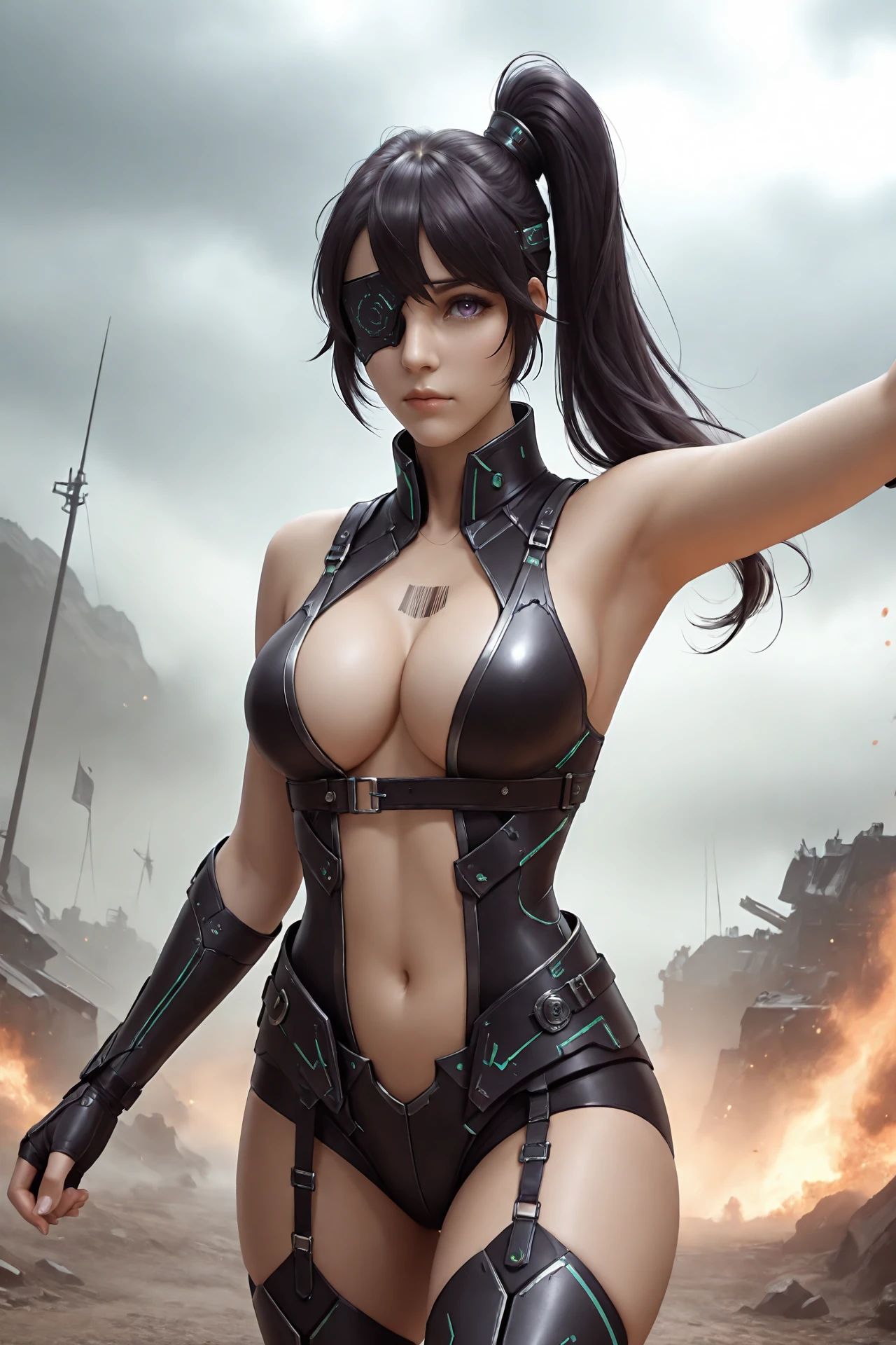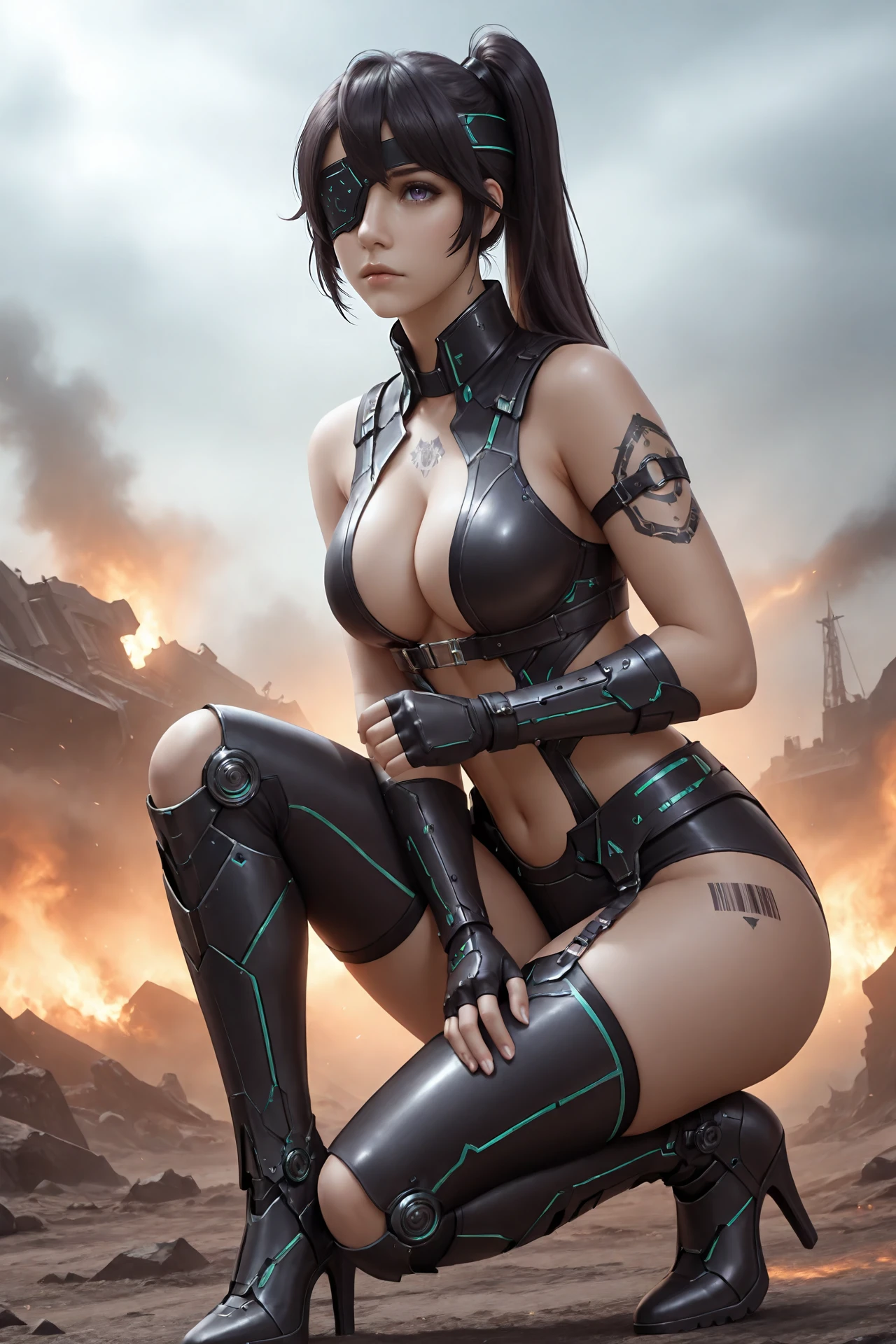 side_ponytail,eyepatch,bangs, large_breasts,barcode_tattoo,navel,center_opening,high_collar,mechanical_trim,bare_shoulders, ,belt_buckle,gauntlets,arm_belt,fingerless_gloves,waist_armor,belt,garter_belt,thighhighs, knee_boots,mechanical_boots,high_heels,