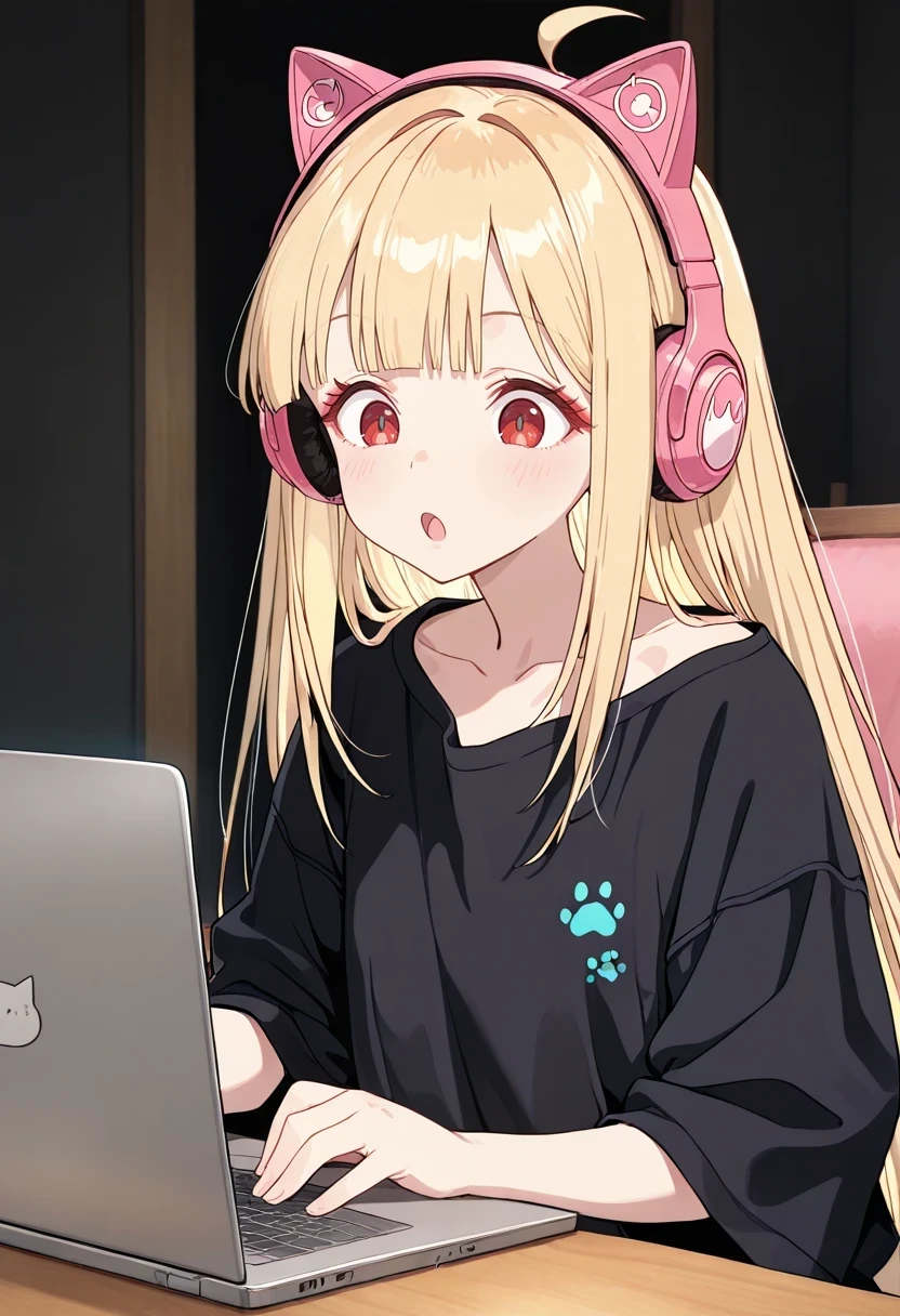 blonde hair,blunt bangs,red eyes,ahoge,straight hair,black shirt,oversized clothes,Description