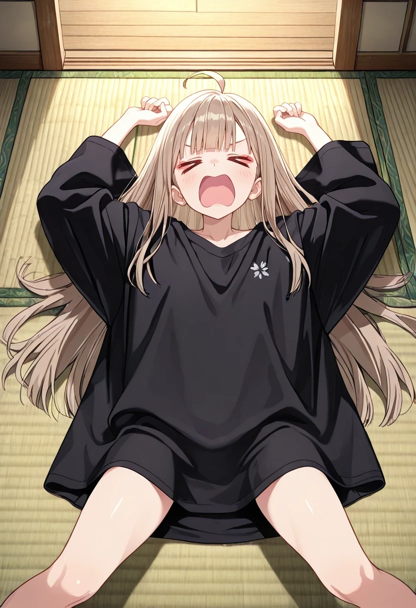 light brown hair,blunt bangs,red eyes,ahoge,straight hair,black shirt,oversized clothes,