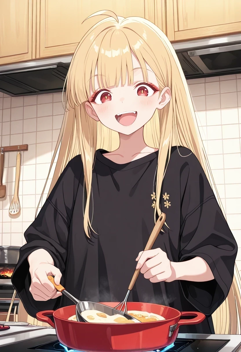 blonde hair,blunt bangs,red eyes,ahoge,straight hair,black shirt,oversized clothes,