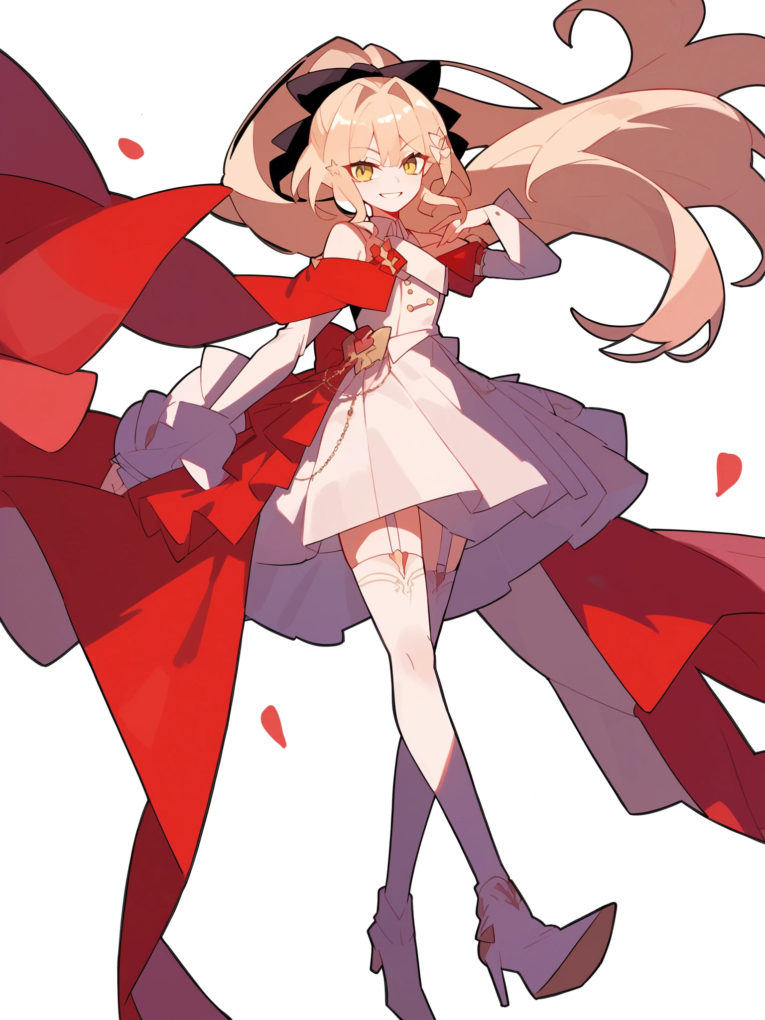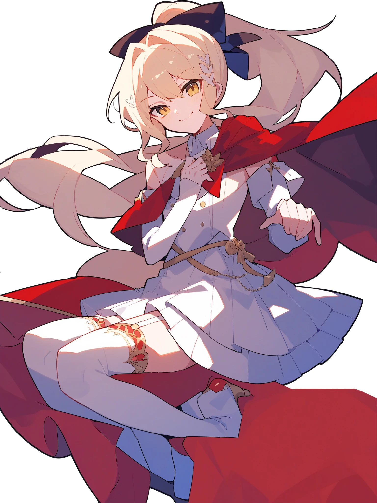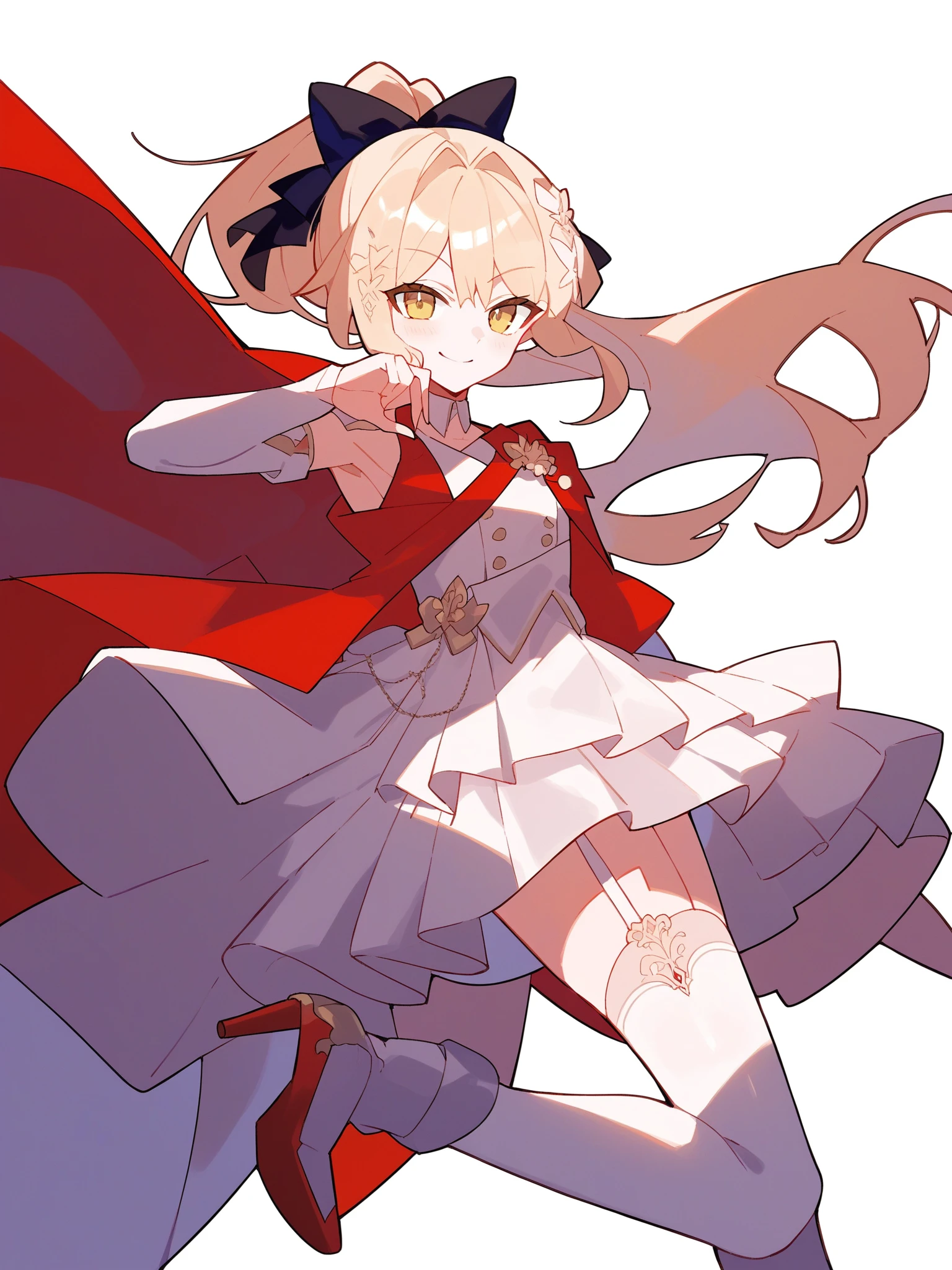 服装tag:white skirt,Red Cape,red dress,high heels,thighhighs,ponytail,garter straps,white thighhighs,bow,dress,boots,detached sleeves,