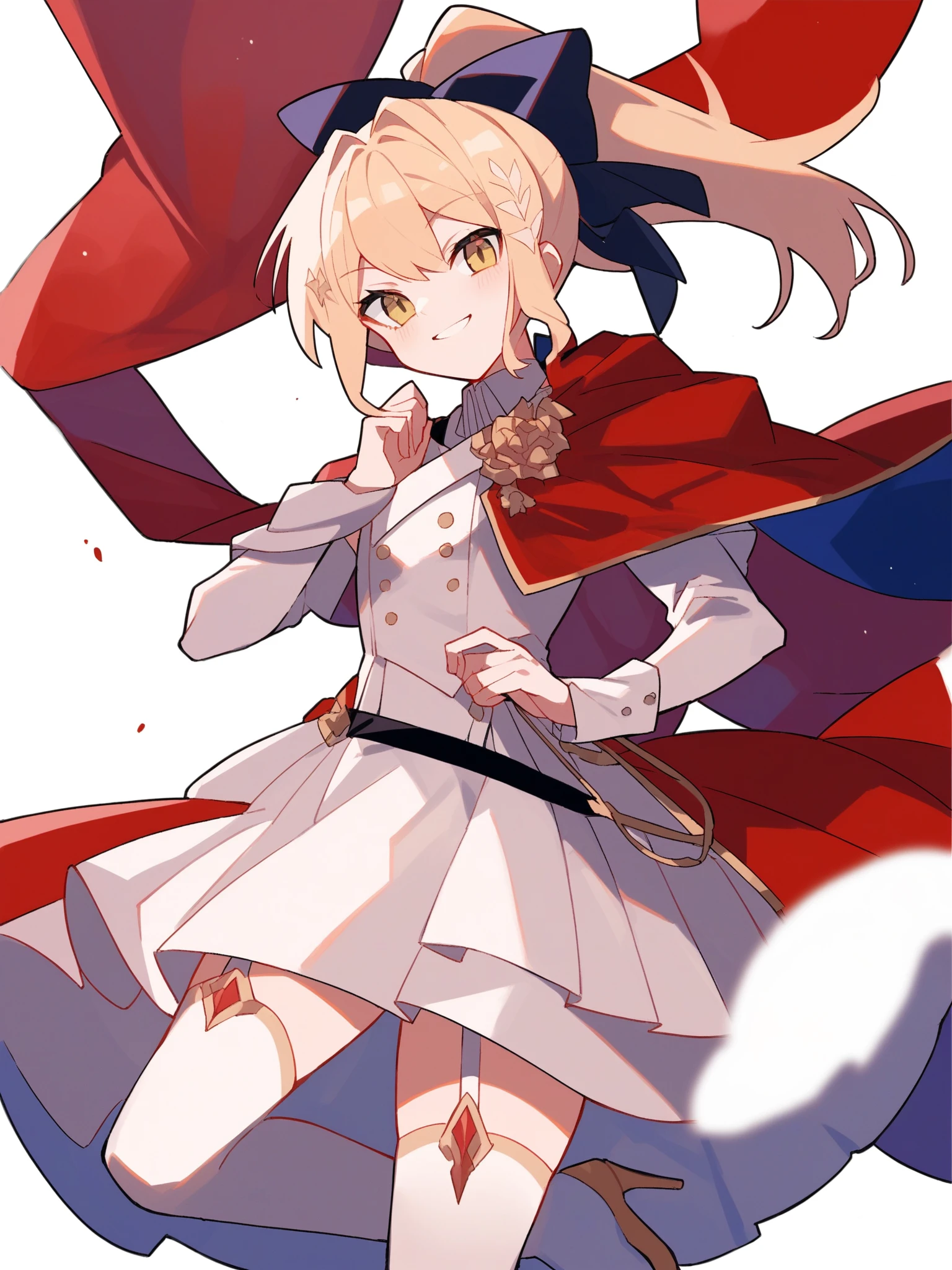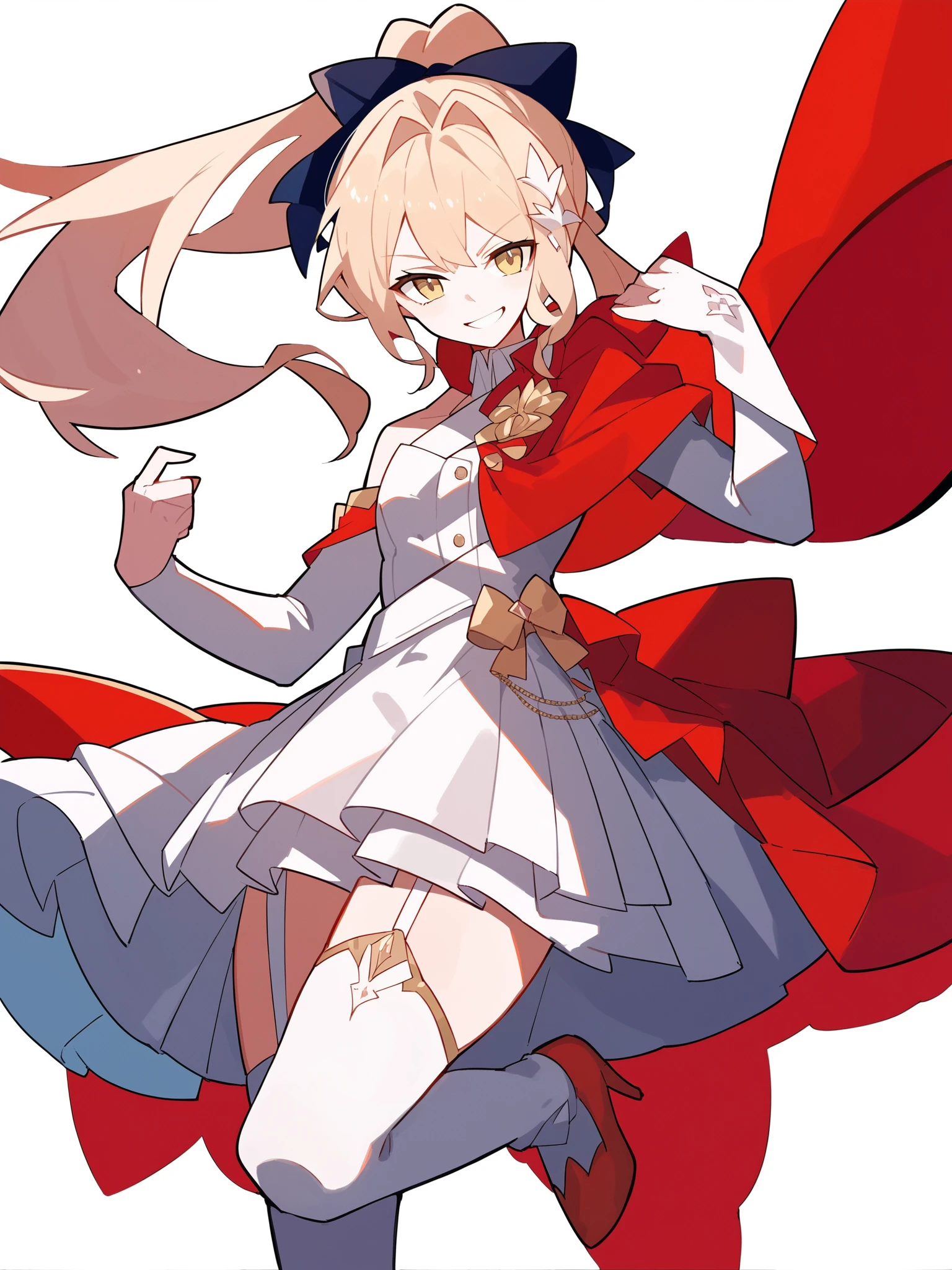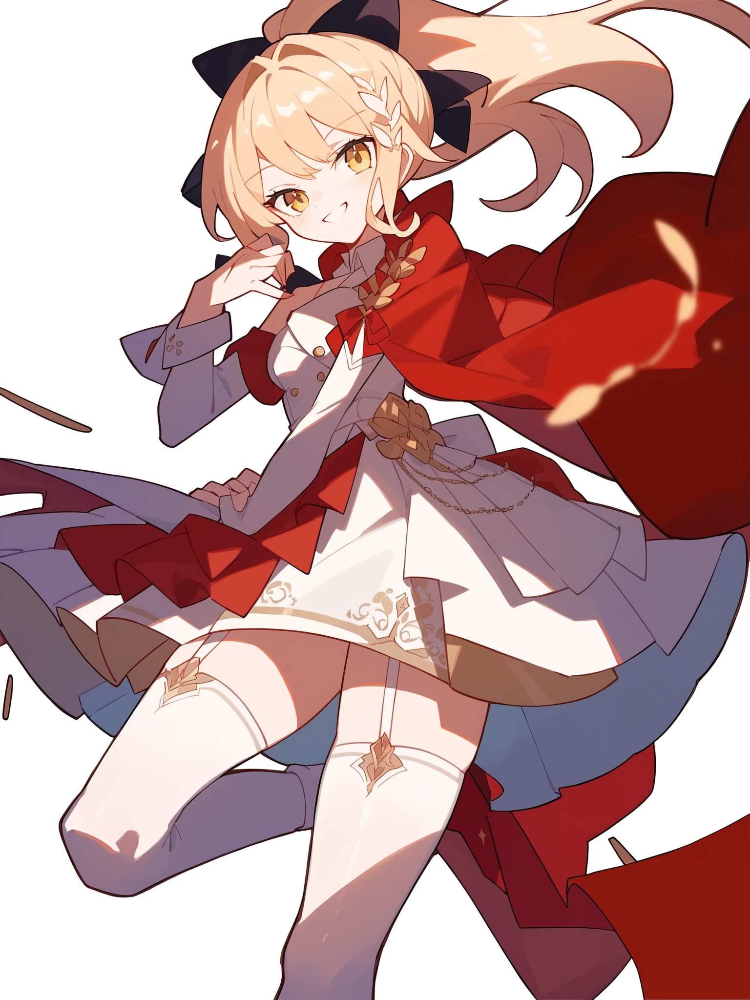 服装tag:white skirt,Red Cape,red dress,high heels,thighhighs,ponytail,garter straps,white thighhighs,bow,dress,boots,detached sleeves,