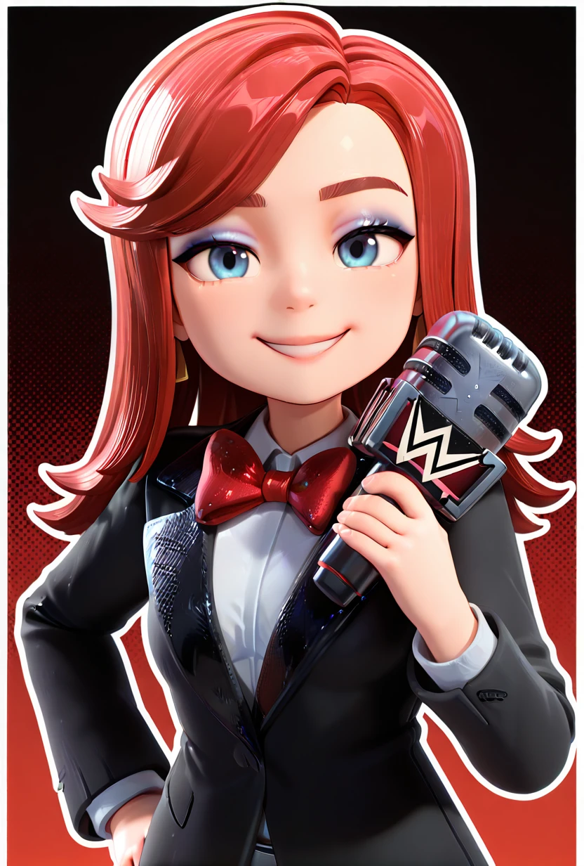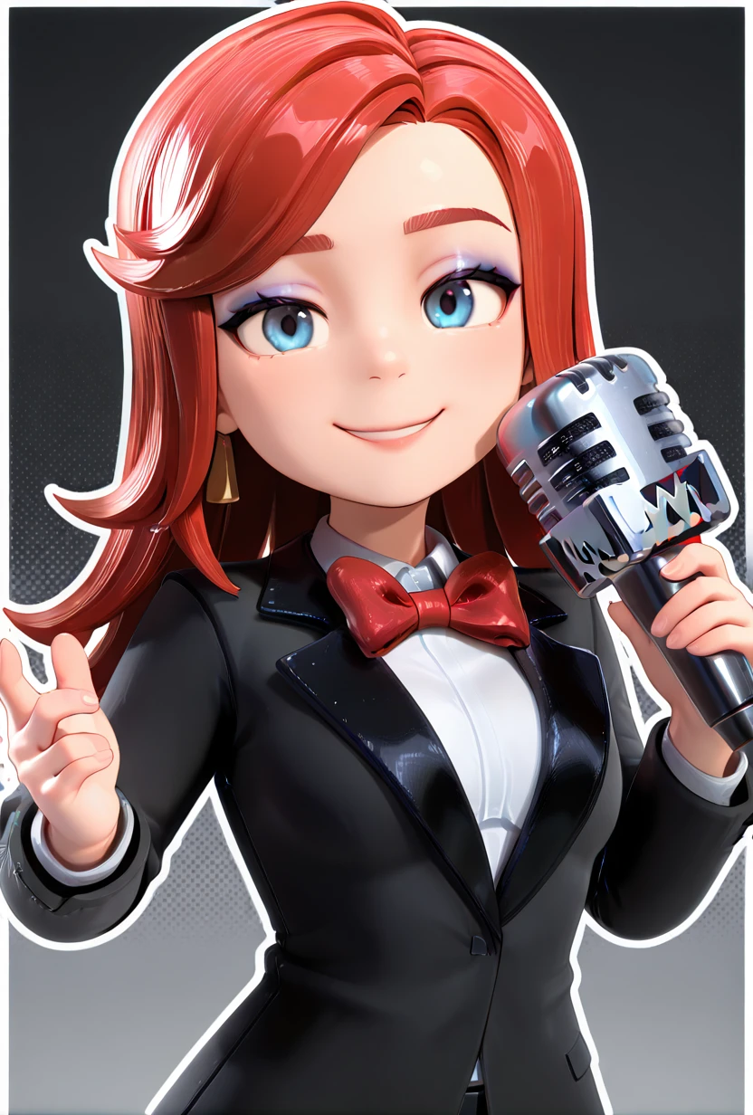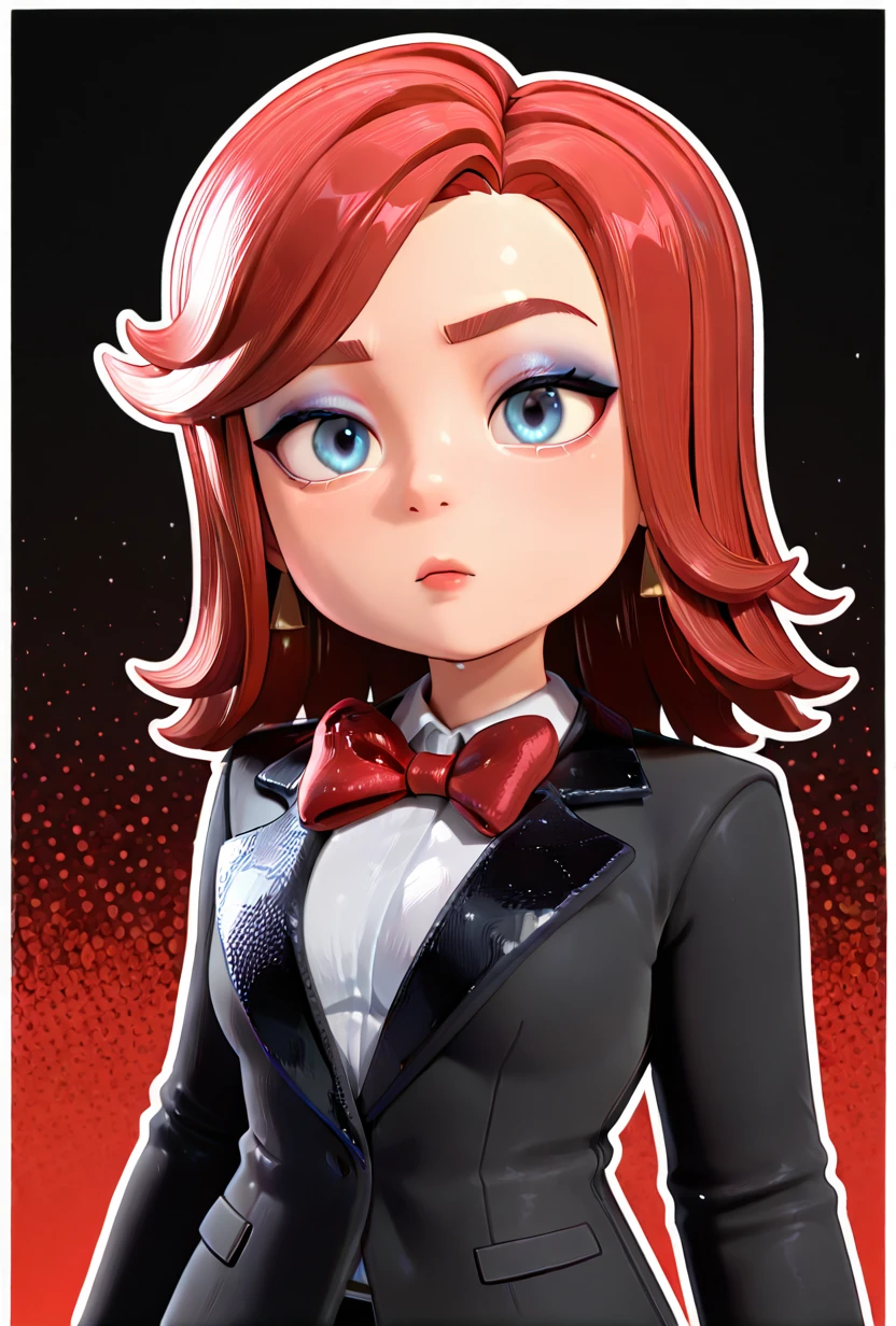 wwevillager, 1girl, solo, blue eyes, shirt, long sleeves, red bowtie, black jacket, red hair, makeup, eyeshadow, formal, 3d,