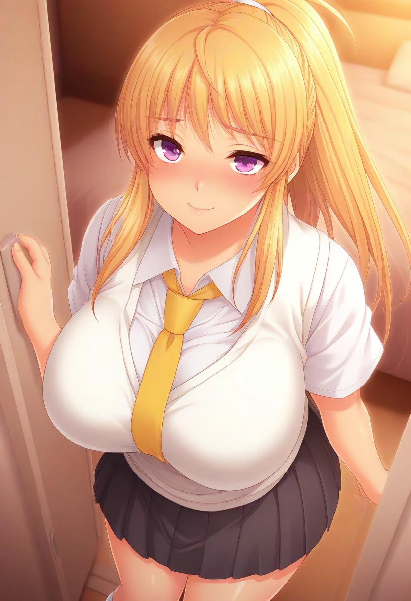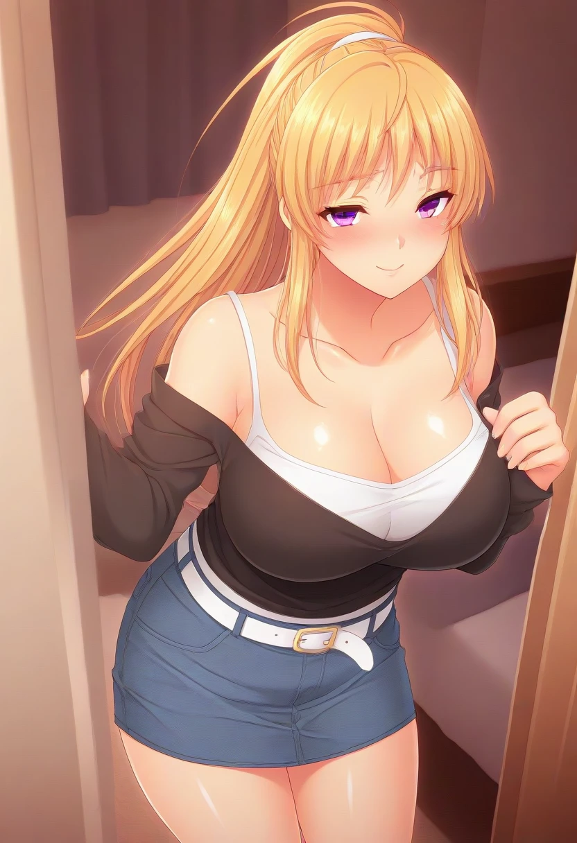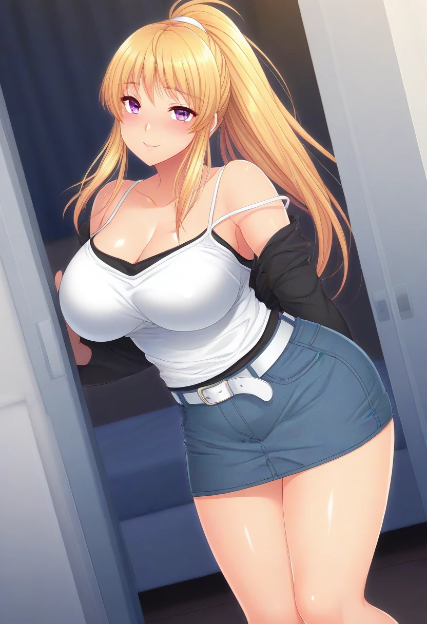 Recommend Prompt:Natsuki Mamiya, violet eyes, blonde hair, long hair, ponytail, hair ornament,