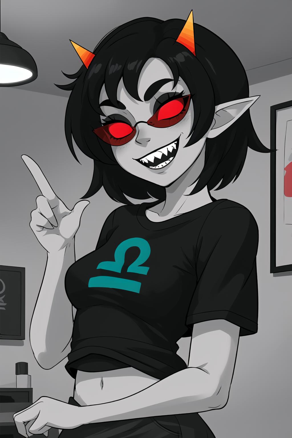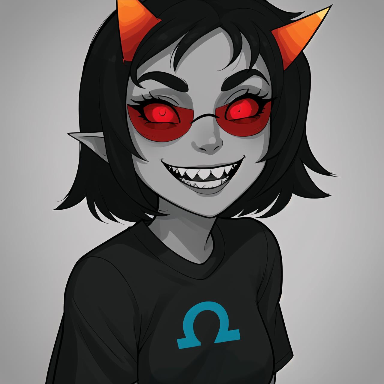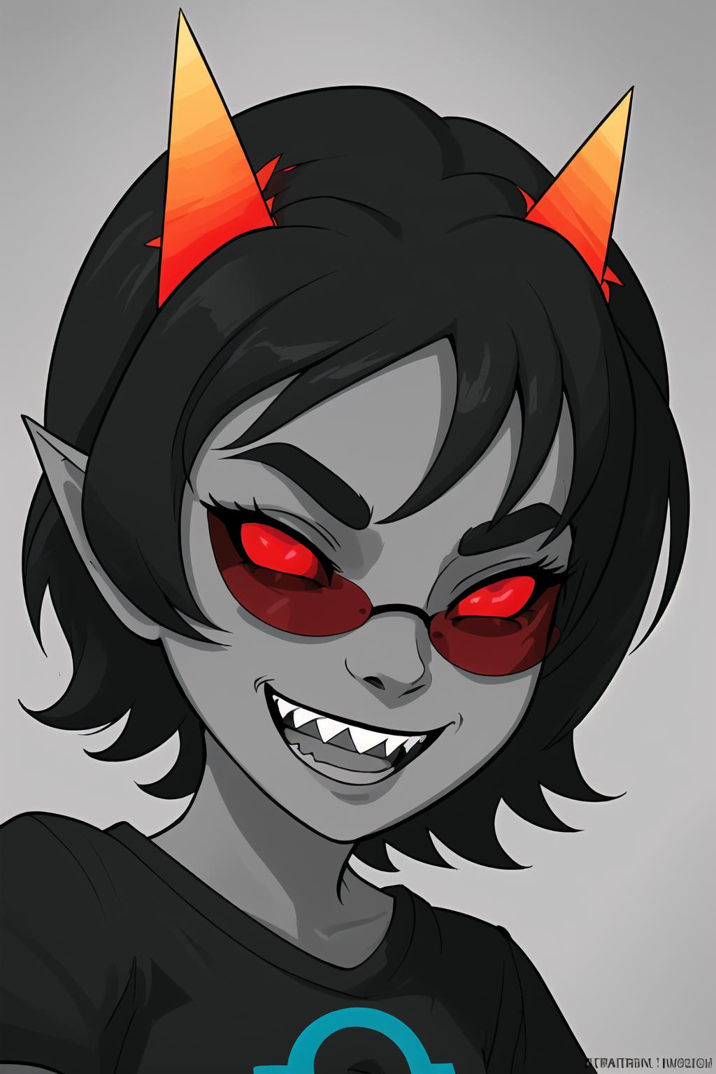 Main prompts: 1girl, horns, colored skin, solo, black hair, grey skin, smile, glasses, sharp teeth, fangs, sunglasses, re-tinted eyewear, colored sclera, shirt, grin, red eyes, black shirt, t-shirt